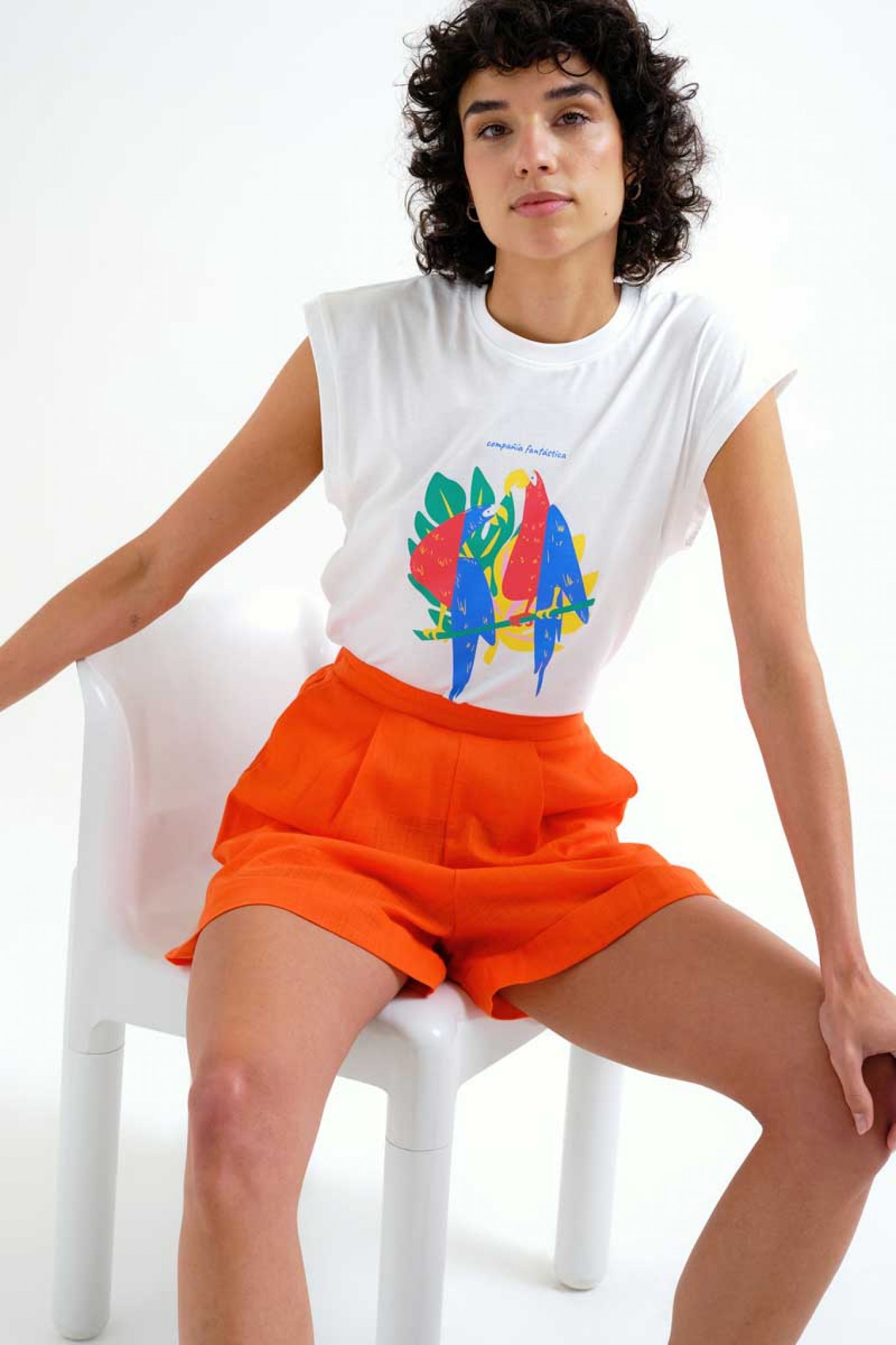 Orange shorts made from 100% cotton. High-waisted elasticated waistband. Straight leg. Lined. The model is 175 cm tall and wears size S/10