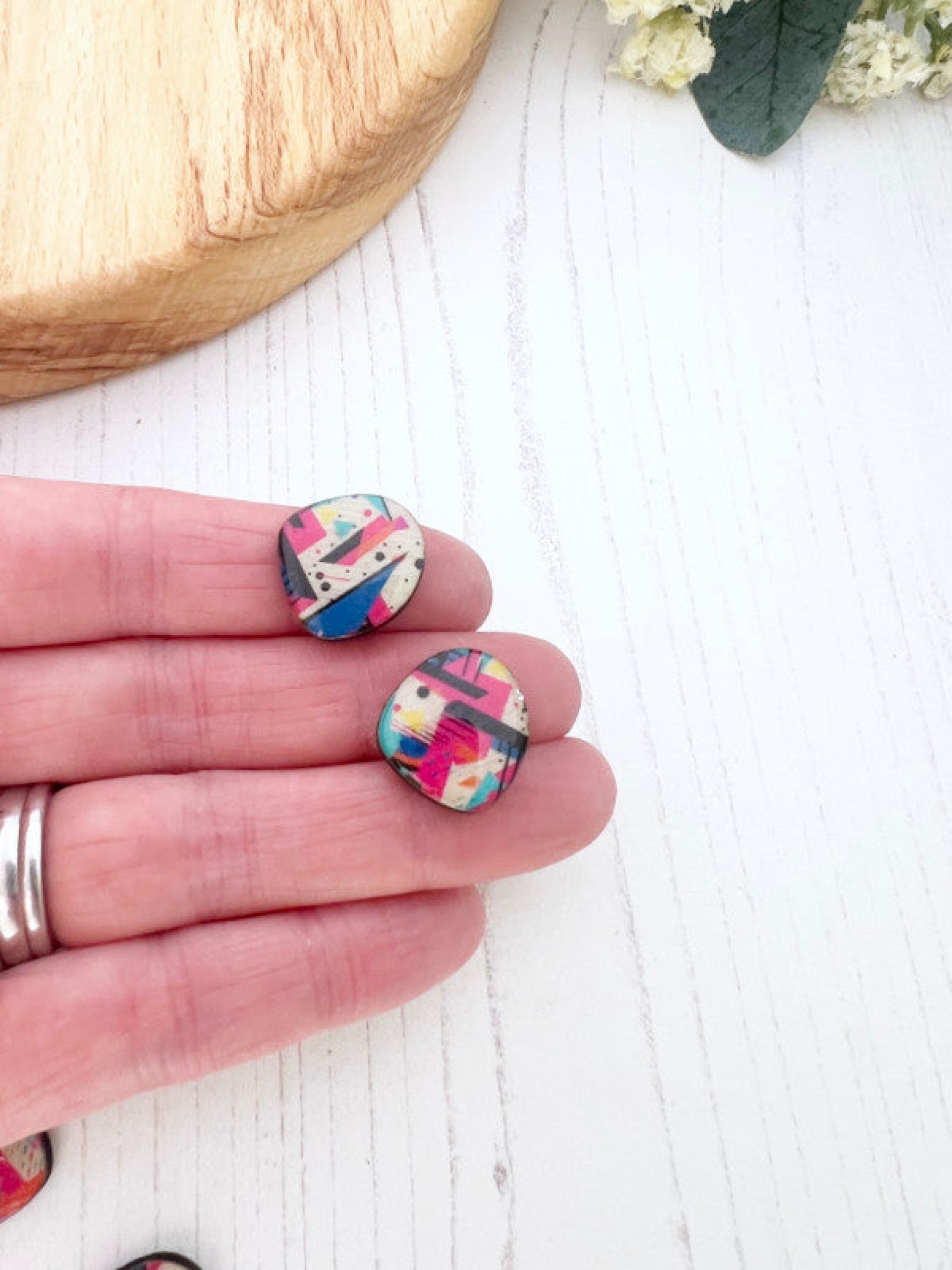 These stud earrings are made from birch ply and this quirky design has been digitally printed directly onto the sheet and in turn laser cut into quirky pebble shaped studs.