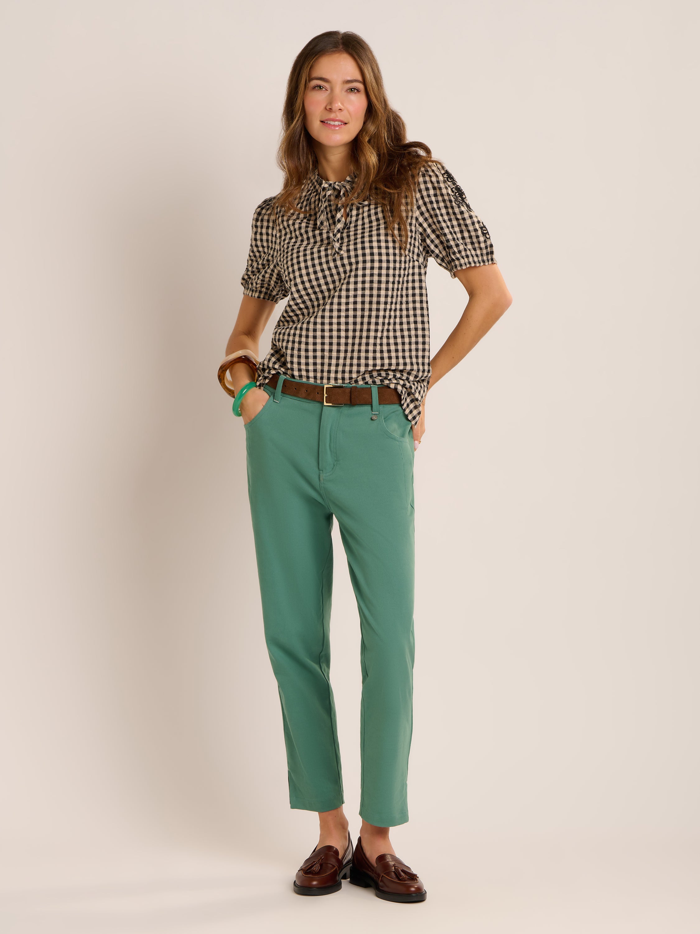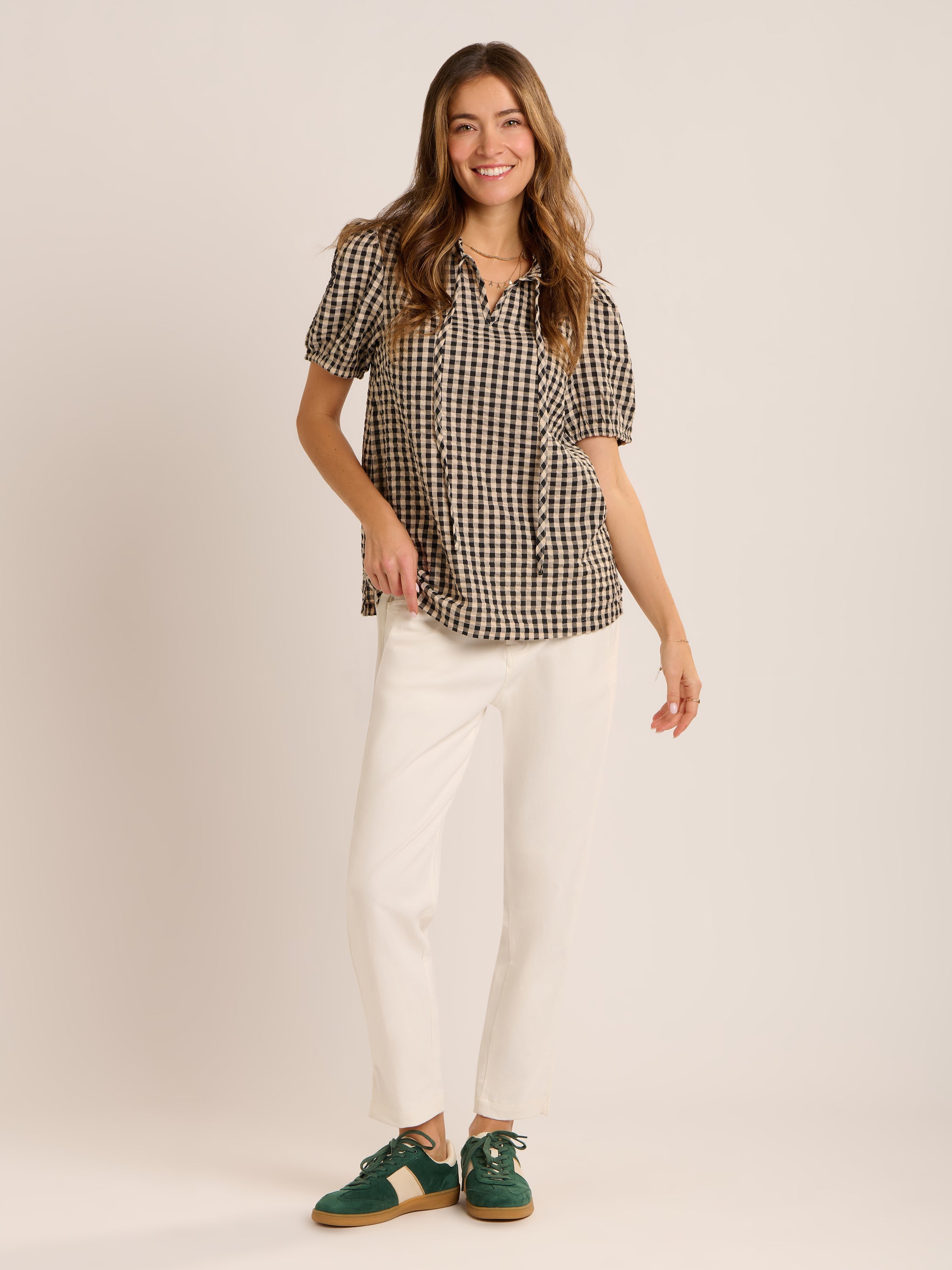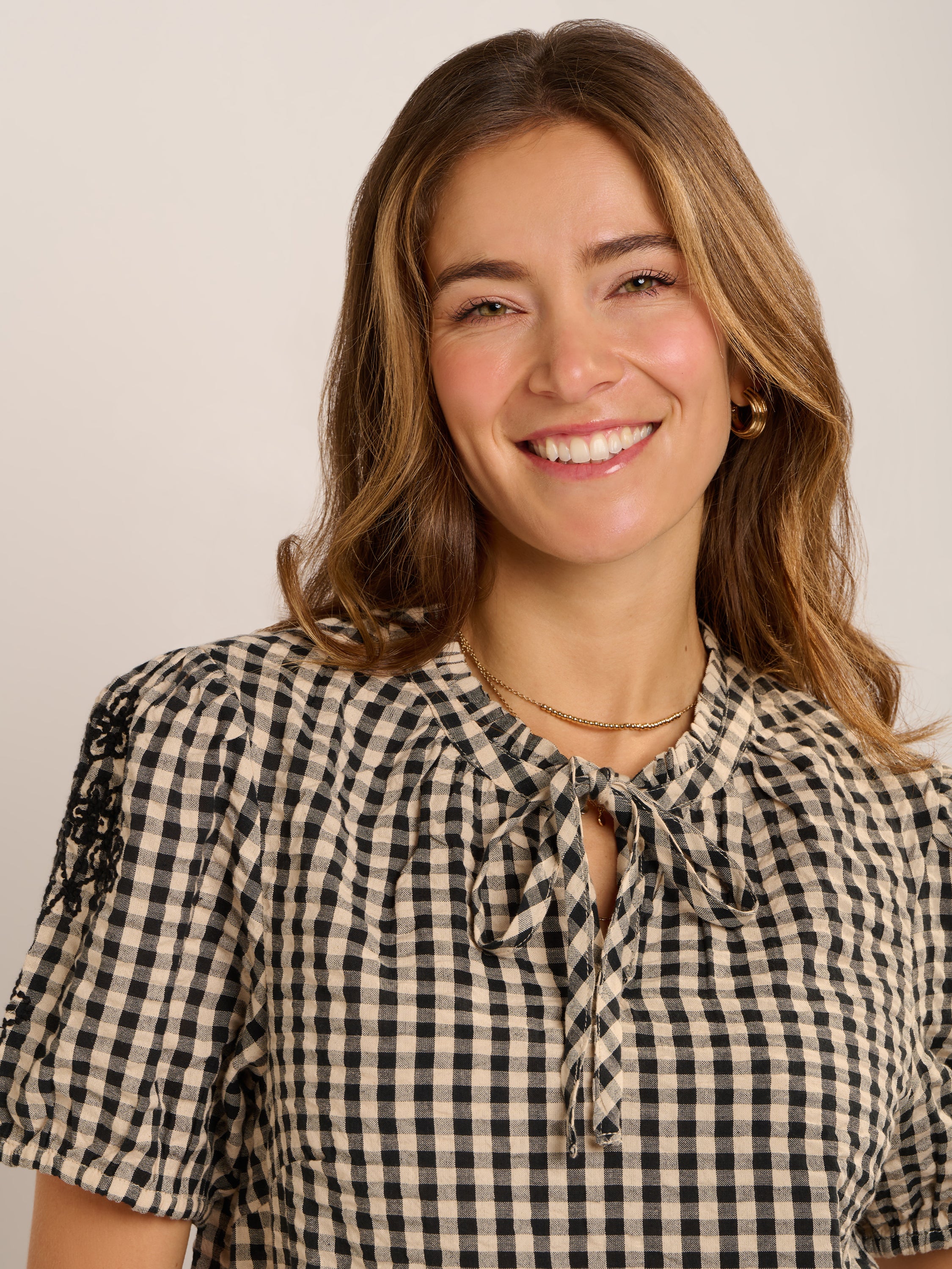 Our black and cream Maria Gingham Blouse has a relaxed, boho feel that’s easy to wear and easy to style. Designed with a loose fit, it features a soft notch neckline with tie and delicate floral embroidery on the sleeves for a thoughtful finish. A versatile piece that works just as well dressed up as it does worn casually.