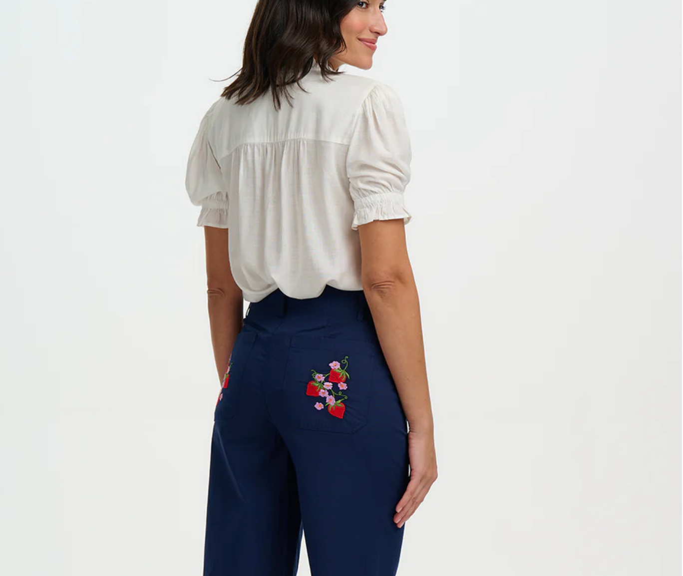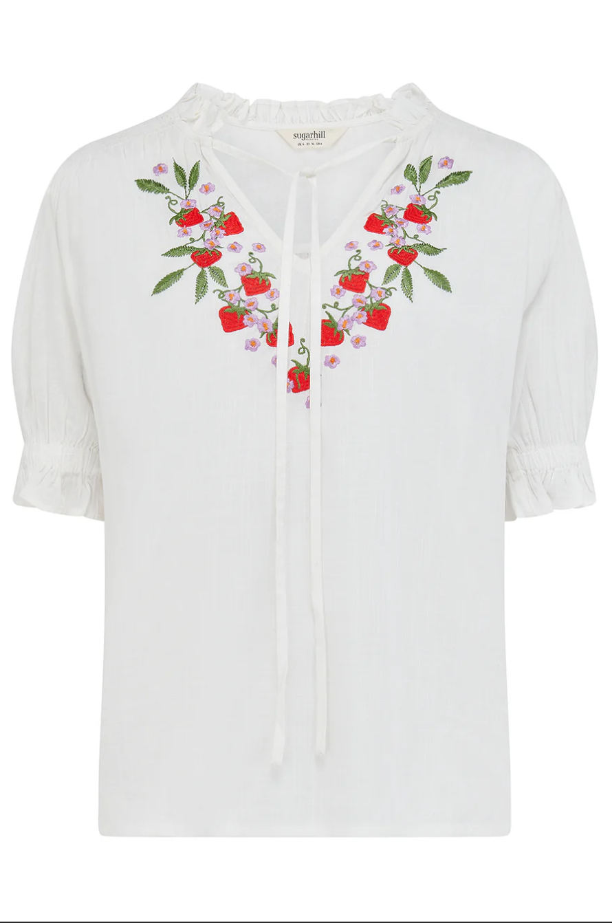 The Angelique Blouse is a versatile summer staple, perfect for both workdays and weekends. Crafted from lightweight fabric, it features delicate shirring at the shoulders, short sleeves with shirred frill cuffs, and a pretty frill collar with tie detailing. The flattering V-neckline is adorned with intricate floral embroidery in vibrant hues, adding a feminine touch to the elegant black white. Effortlessly stylish, this blouse pairs beautifully with denim for casual days or tailored trousers for a polished office look.