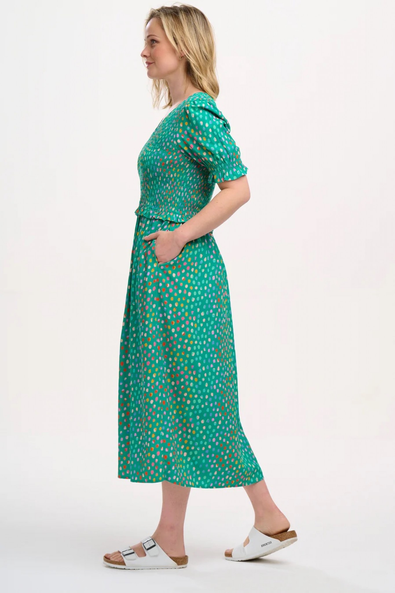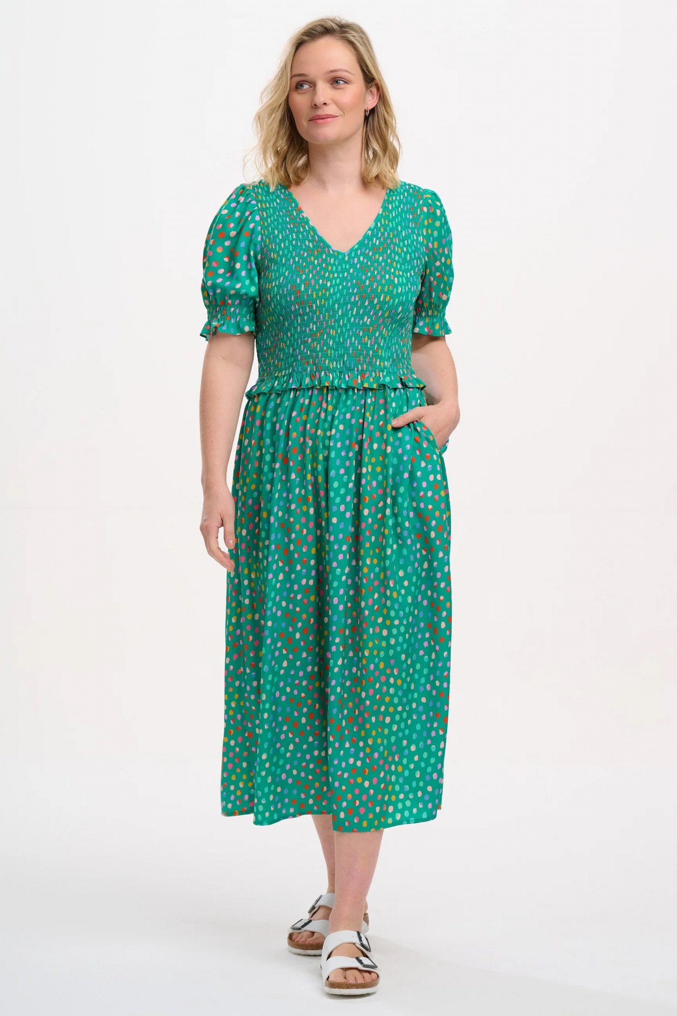 Bettina Midi Shirred Dress - Green, Rainbow Pebbles by Sugarhill