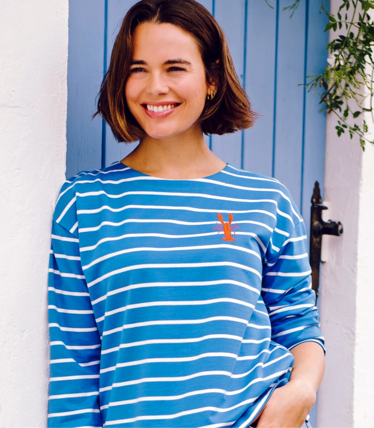 Sail into effortless style with the Billie Breton Top, crafted from soft 100% Organic Cotton for all-day comfort. Inspired by our bestselling Brighton Breton, this updated design features a boxy, relaxed fit and classic nautical thin white stripes on a fresh cornflower blue base. A charming embroidered lobster motif adds a playful coastal touch, making it the perfect piece for laid-back weekends, seaside strolls, or casual everyday wear.