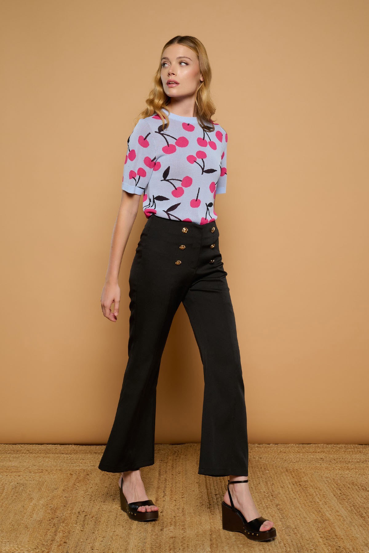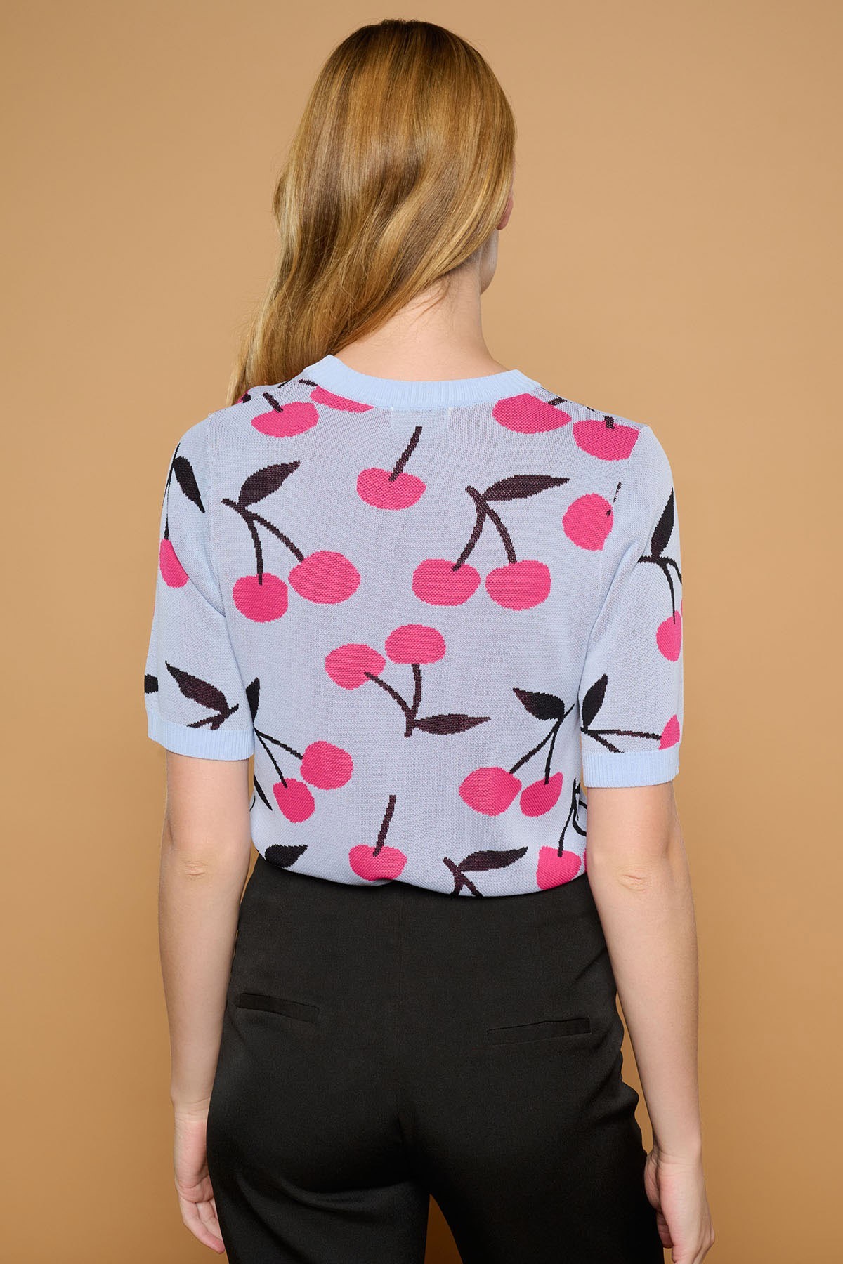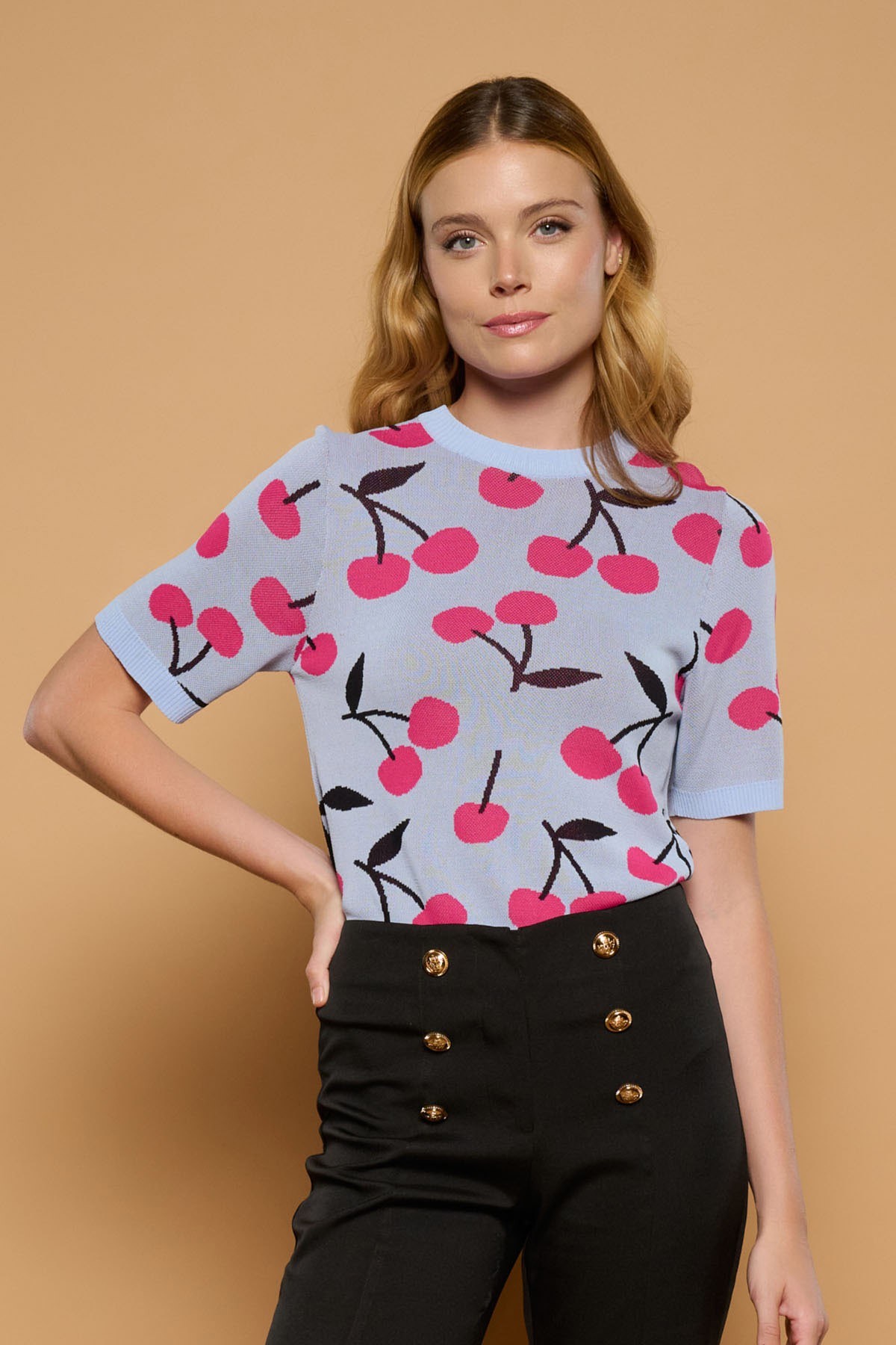 Fine-knit round-neck short-sleeved sweater. Ribbed collar, cuffs, and hem. Cherry print. Viscose blend fabric.