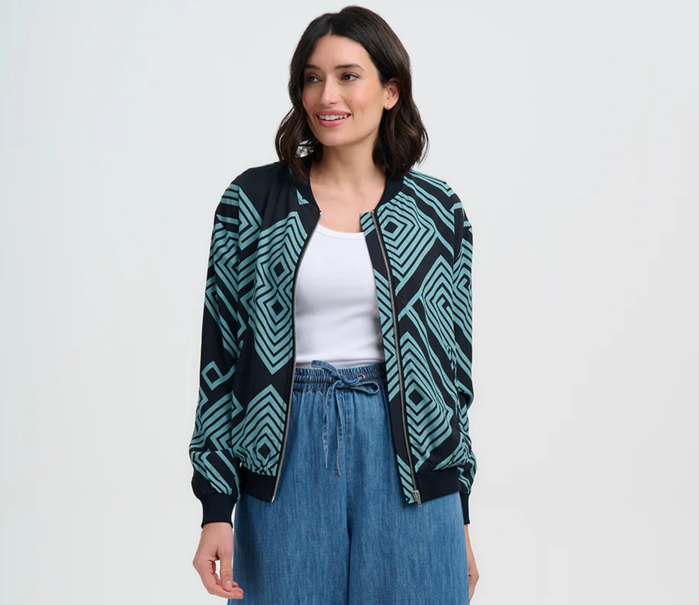 Meet your new layering hero – the Bobbi Bomber Jacket. A fresh style for the season, Bobbi combines a relaxed, easy fit with a lightweight feel, making it perfect for throwing over tees, knits, or dresses. Teal geometric spirals and diamonds create a bold, maze-like pattern on a black background – giving it that playful, geometric edge. Zip it up, stash your essentials in the handy pockets, and you’re ready for anything.