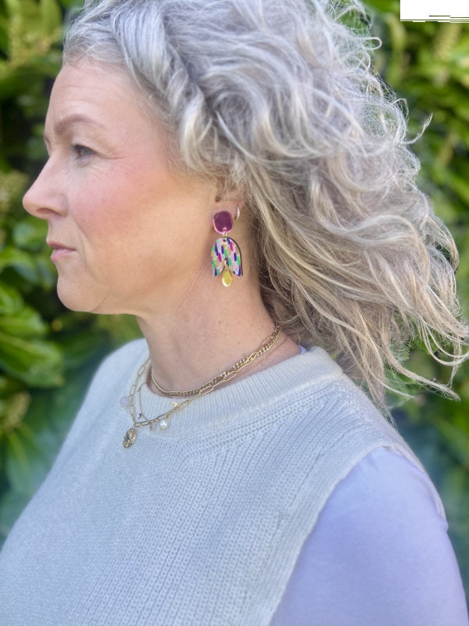 Crafted from premium FSC birch ply, these earrings feature a bold and playful brushstroke design in gorgeous shades of pink, purple, green, yellow, and gold, with little dashes scattered throughout for extra charm. The scalloped petal shape adds a soft, floral touch—perfect for anyone who loves a pop of colour in their accessories!