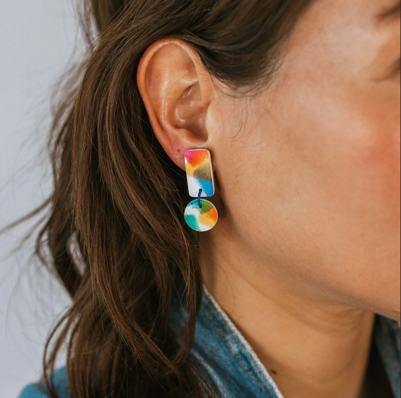 Aura Confetti is pure summer happiness. A painterly mix of sunshine yellow, sky blue, coral pink and fresh green come together in a soft, watercolour-style finish that feels playful, artistic and full of life. No two pairs are ever the same, making each set a tiny wearable artwork. Approx. 3.5cm long and finished with hypoallergenic stainless-steel posts.