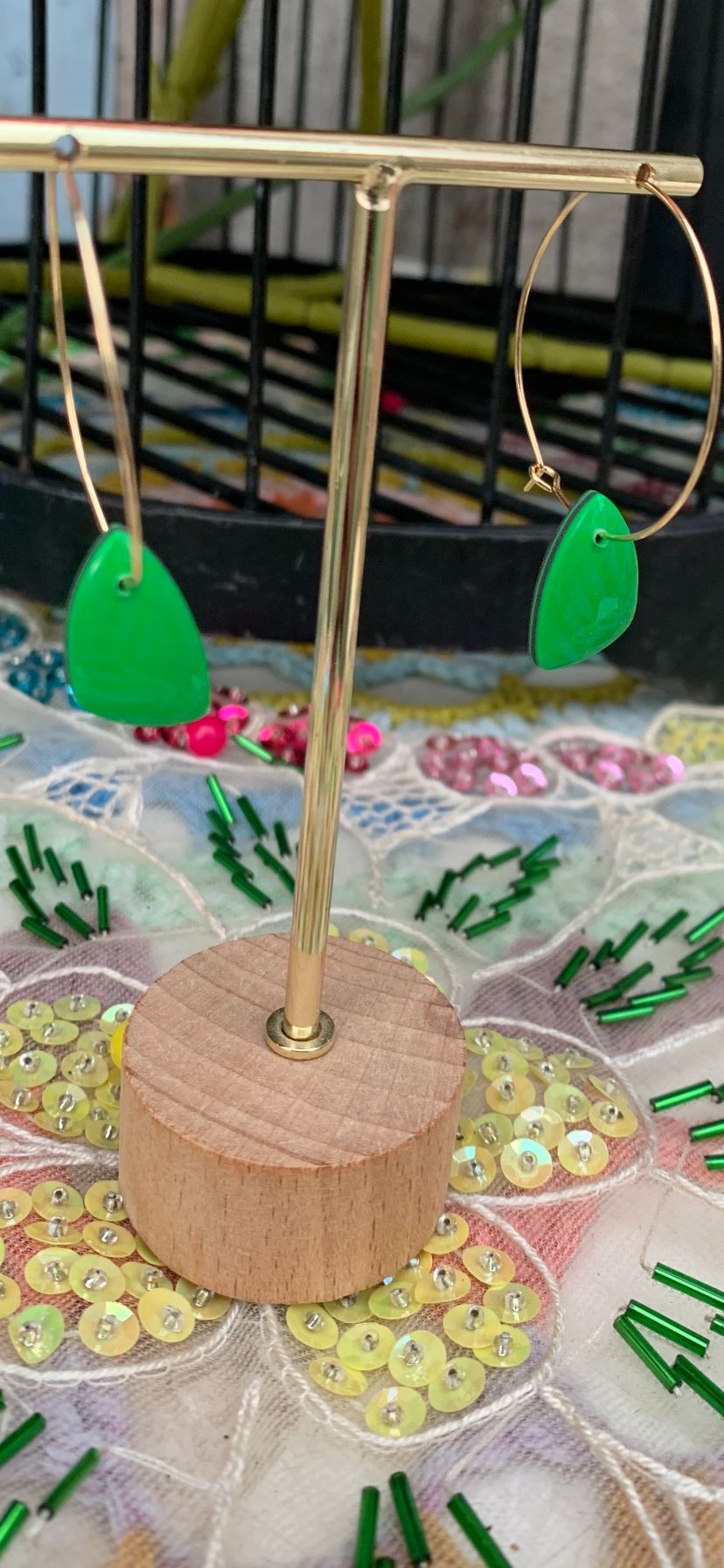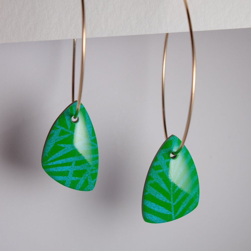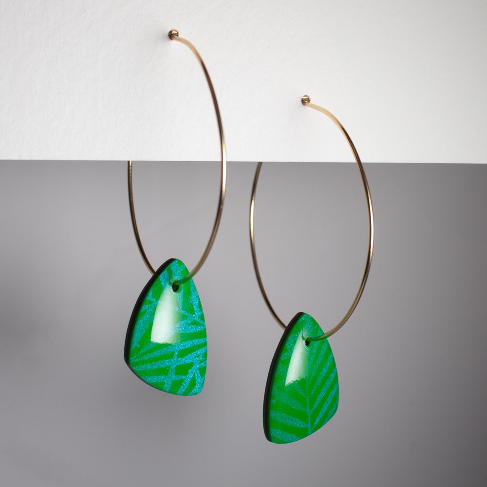 Sway earrings in deep green, a beautifully lightweight design that combines elegance with effortless style. These hoop earrings feature delicate green leaf details, adding a touch of nature-inspired charm. Their ultra-lightweight design makes them incredibly comfortable for all-day wear, while the soft, flowing movement adds a graceful touch to any outfit. Perfect for those who love understated yet unique accessories, the Sway earrings bring a subtle pop of colour and organic beauty to your look