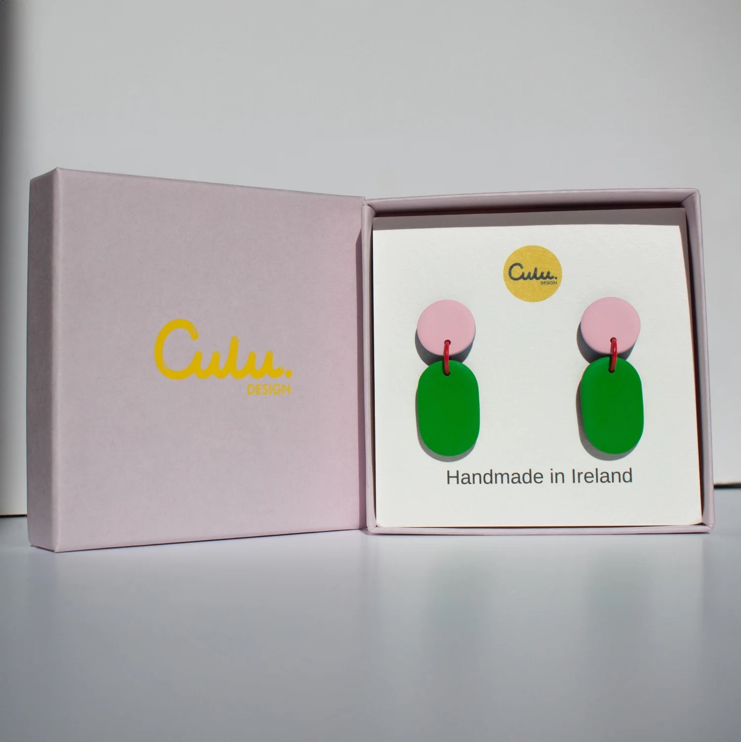 Nora is playful and confident, pairing a soft blush pink circle with a vibrant green oval drop. Clean shapes, bold colour contrast, and gentle movement make these earrings an easy statement - striking but effortlessly wearable. Lightweight and approx. 4cm long finished with hypoallergenic stainless-steel posts.