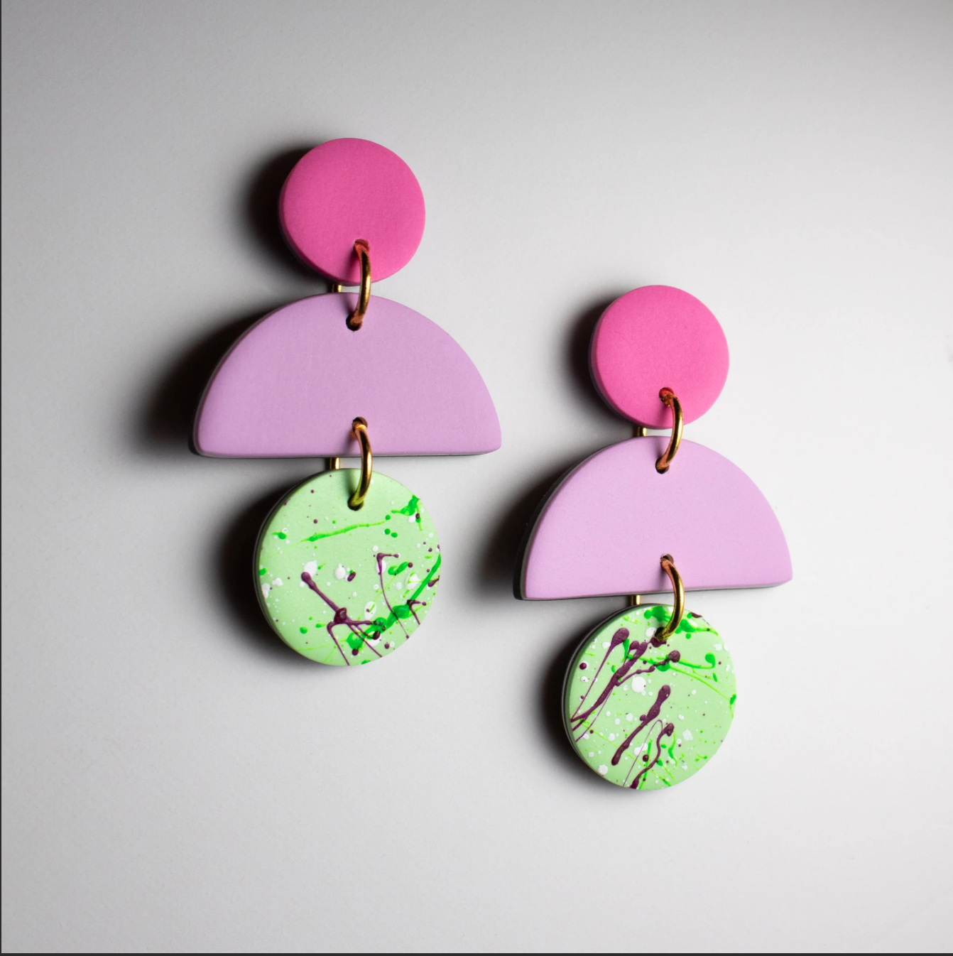 This edition of Suki is not for the shy and retiring types. Think juicy bubblegum, pink, soft lilac, and a bottom tier that looks like it just leapt off a paint-splattered dance floor. Approx. 4.5cm long and finished with hypoallergenic stainless steel posts.