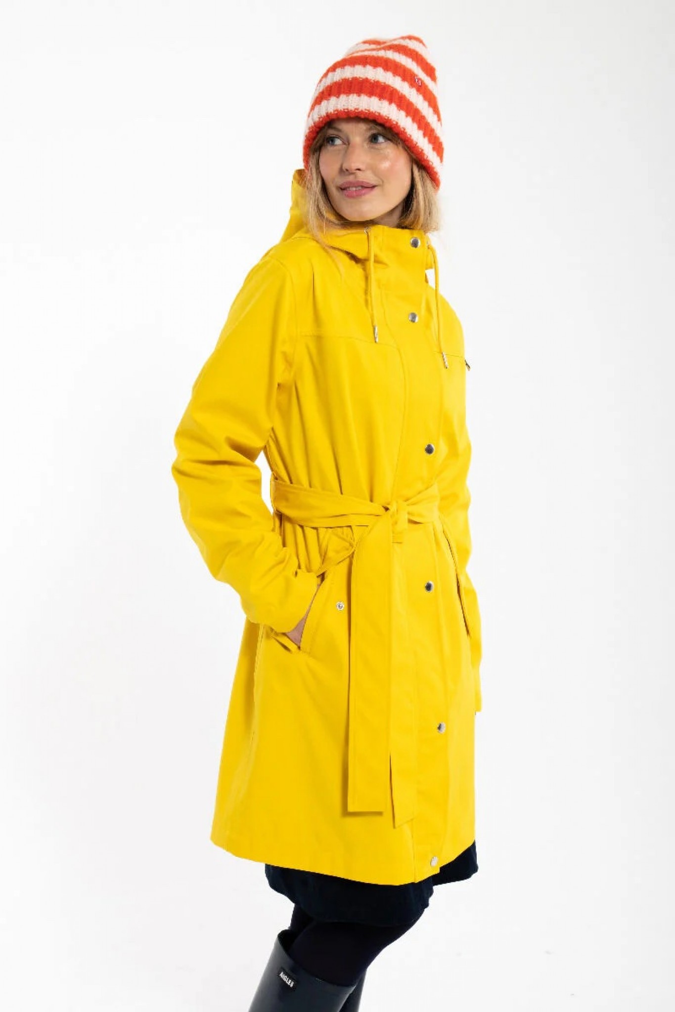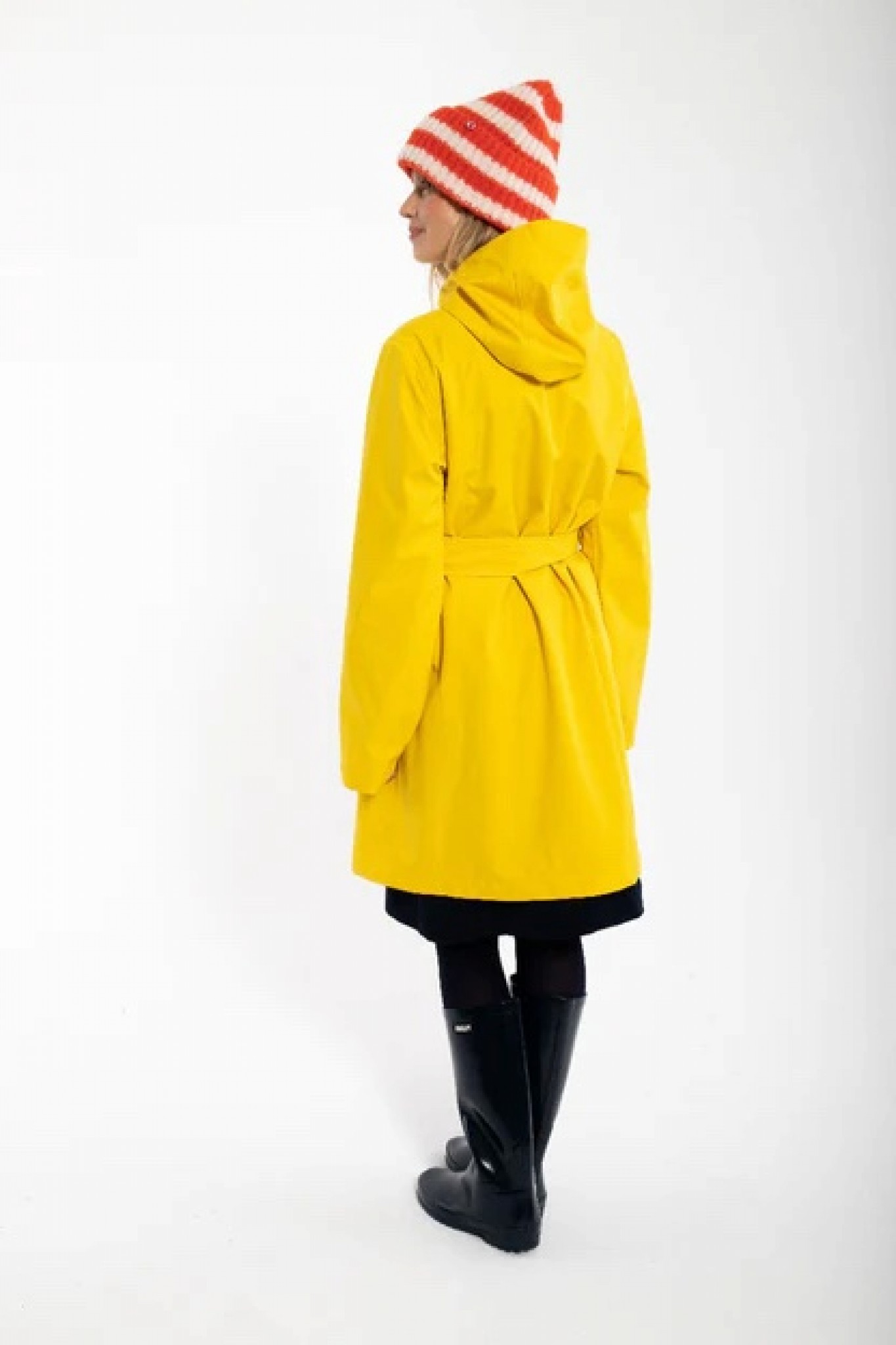 The new Danerainlover Raincoat is made in a truly fantastic new rainwear material. The raincoat is made of a soft and stretchy material that drapes beautifully and at the same time is extremely waterproof (10,000 mm) thanks to a membrane on the back. All seams are taped, and the raincoat is naturally breathable like all Danefæs coats. It ensures optimal comfort when you move in the rain. The raincoat has a simple, long and feminine fit with a tie belt at the waist. A double-zip waterproof zip at the front, which can be zipped from the bottom up, together with the elastic material makes the coat delightfully bike-friendly. The zip is covered by a front piece which closes with press studs.