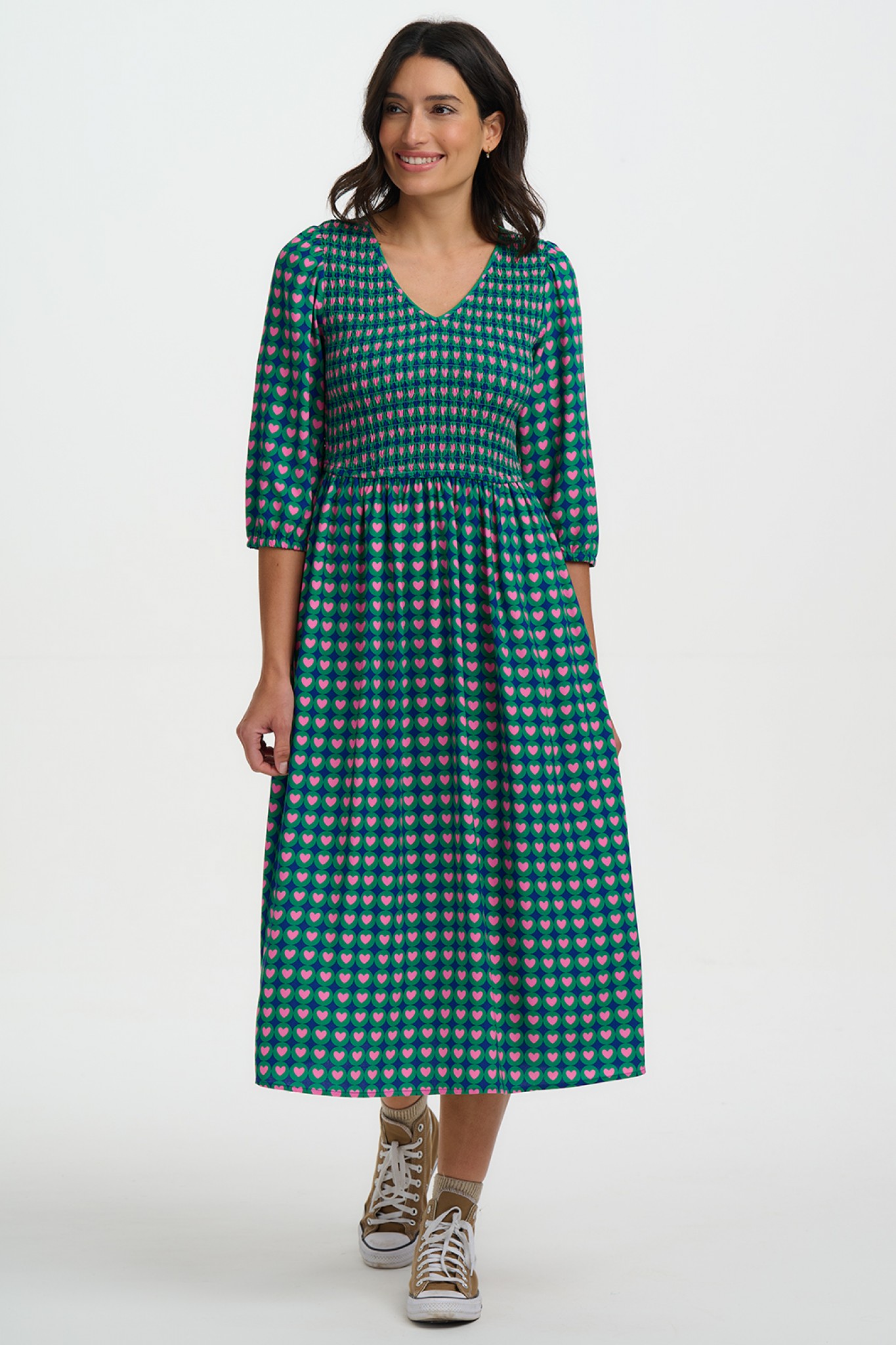 The Della Shirred Midi Dress is a feel-good statement piece with an easy, flattering fit. Featuring a softly shirred bodice, V-neckline and comfortable ¾-length sleeves, it flows into a relaxed midi skirt that moves beautifully. The bold retro heart print—pink hearts set within green circles on a navy base—adds playful charm, making it perfect for everyday wear with trainers or dressed up with boots.