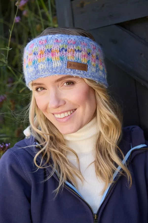 Women's knitted cosy ear warmer featuring pastel shades. Sherpa Fleece Lined. Super soft mohair/wool blend. Fair Trade and Handmade in Nepal.
