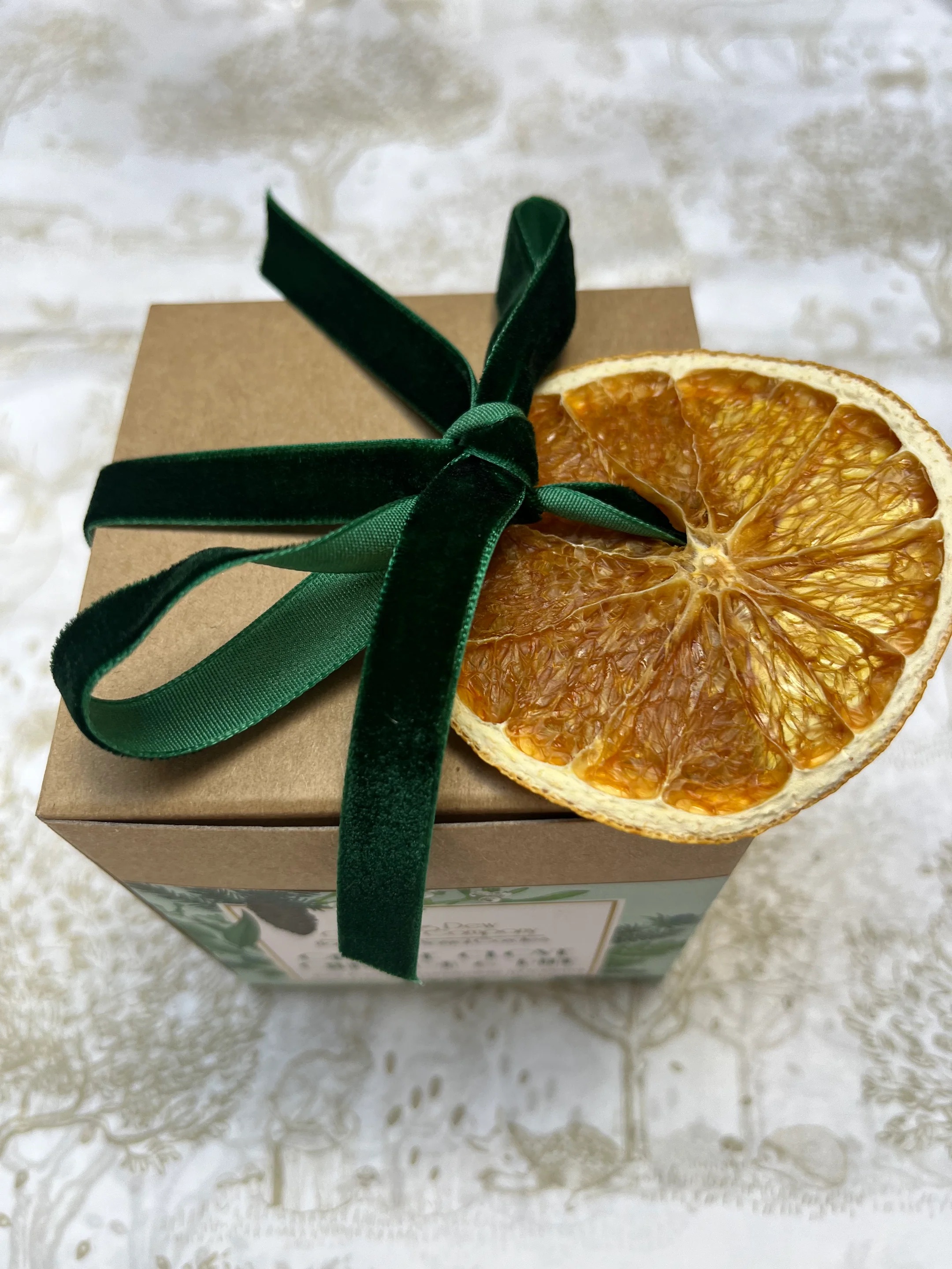 Each candle comes in a gorgeous brown box with bow. Enclosed is a biodegradable dust cover filled with Basil seeds, so after burning the candle you can fill it with soil and have a little pot of Basil. Such a cool idea!