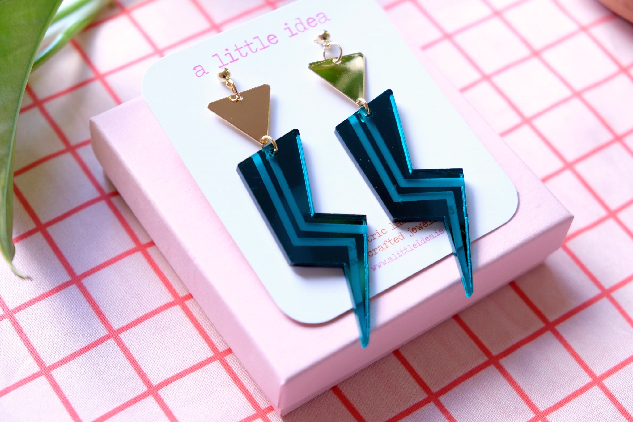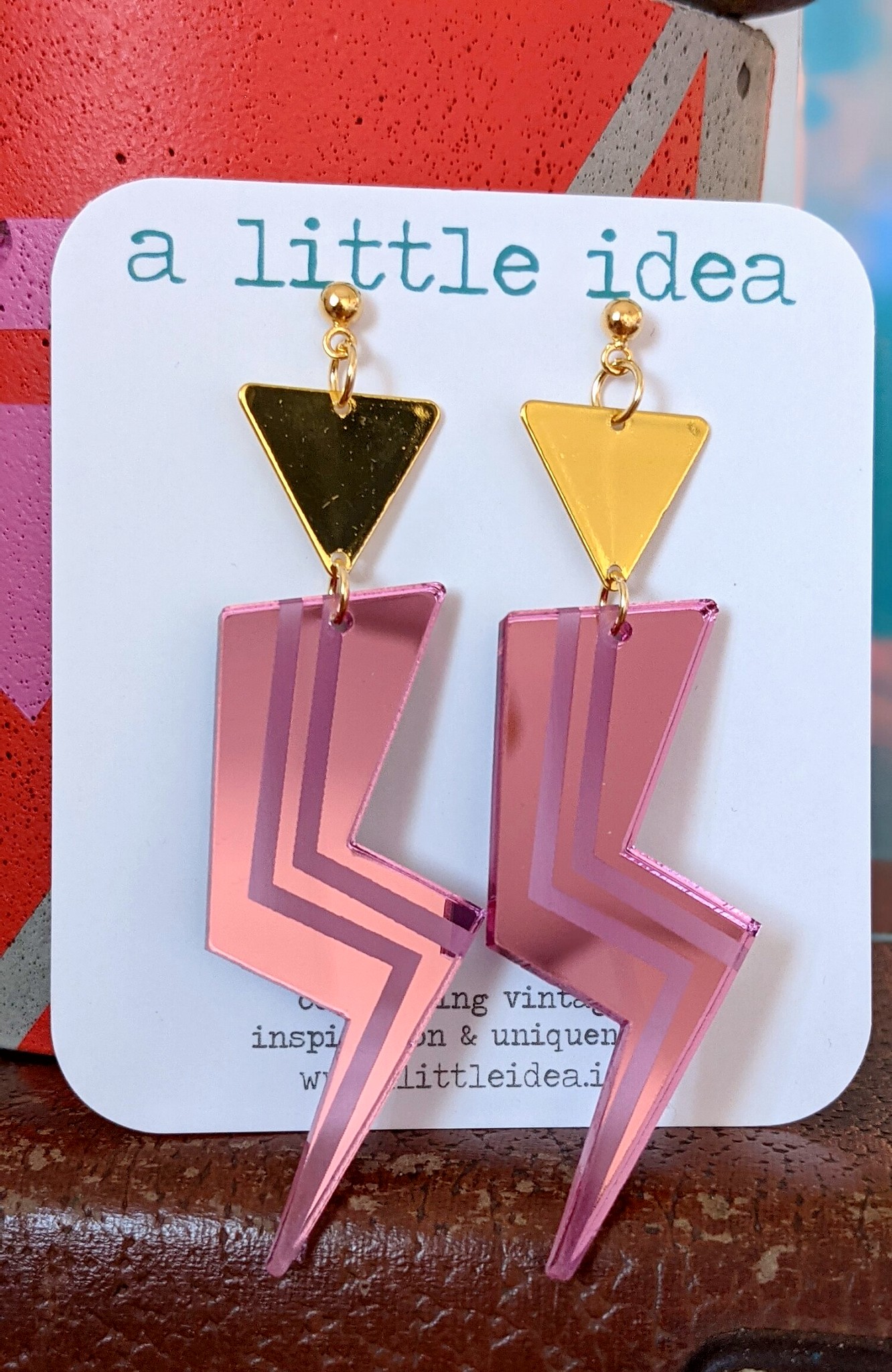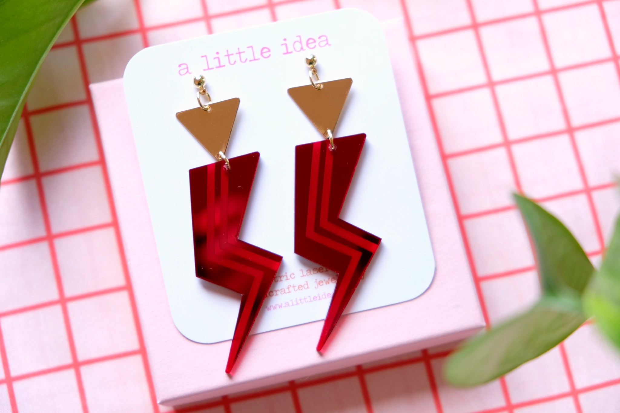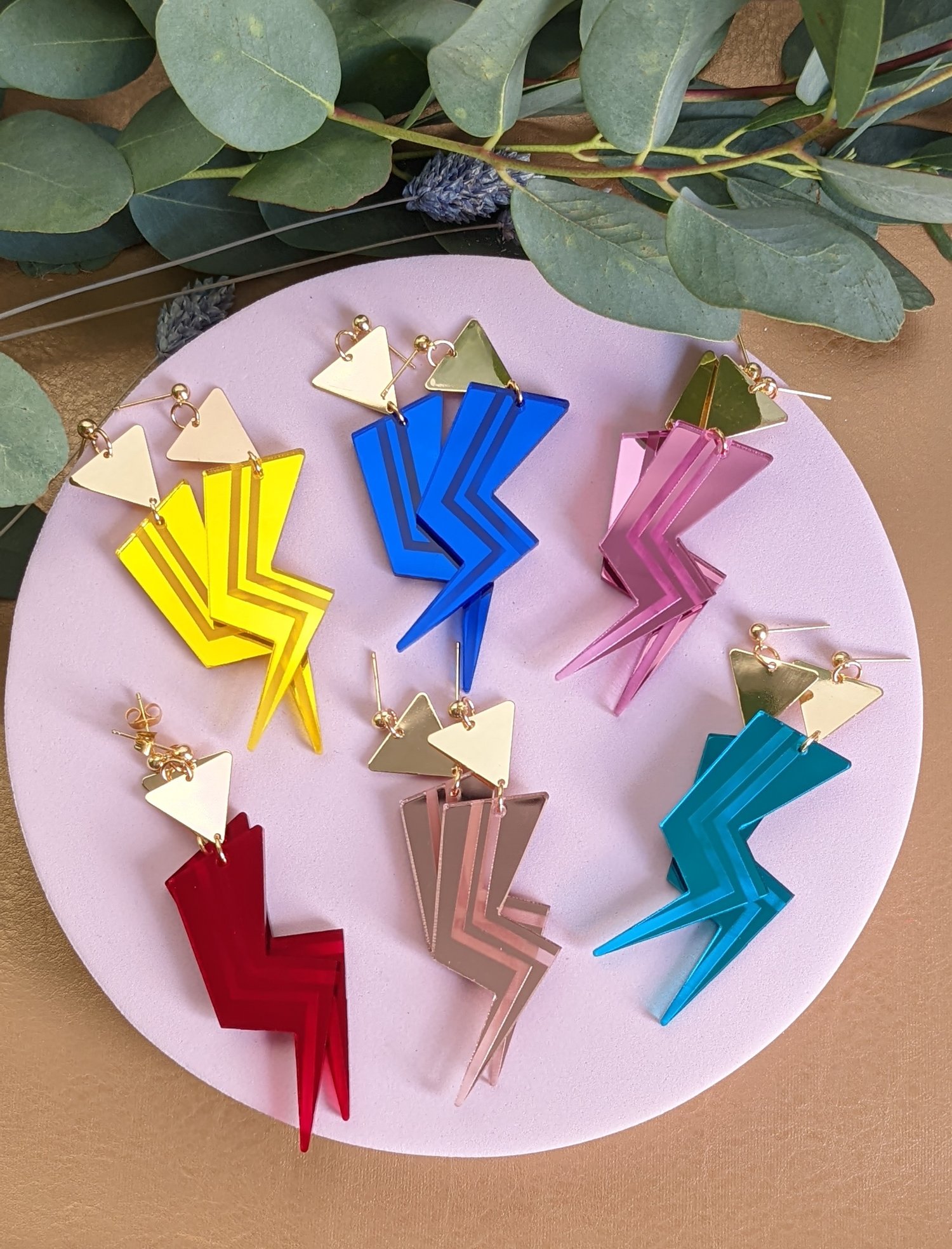 Laser Cut Mirrored Acrylic Lightning Bolt statement earrings with brass, smooth etched acrylic in a range of fabulous colours and styles, measuring 7cm long. All using mirrored acrylic. Please note that the mirrored acrylic only has a design on one side.