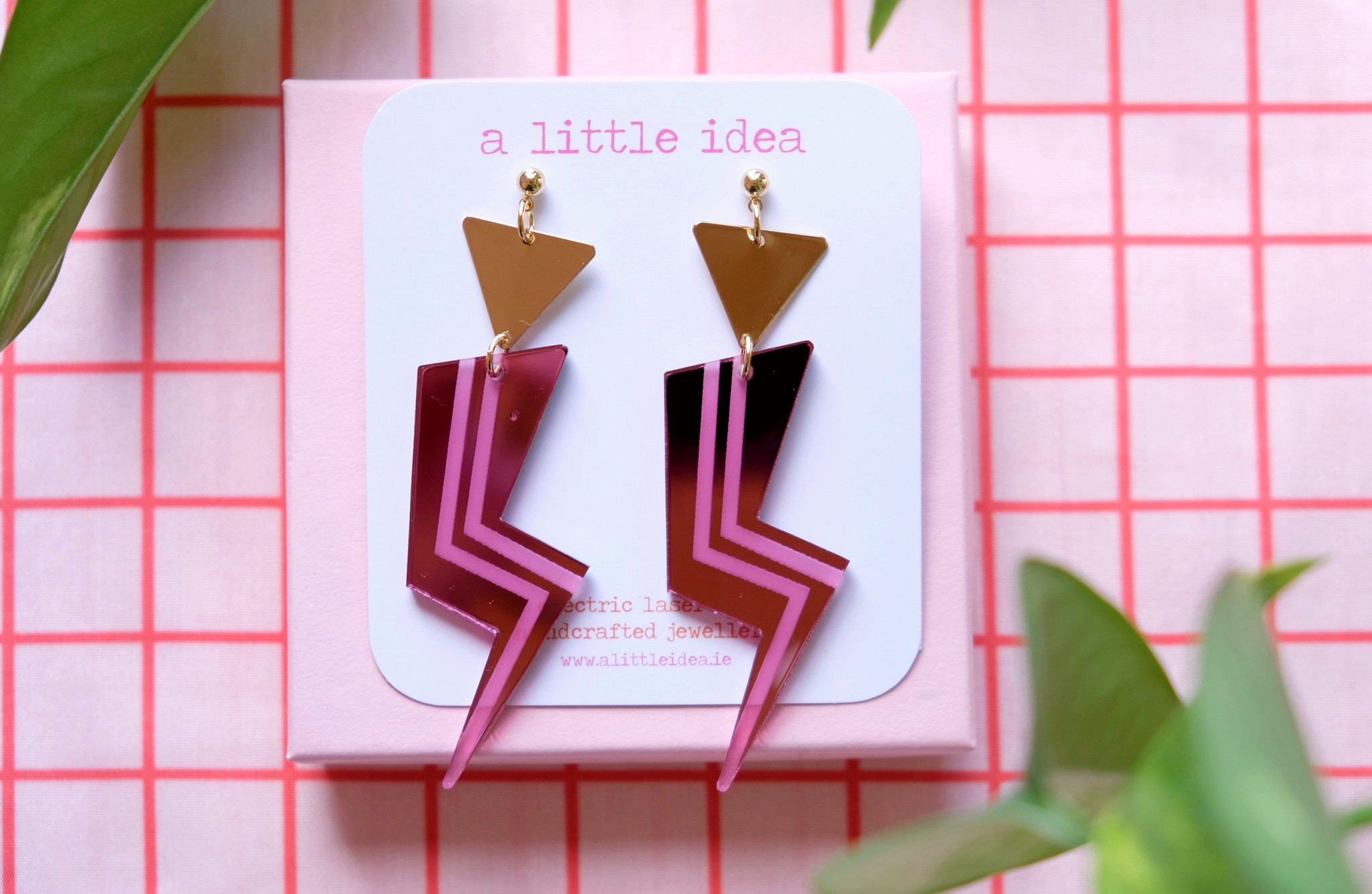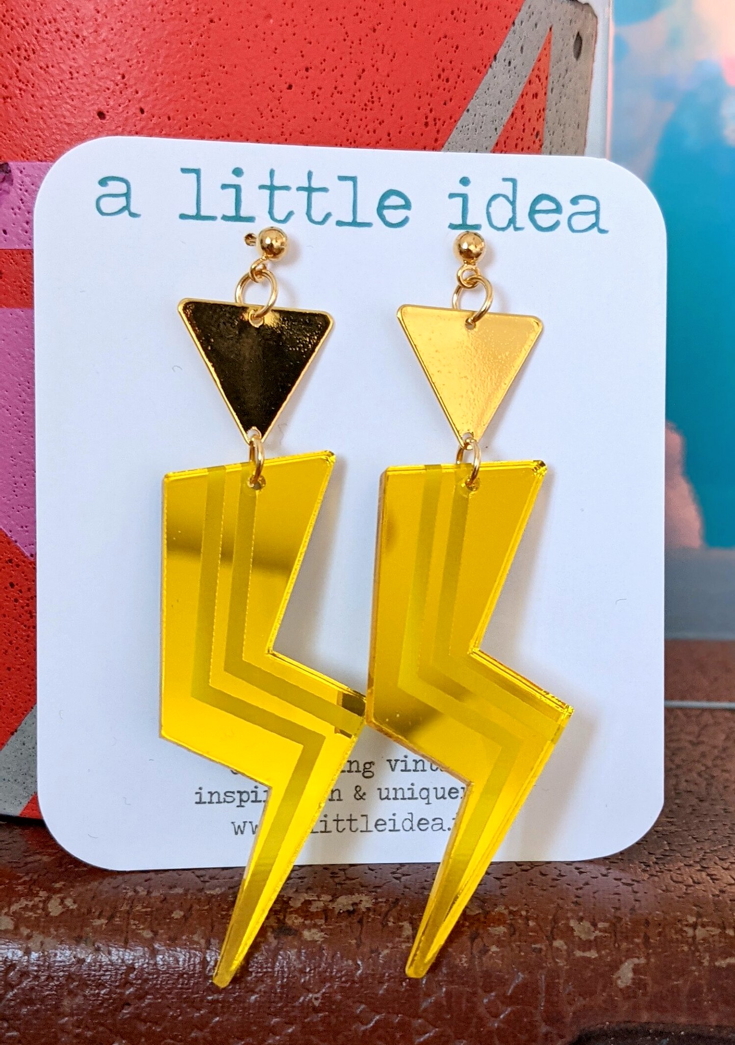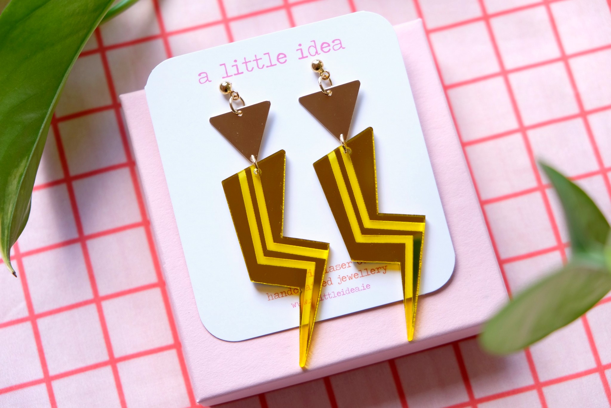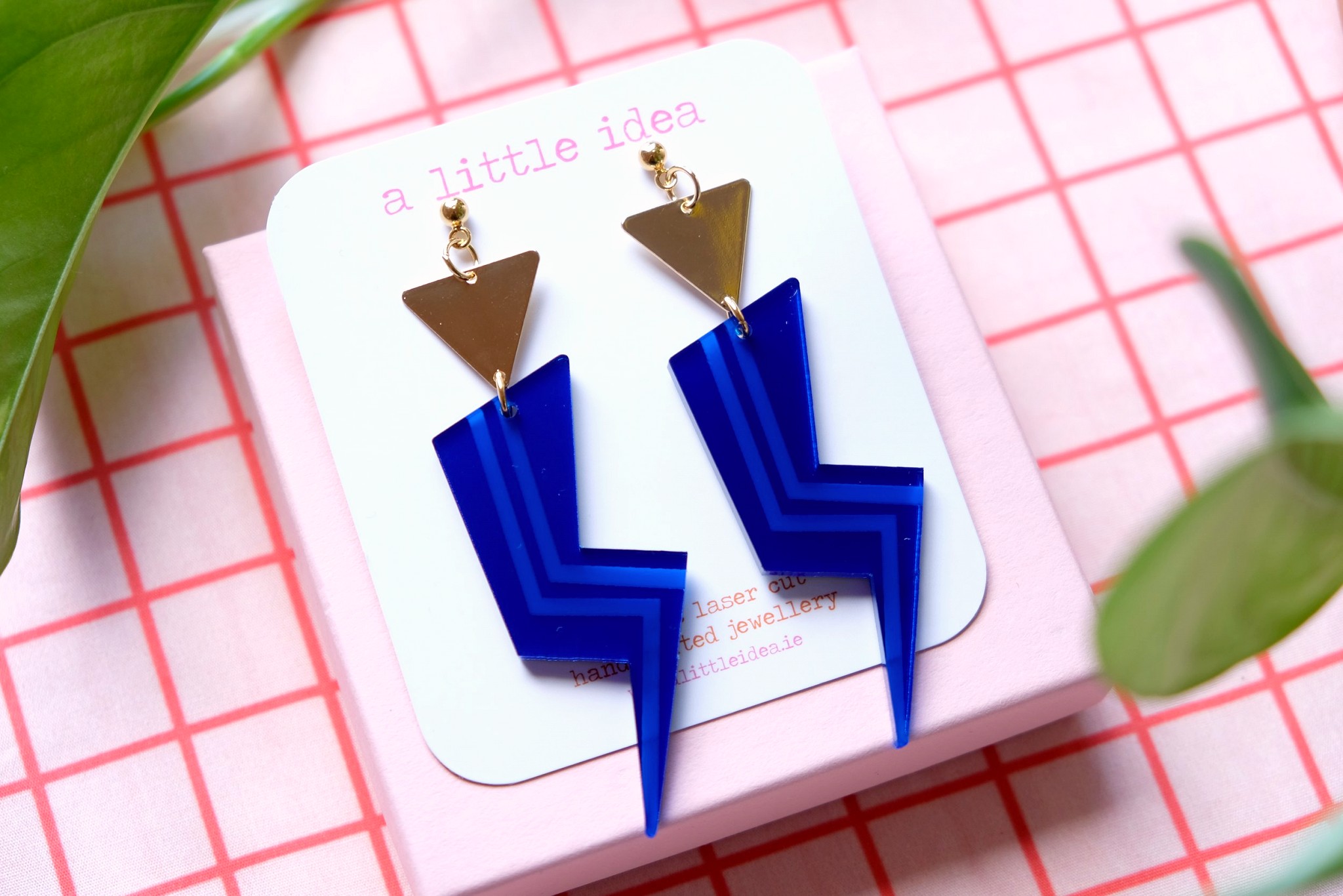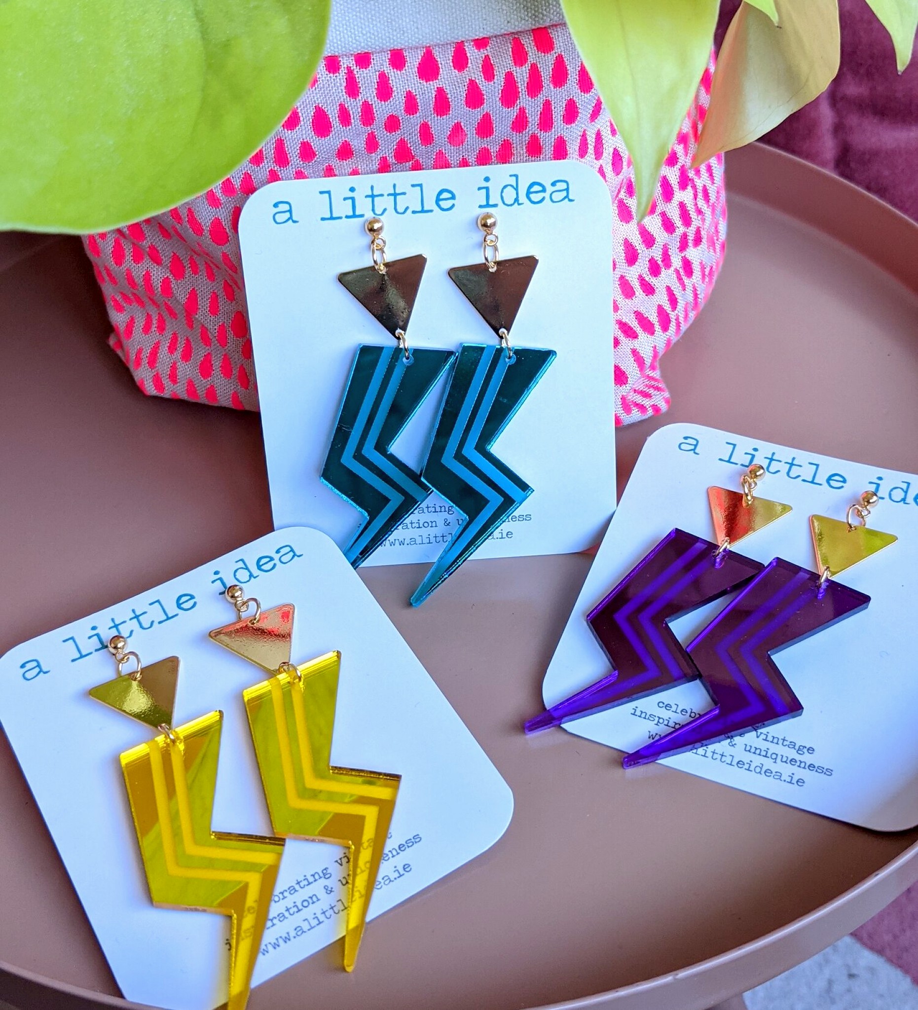 Laser Cut Mirrored Acrylic Lightning Bolt statement earrings with brass, smooth etched acrylic in a range of fabulous colours and styles, measuring 7cm long. All using mirrored acrylic. Please note that the mirrored acrylic only has a design on one side.