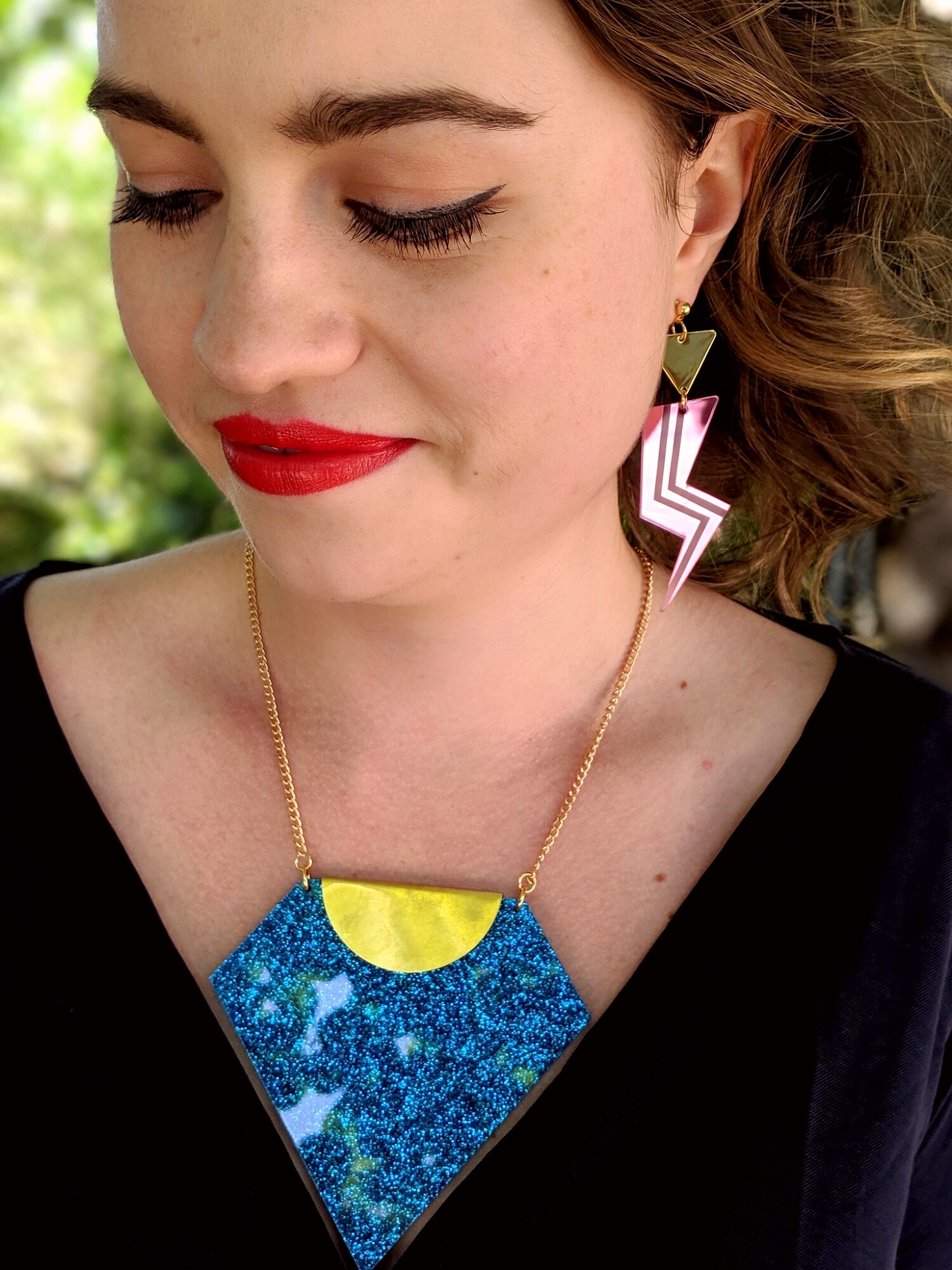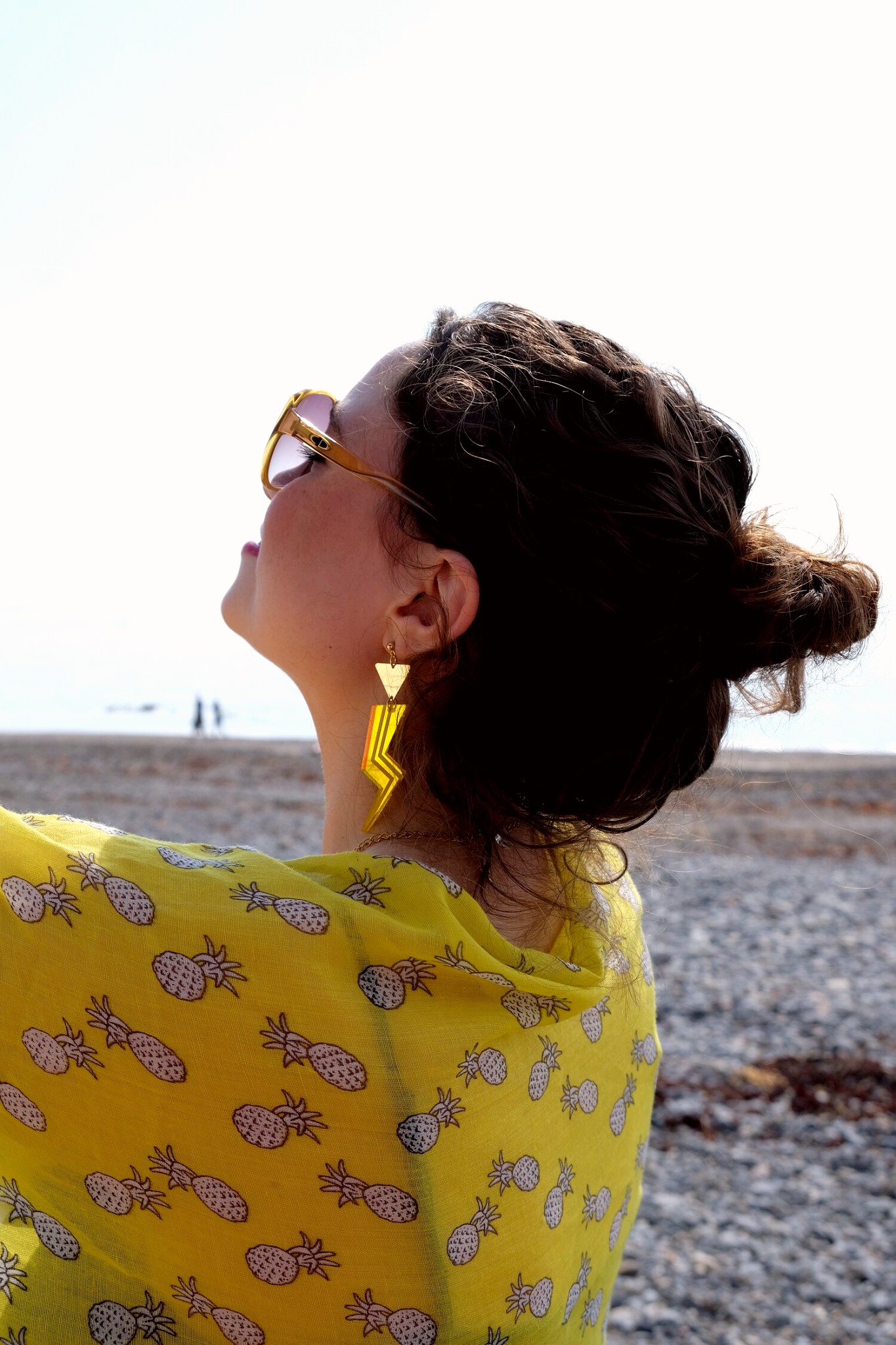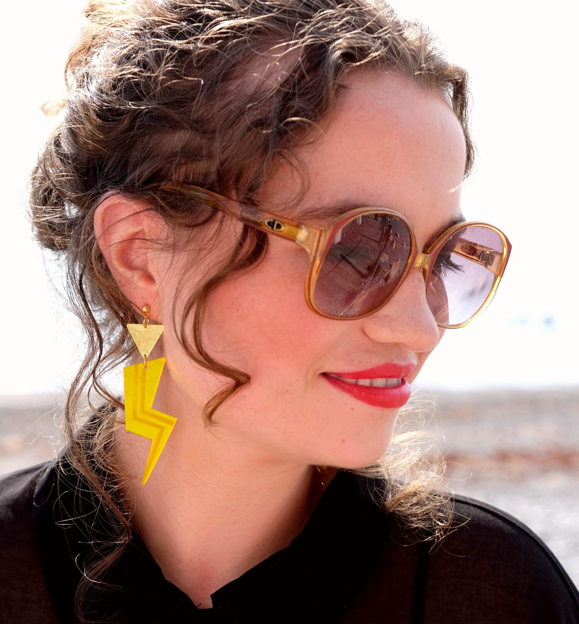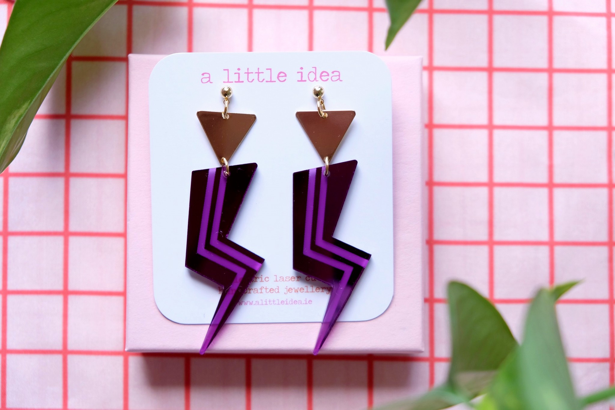 Laser Cut Mirrored Acrylic Lightning Bolt statement earrings with brass, smooth etched acrylic in a range of fabulous colours and styles, measuring 7cm long. All using mirrored acrylic. Please note that the mirrored acrylic only has a design on one side.