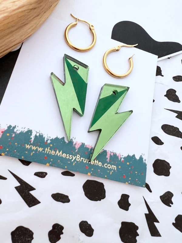 This pair is laser cut from vibrant kiwi green acrylic, featuring an etched, hand-inked design that makes each bolt unique. They swing effortlessly from 20mm stainless steel gold hoops and are finished with a brushed gold backing, giving them a polished look from every angle.