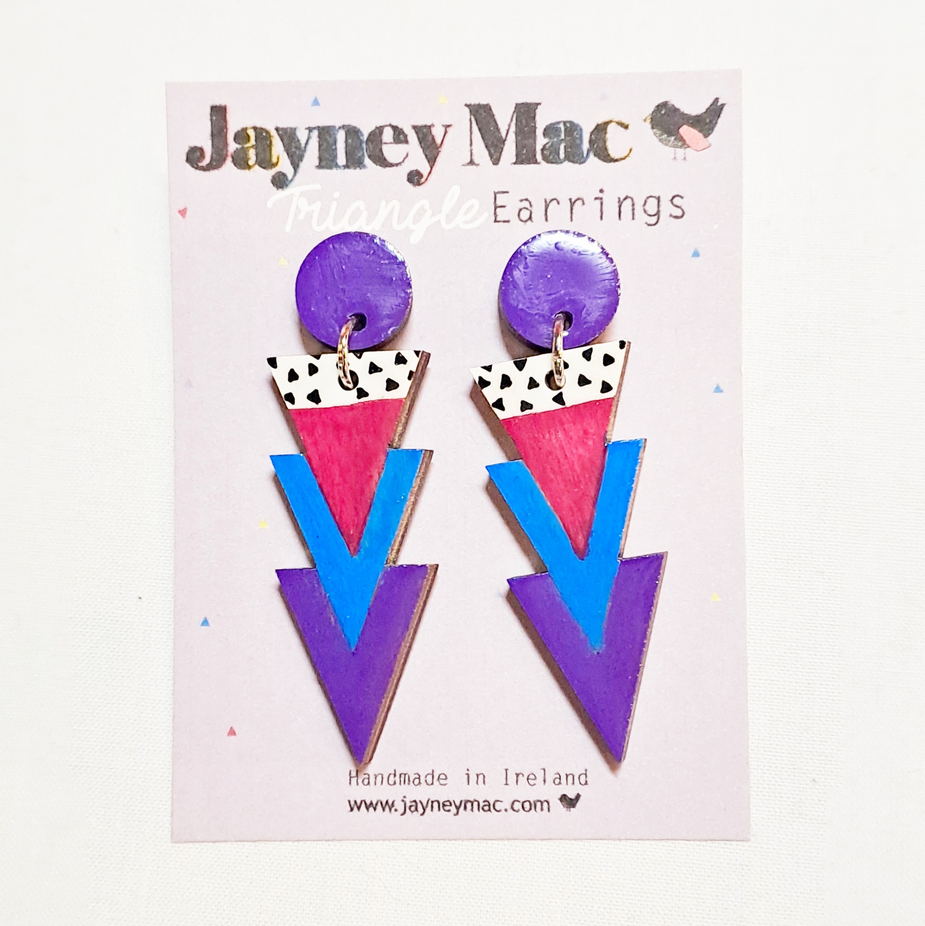 Hand painted wooden triangle purple earrings