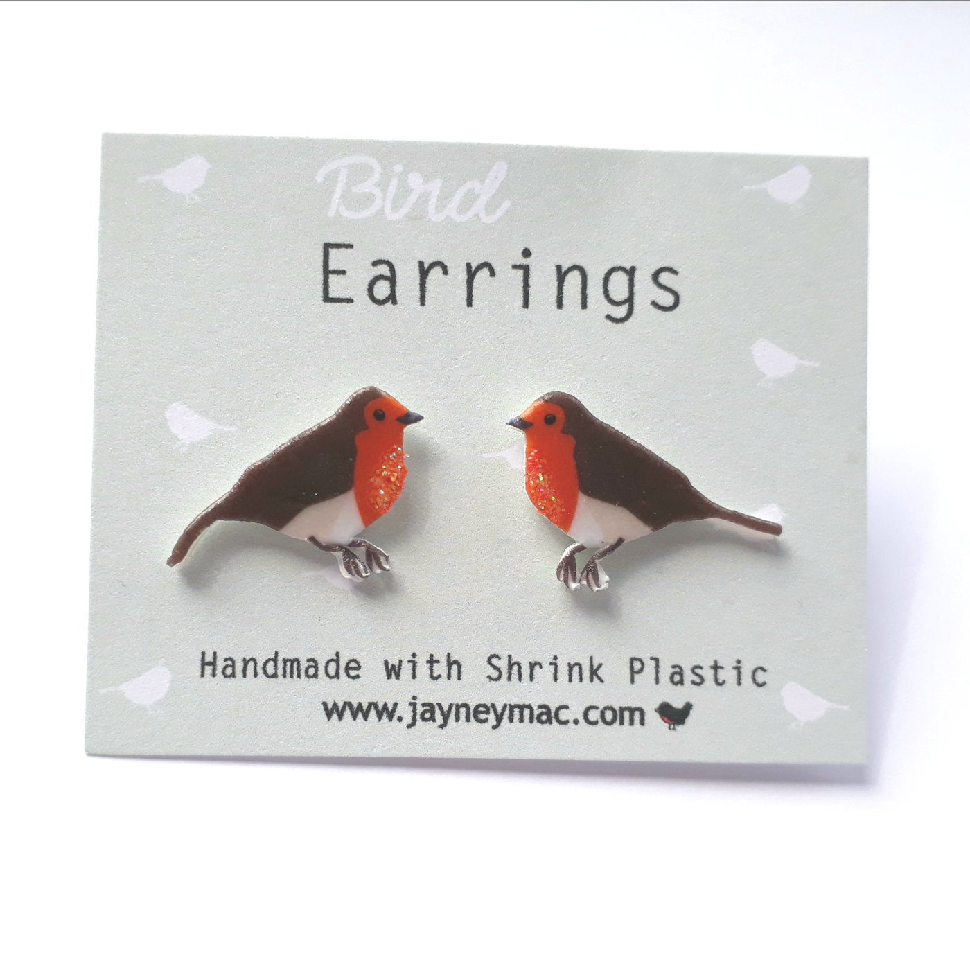 This is a pair of robin earrings. The earrings are completely handmade from start to finish. To make them I print, cut and shrink the earrings and coat them with a clear resin glaze. They would make a perfect gift for any robin lover.