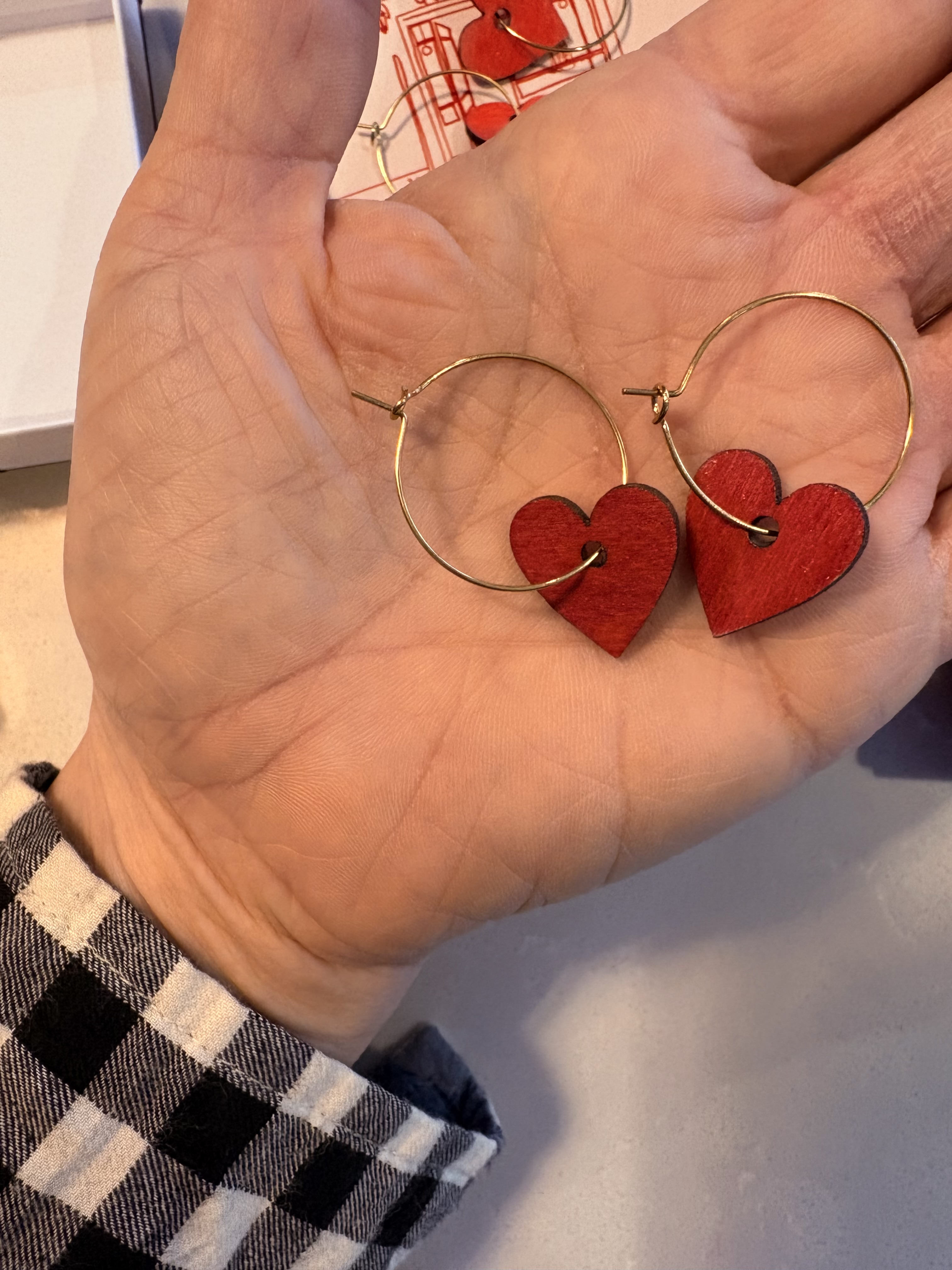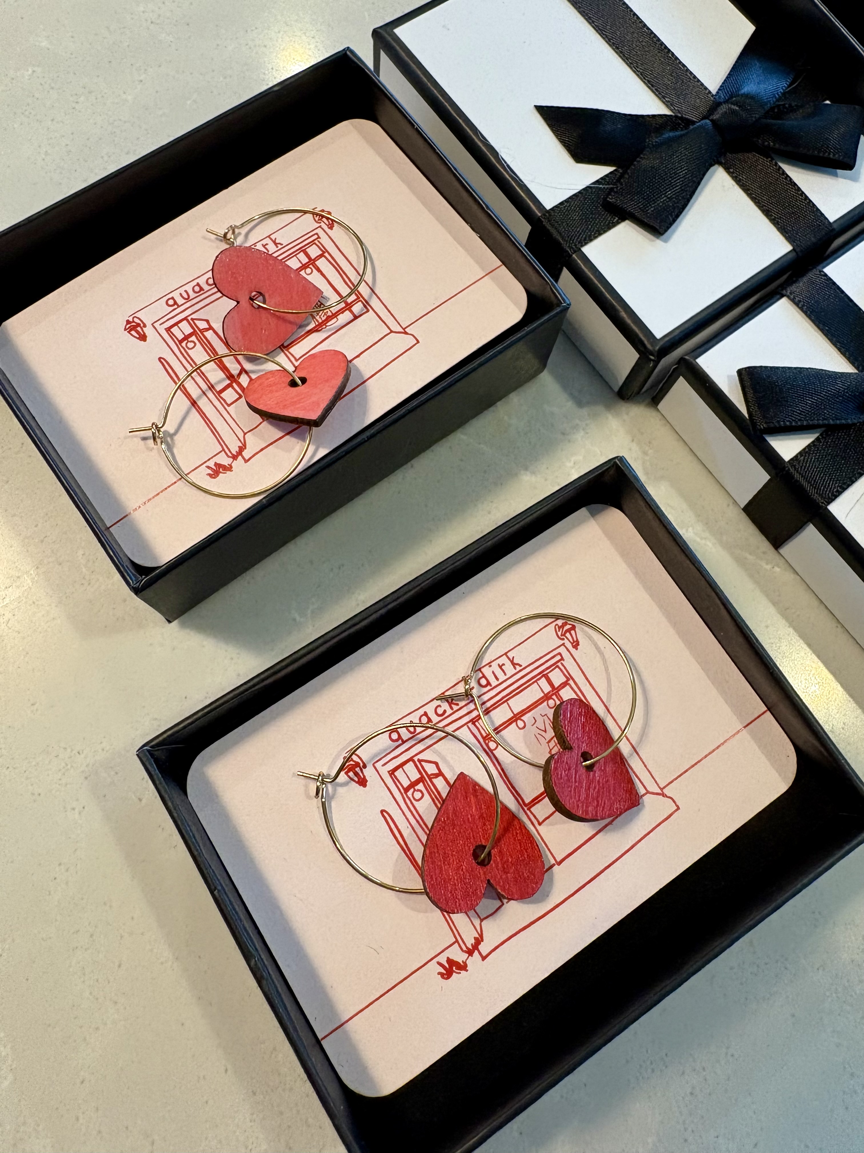 Handmade lightweight cute earrings by Deids, the owner. The metal is stainless steel so good for sensitive ears and will not tarnish. The hearts are lightweight wood painted and sealed with a varnish. These earrings are on gold hoops.