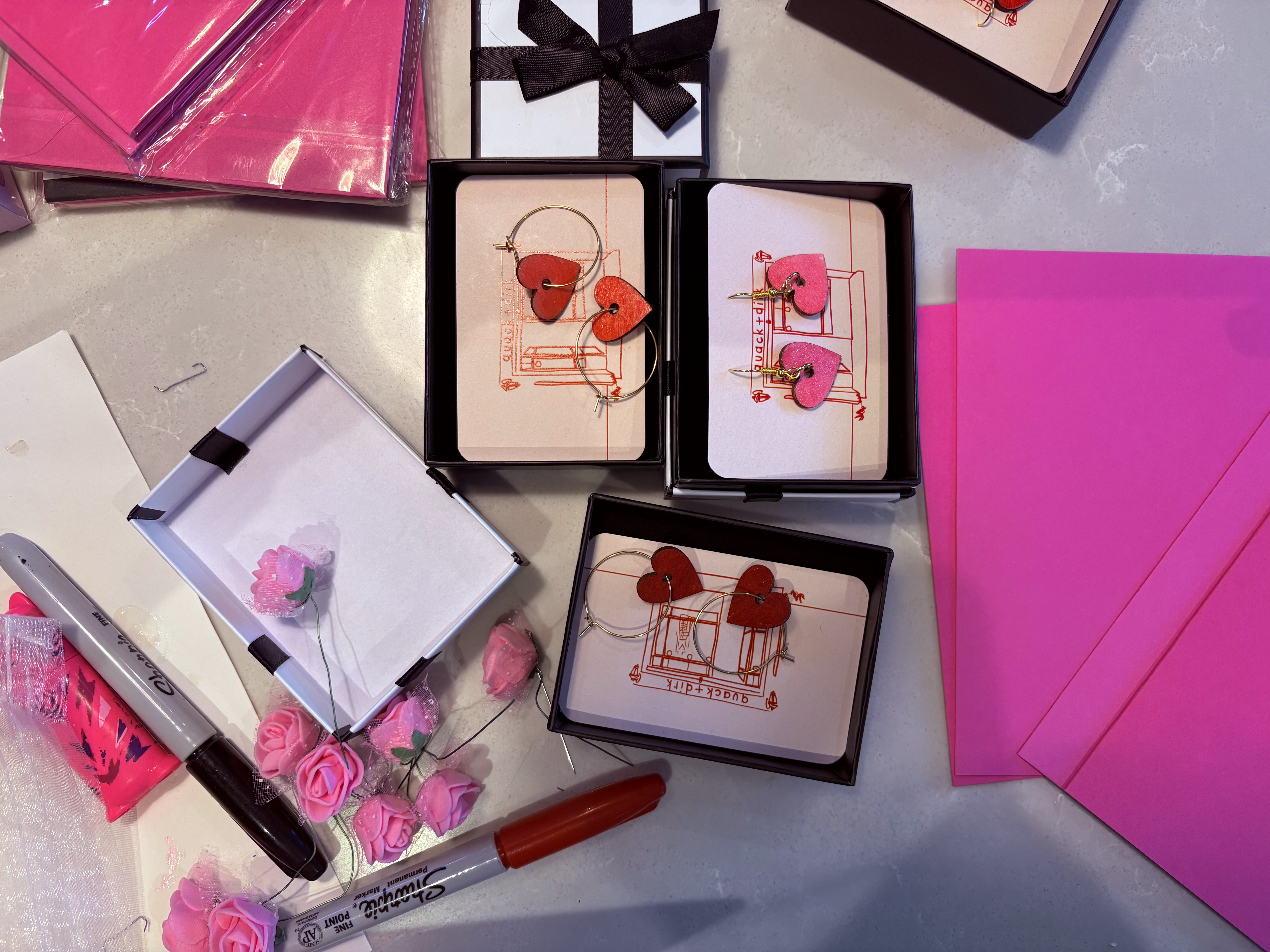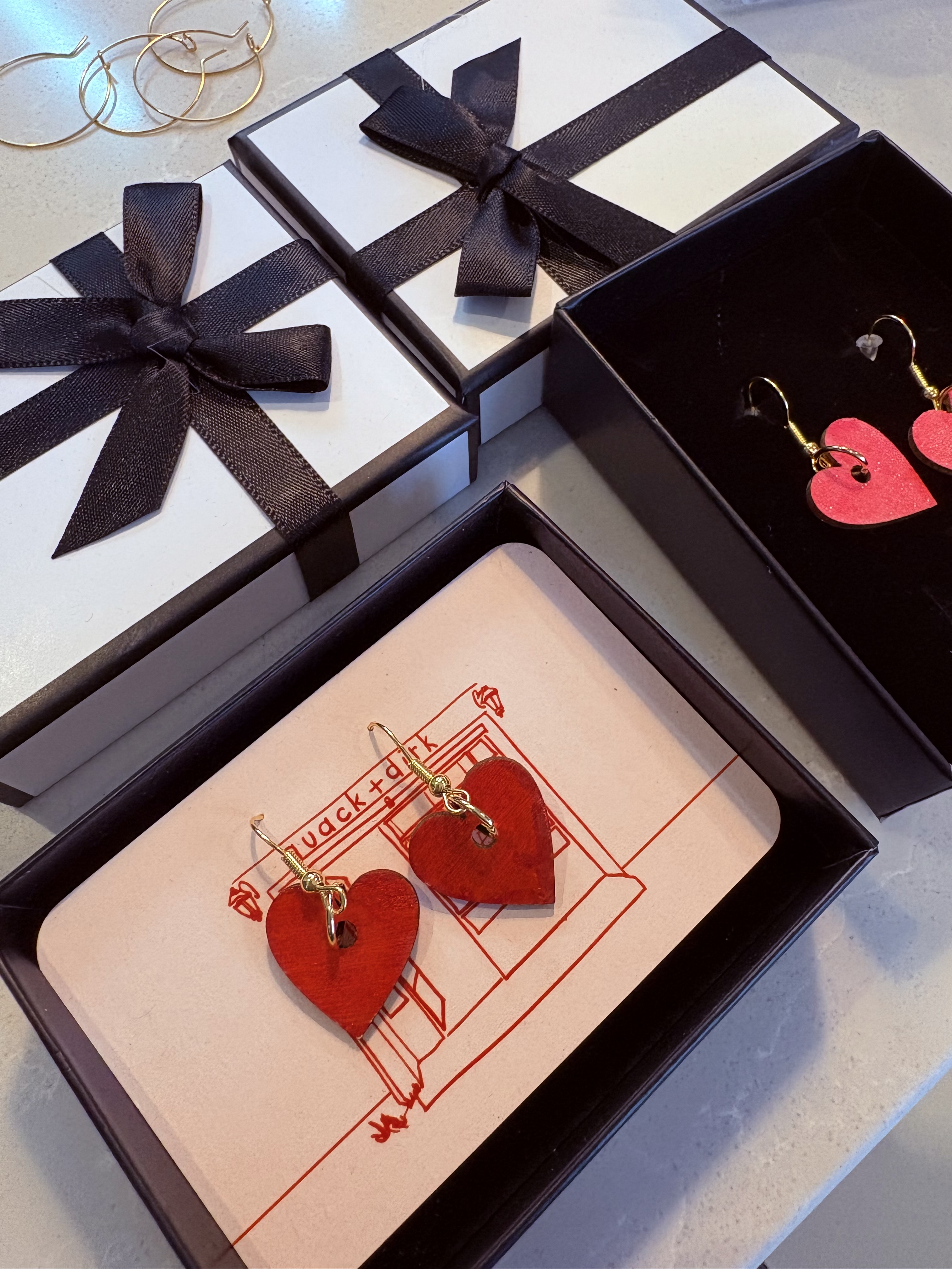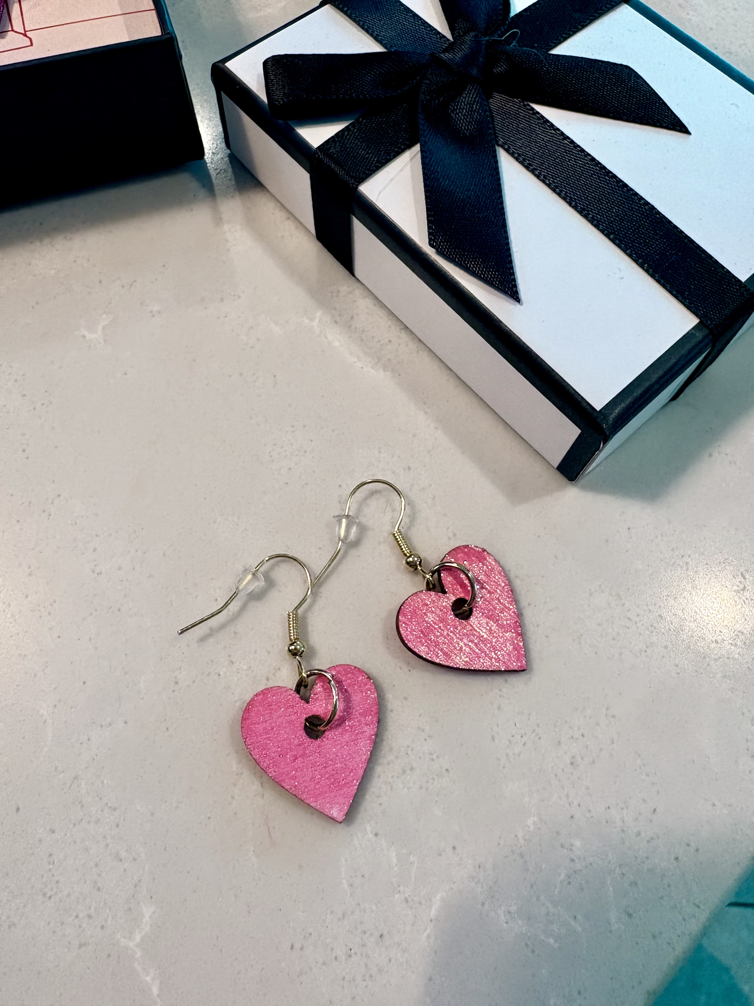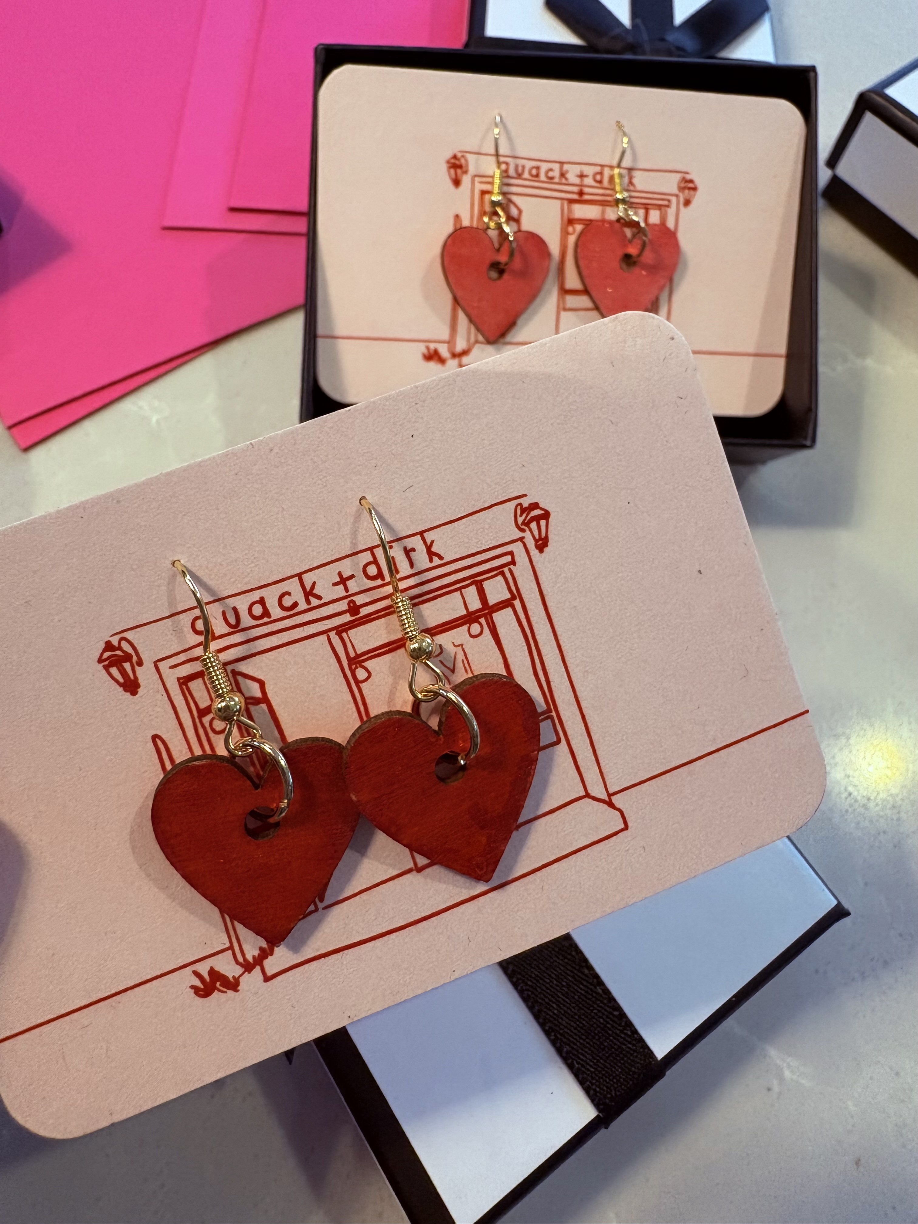 Handmade lightweight cute earrings by Deids, the owner. The metal is stainless steel so good for sensitive ears and will not tarnish. The hearts are lightweight wood painted and sealed with a varnish. These earrings are made with fish hooks with little rubber backs.
