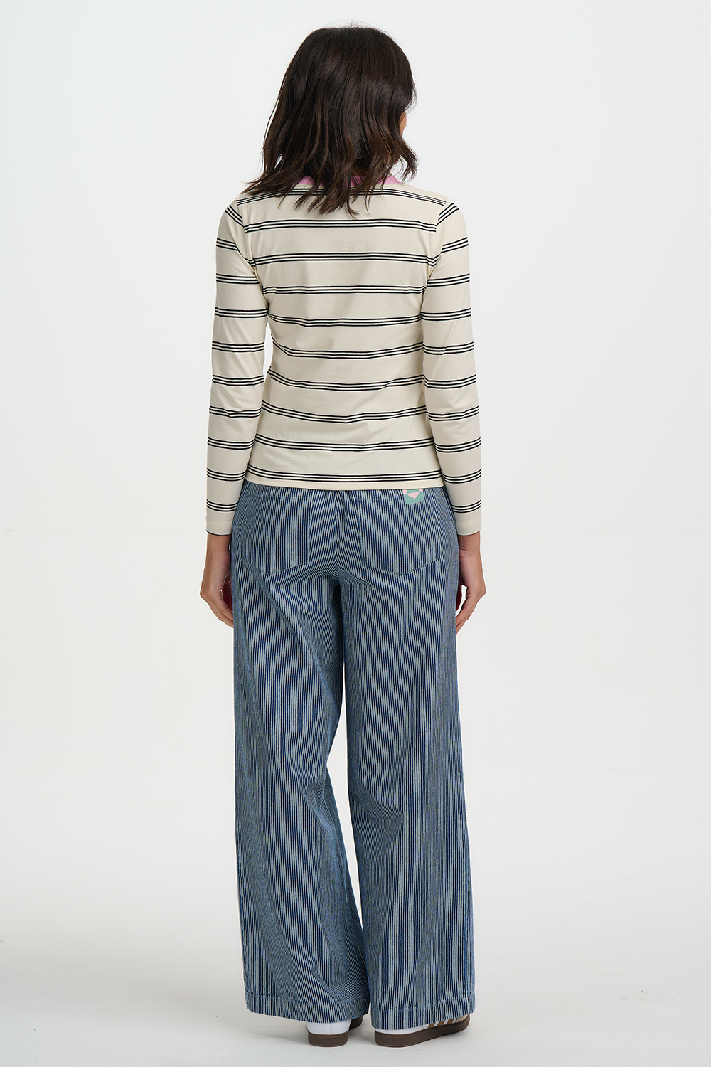 Refresh your wardrobe with the Josie Jersey Top in Off White/Black. Featuring bold black horizontal stripes accented with a crisp off-white base and contrasting pink neckline, this long-sleeve top offers a clean, modern take on classic Breton style. Crafted from soft, breathable jersey fabric, it’s perfect for layering or wearing solo for effortless everyday style.