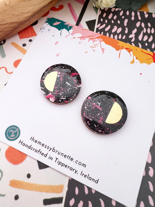 A lovely pair of splatter type statement stud earrings, these ones are black with pops of neon pink and white and finished off with some brass discs enchased in a layer of resin