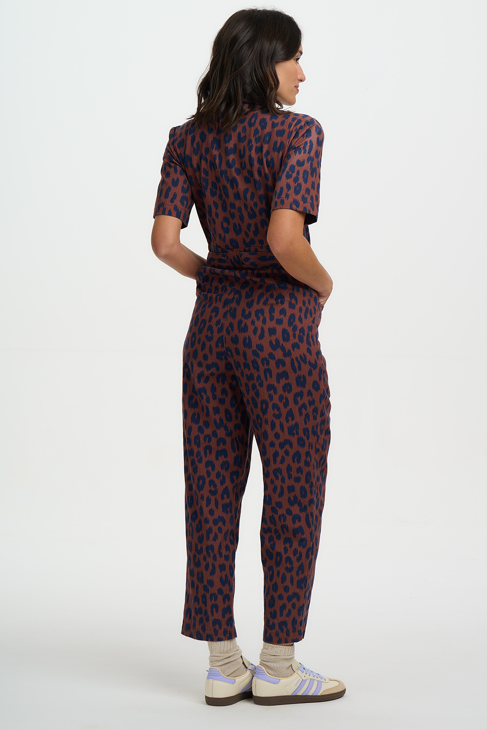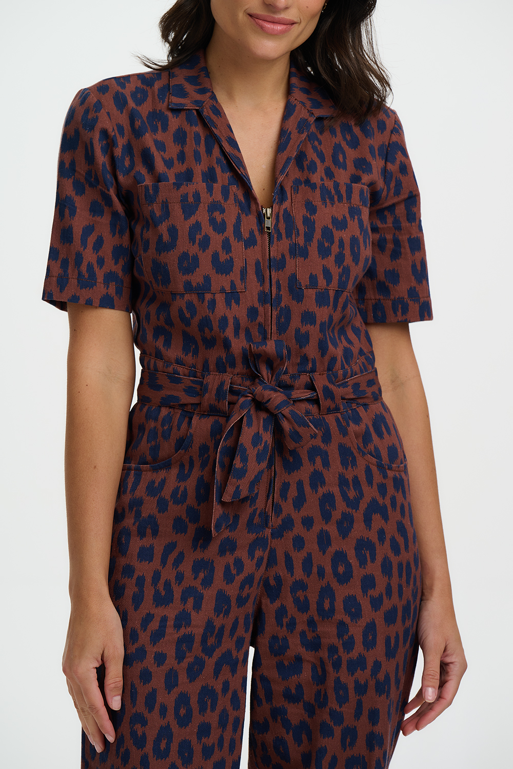 Meet the Meredith Boilersuit, your new go-to for effortless cool and everyday ease. Cut in a relaxed boilersuit silhouette, Meredith features an open shirt collar, a functional zip front opening, short sleeves, and a self-fabric belt to cinch the waist for a flattering shape. Designed in a timeless deep navy leopard spots scattered across a rich brown background, this versatile piece strikes the perfect balance between smart and casual. Whether styled with trainers for laid-back vibes or dressed up with boots, the Meredith Boilersuit is a must-have wardrobe hero.