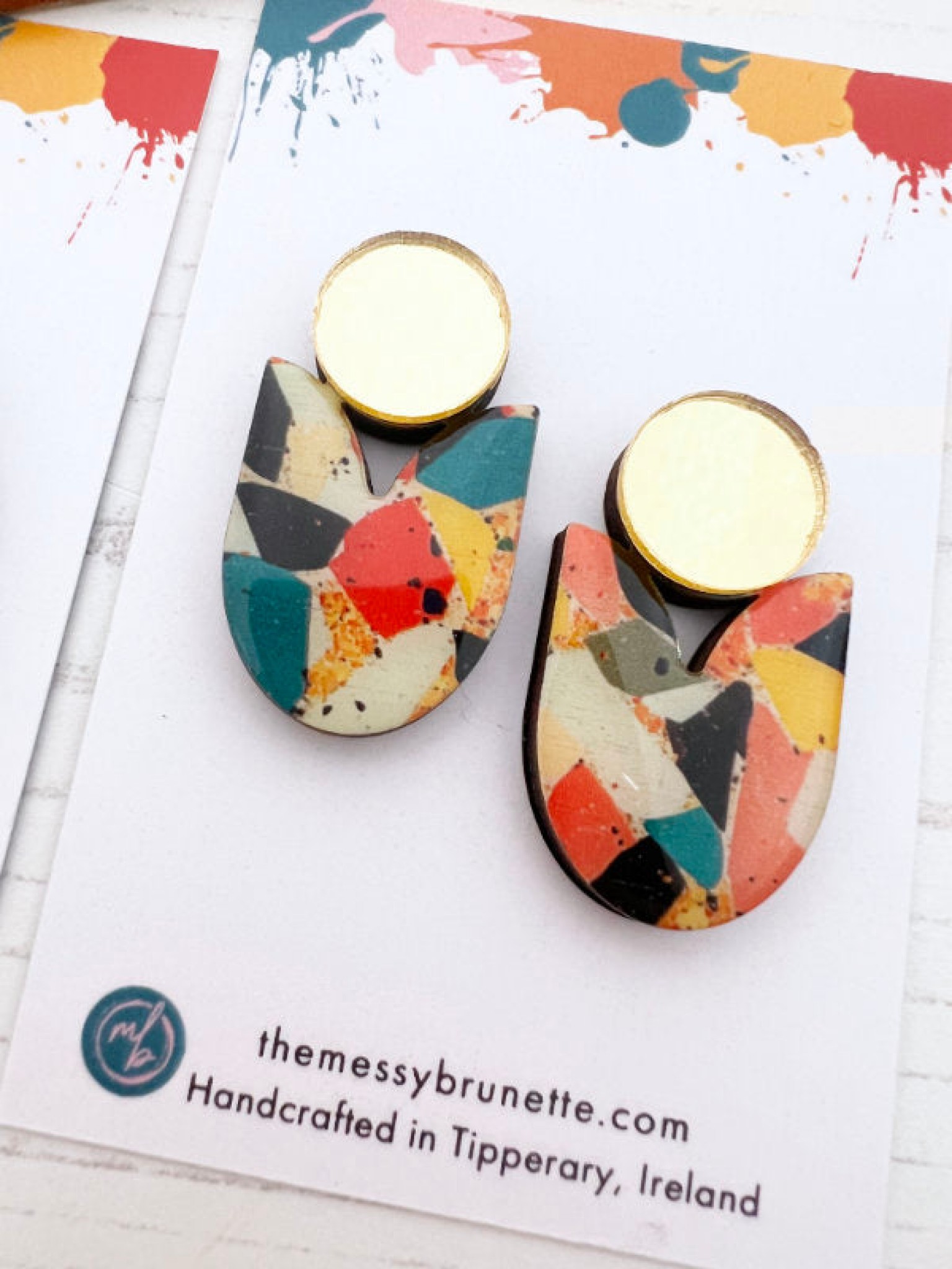 Statement studs featuring a UV-printed mosaic tile design on premium FSC birch ply, finished with eco-resin for shine and protection. Small in size but bold in style!