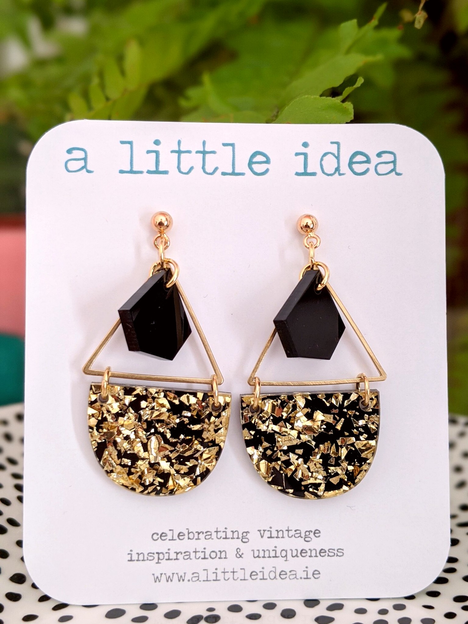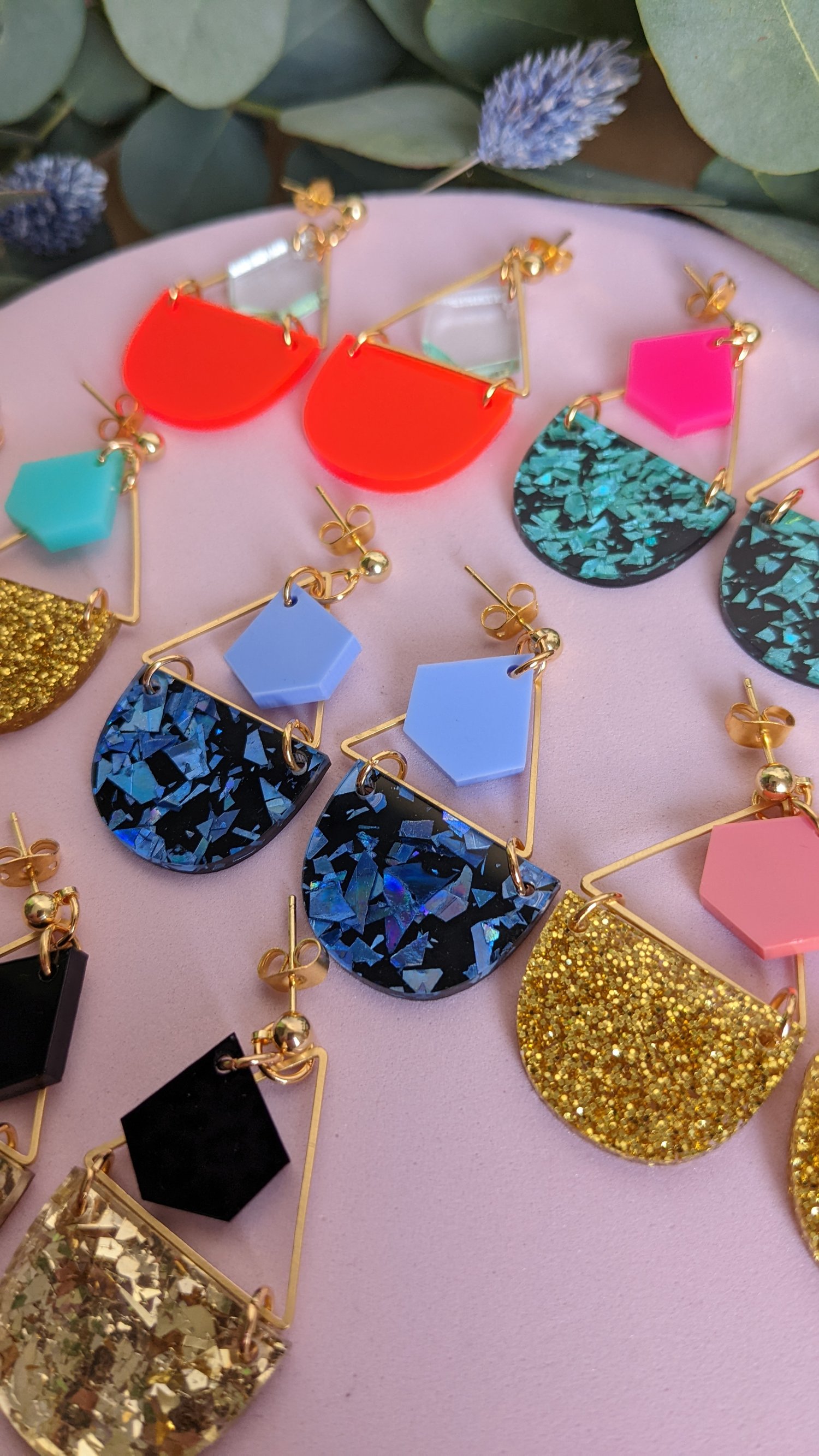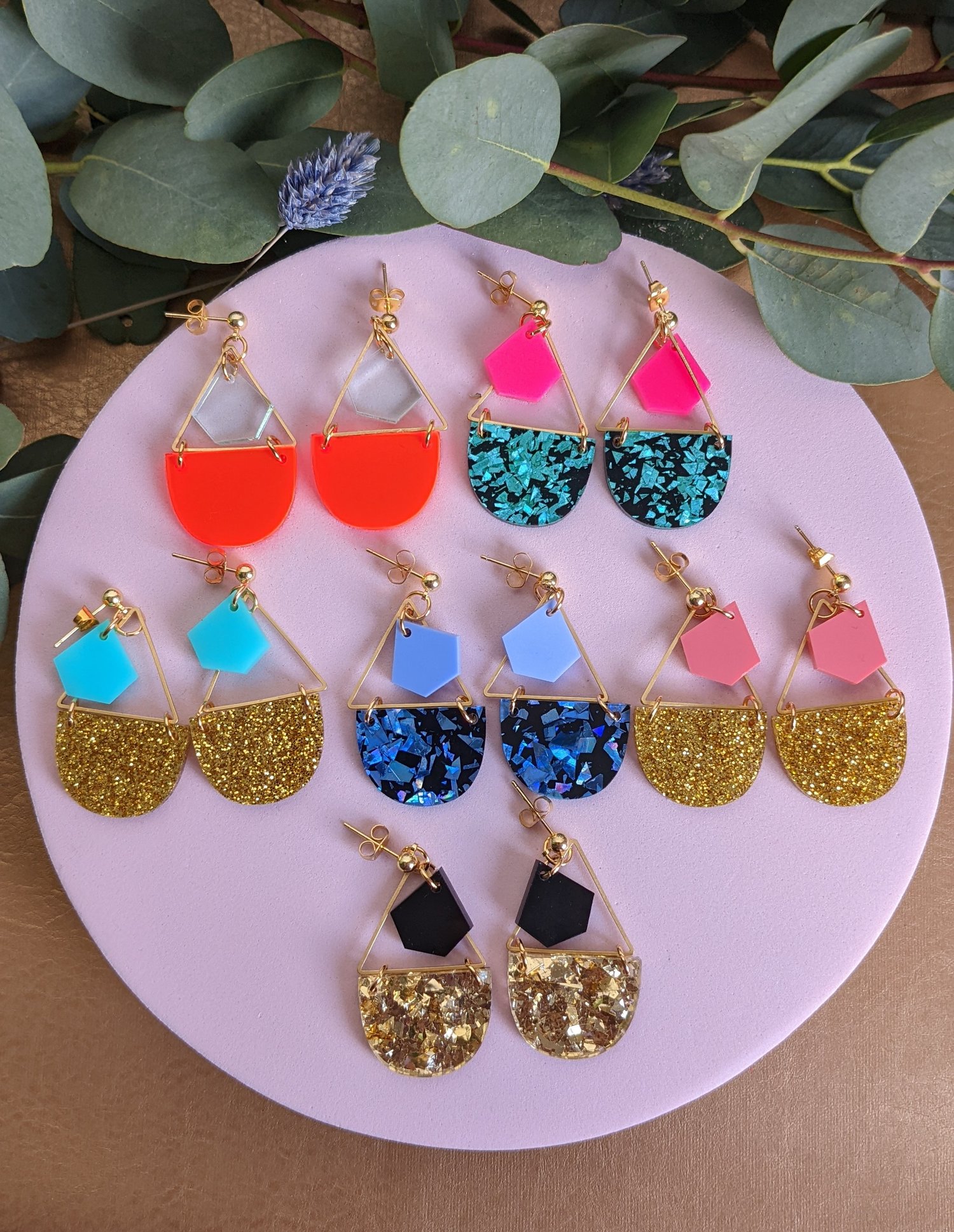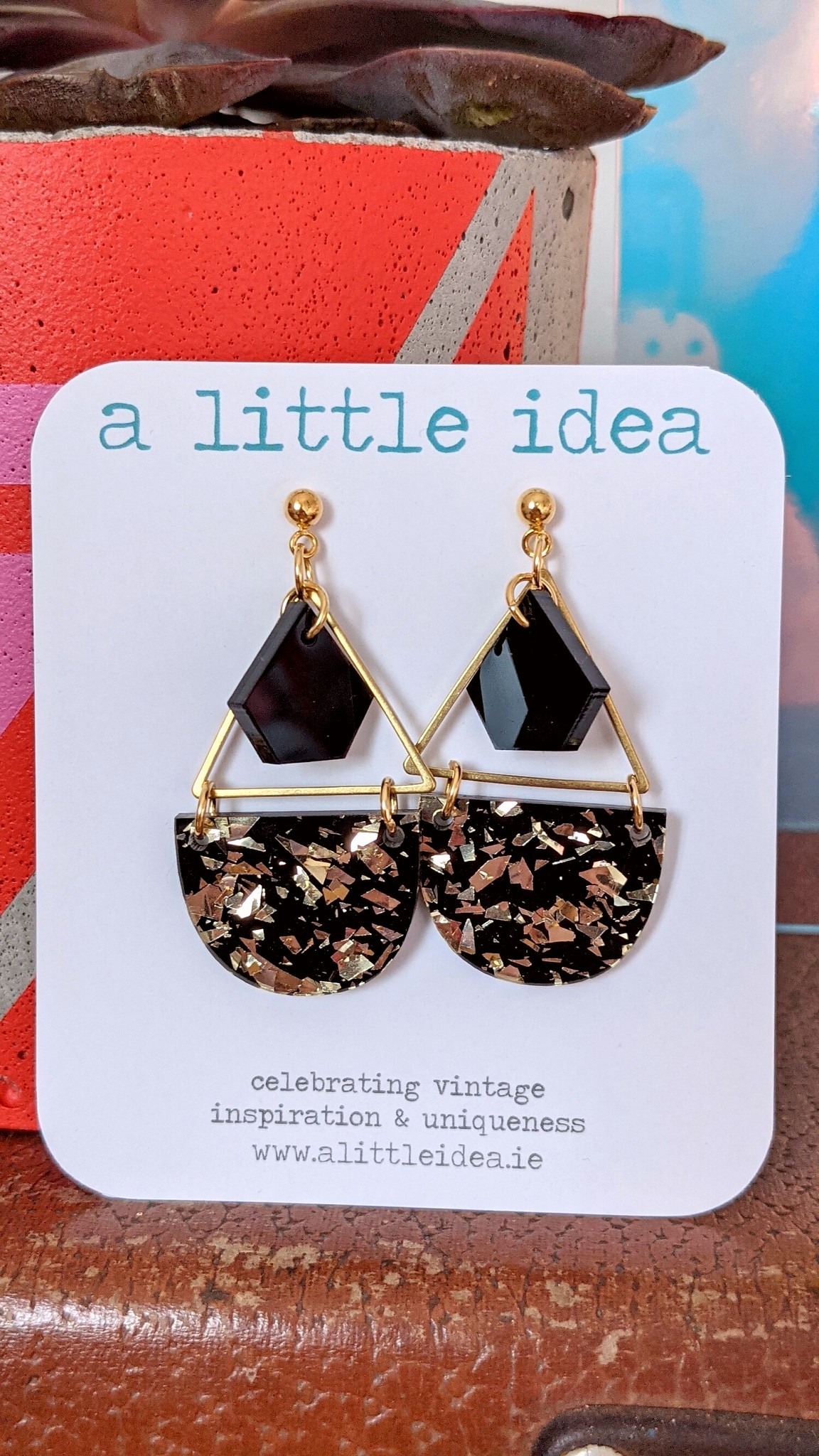 Laser Cut Acrylic statement earrings with mini diamond acrylic, semi circle acrylic & brass triangle .