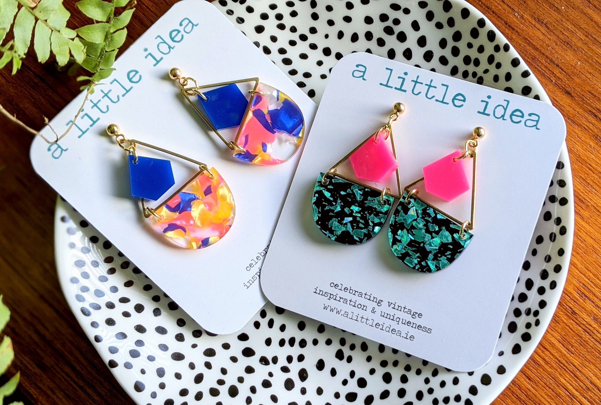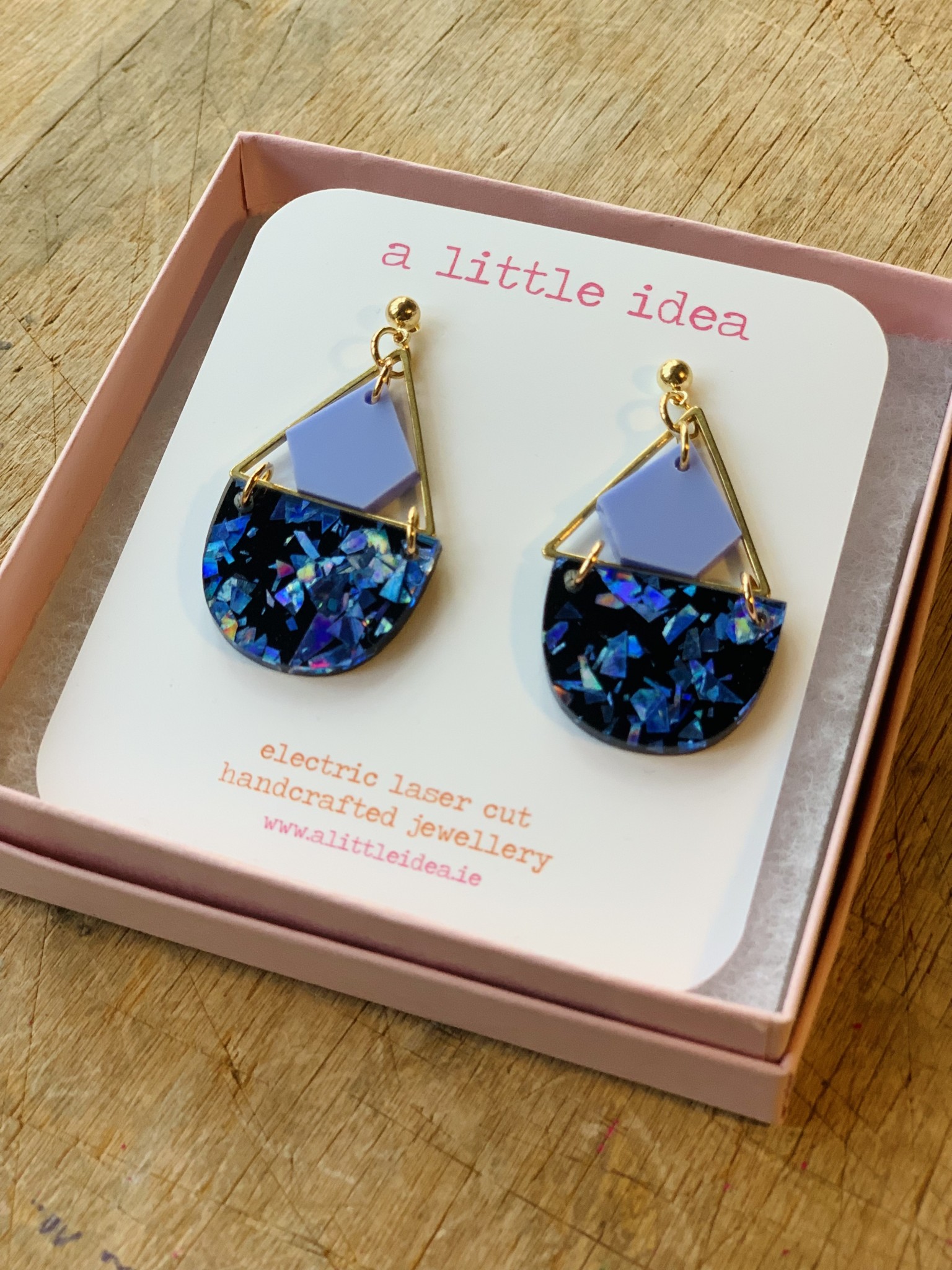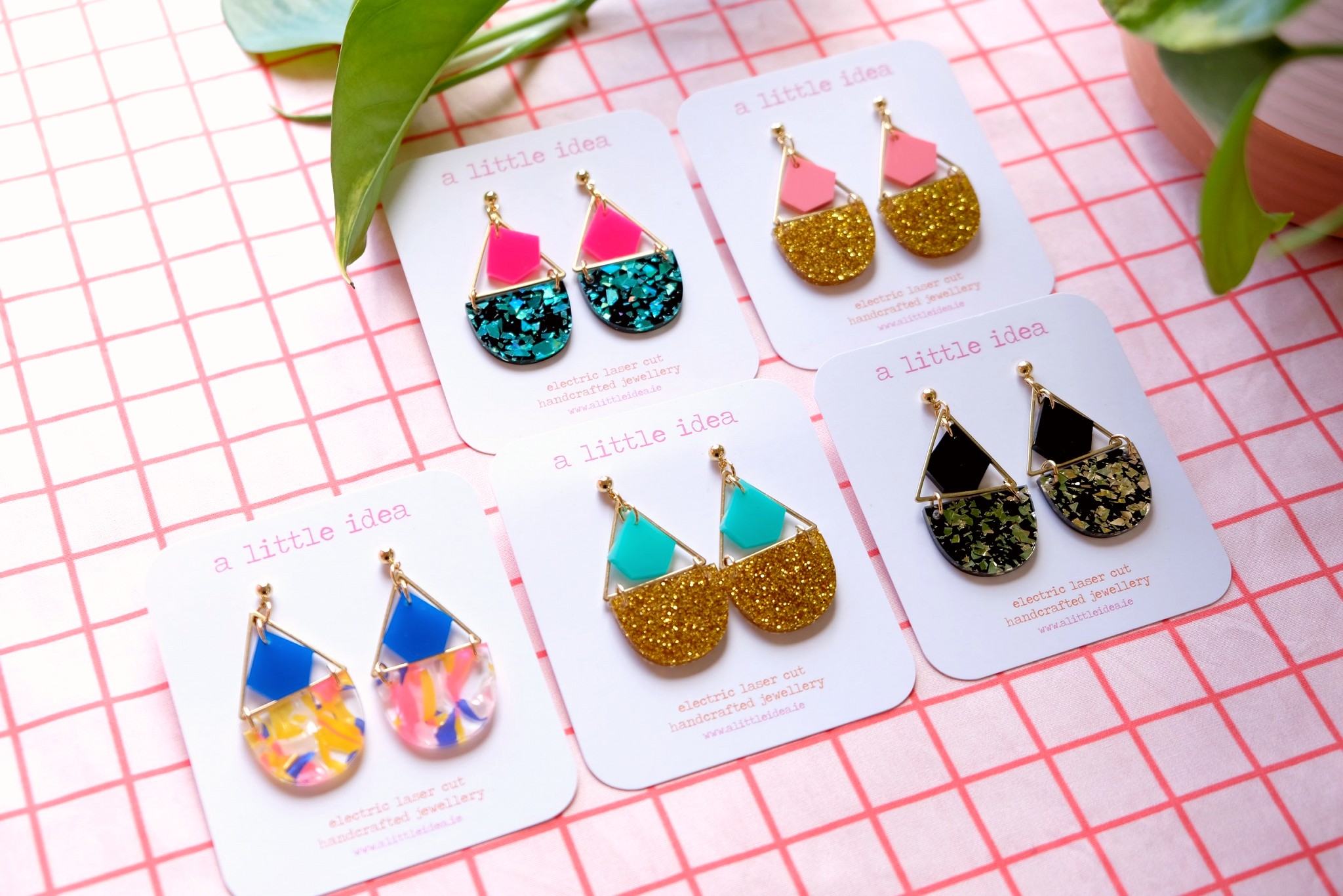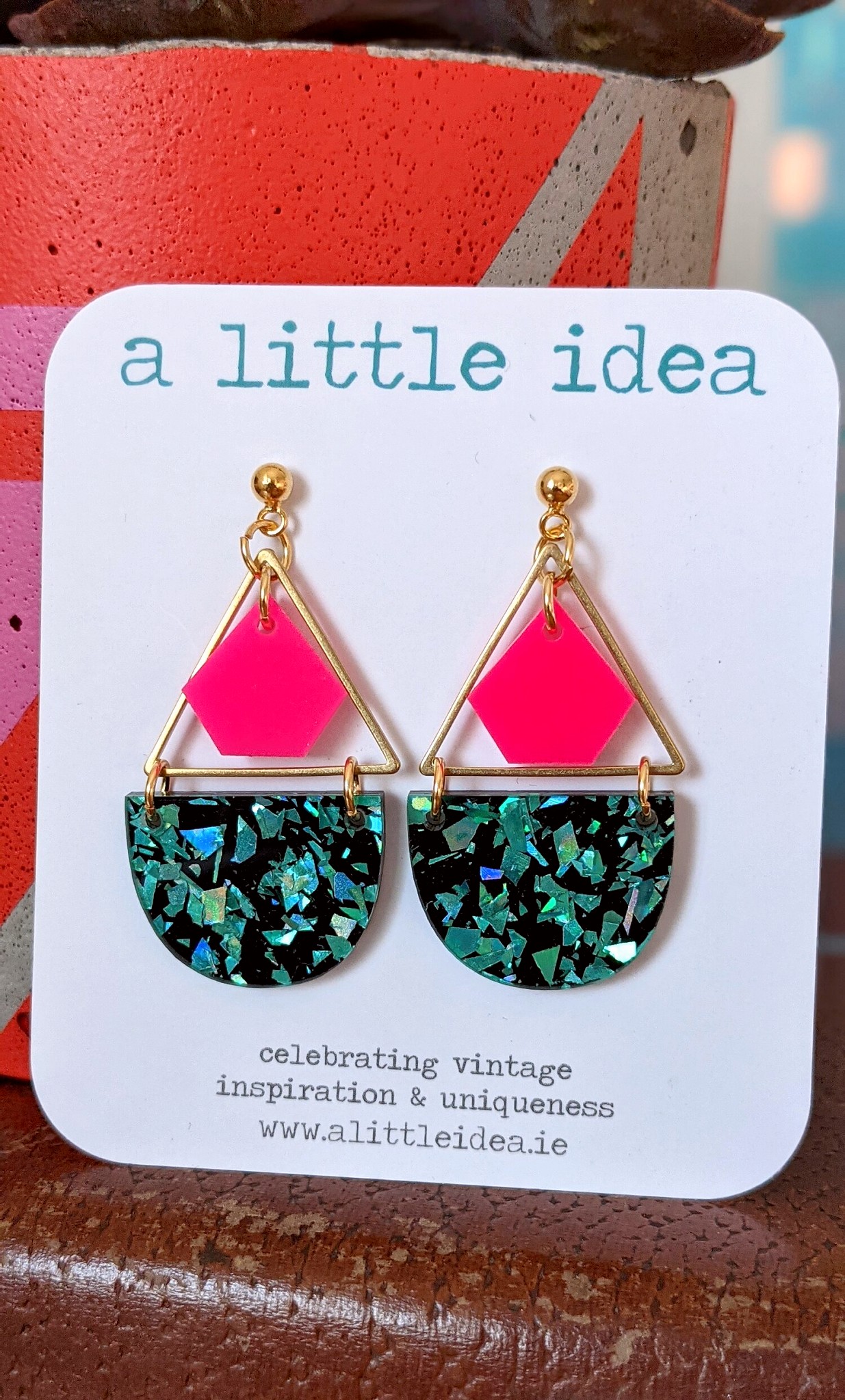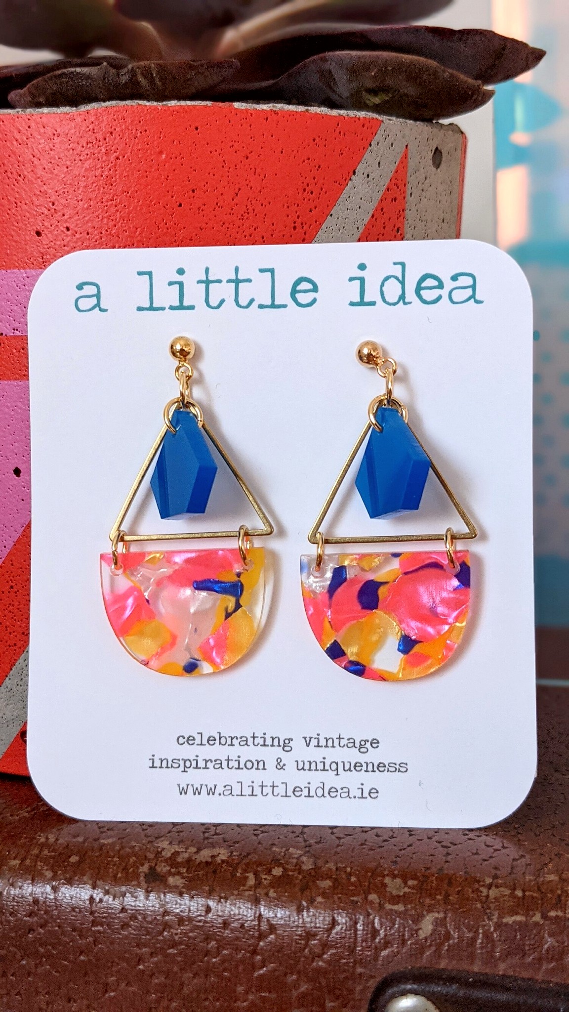 Laser Cut Acrylic statement earrings with mini diamond acrylic, semi circle acrylic & brass triangle .