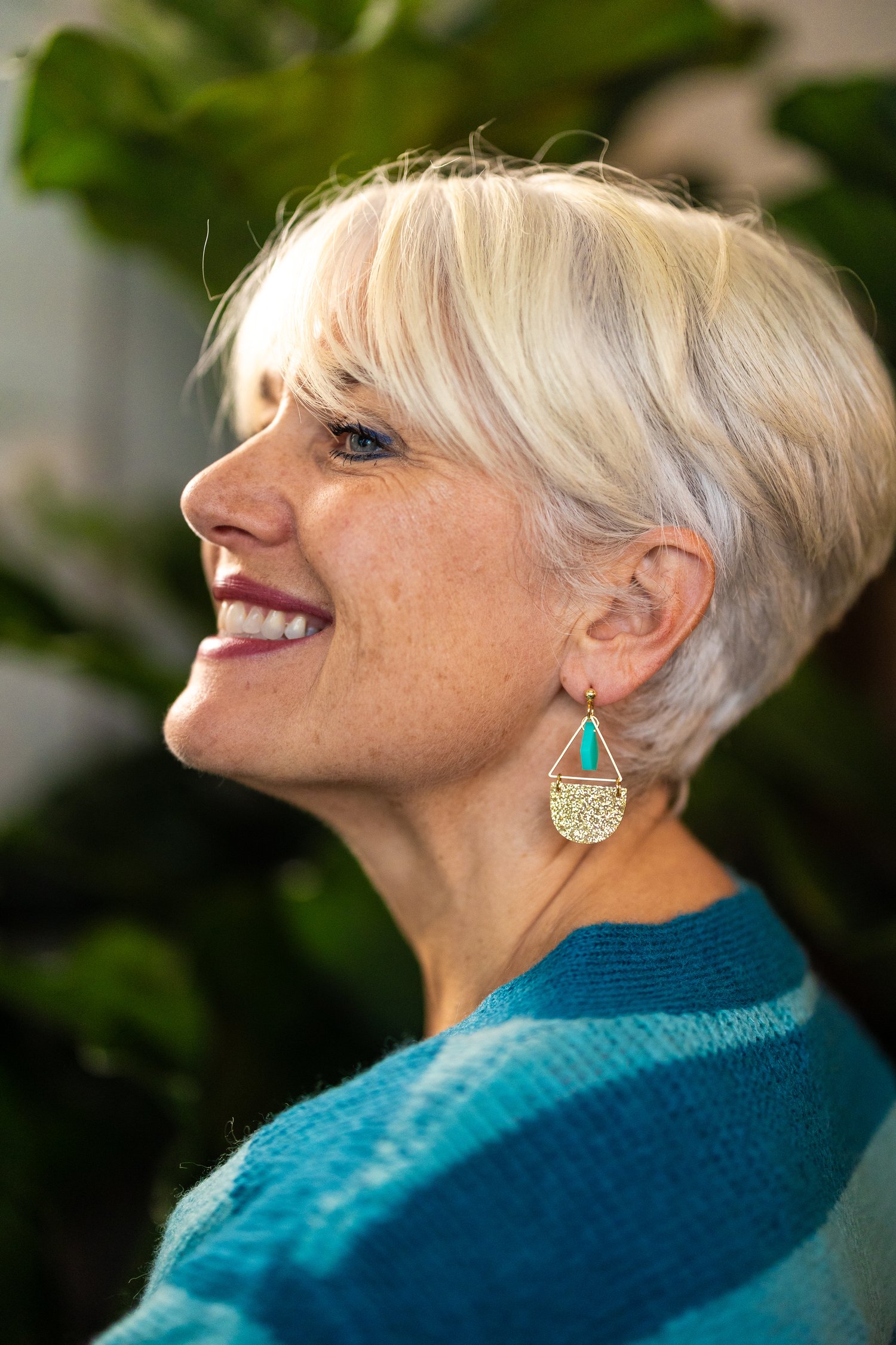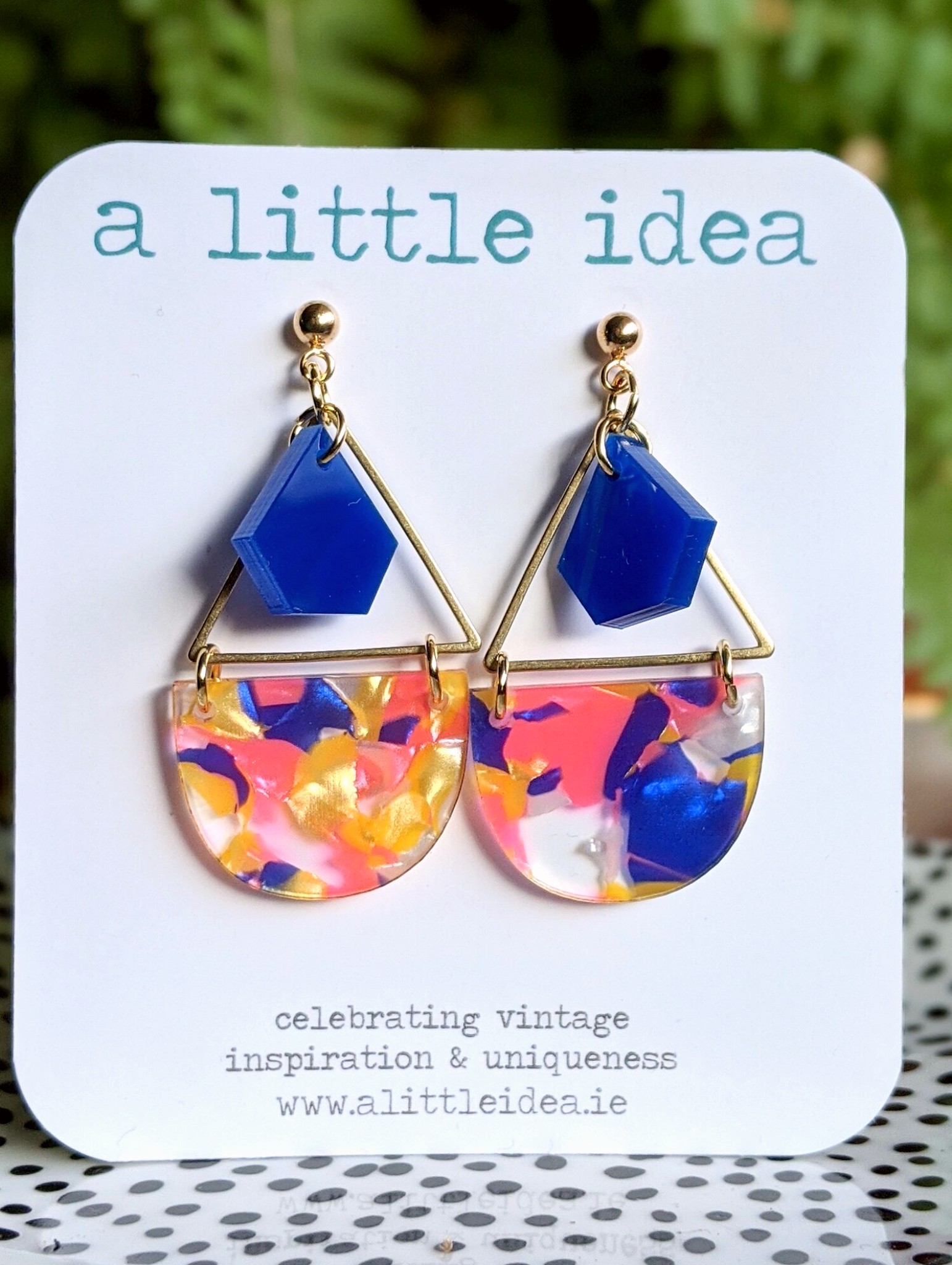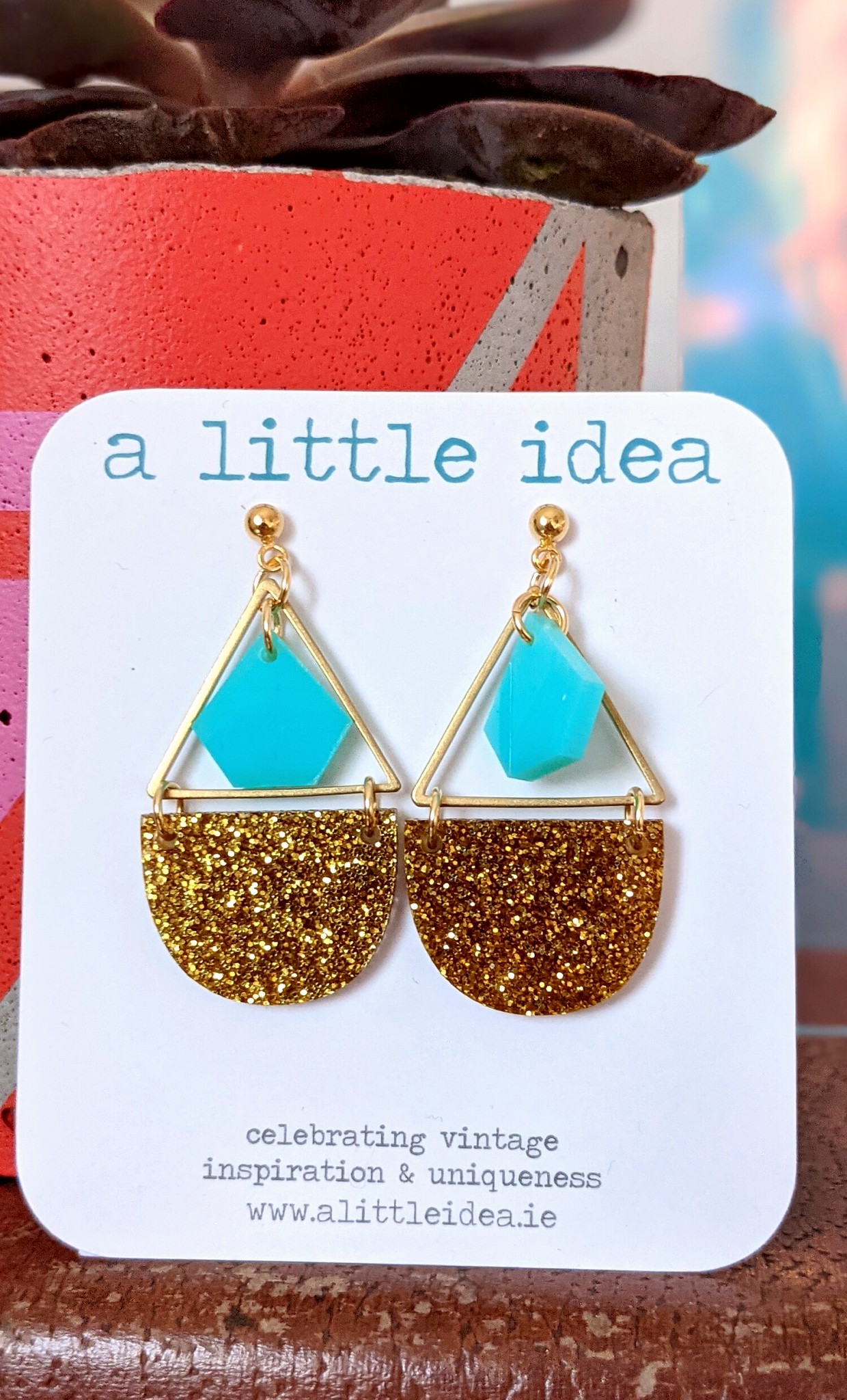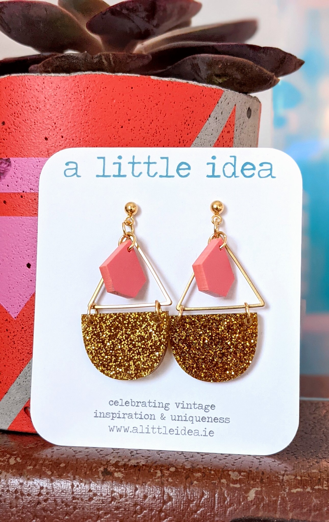 Laser Cut Acrylic statement earrings with mini diamond acrylic, semi circle acrylic & brass triangle .