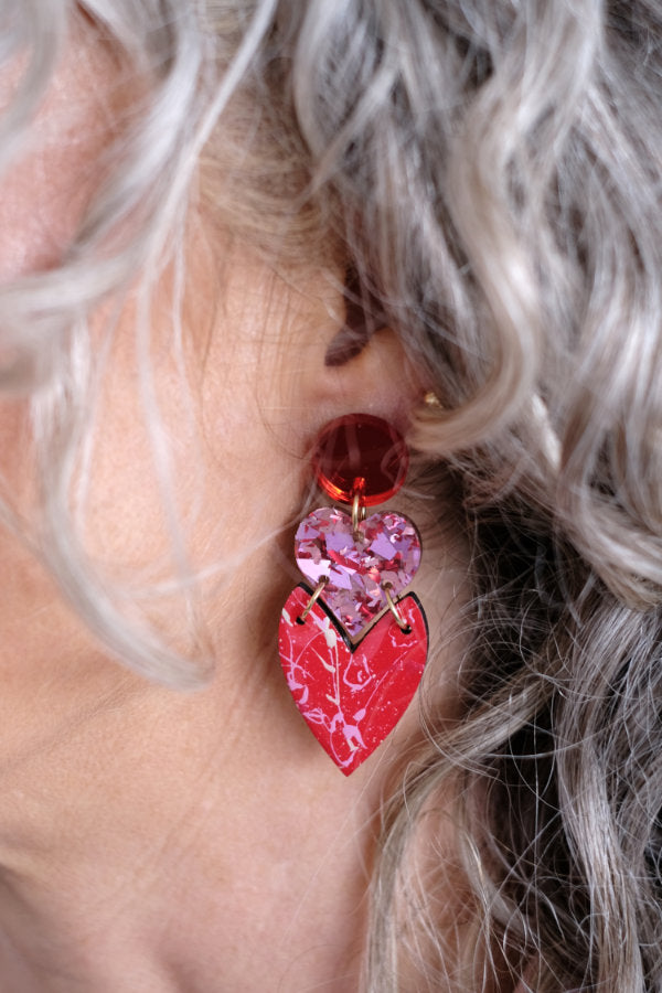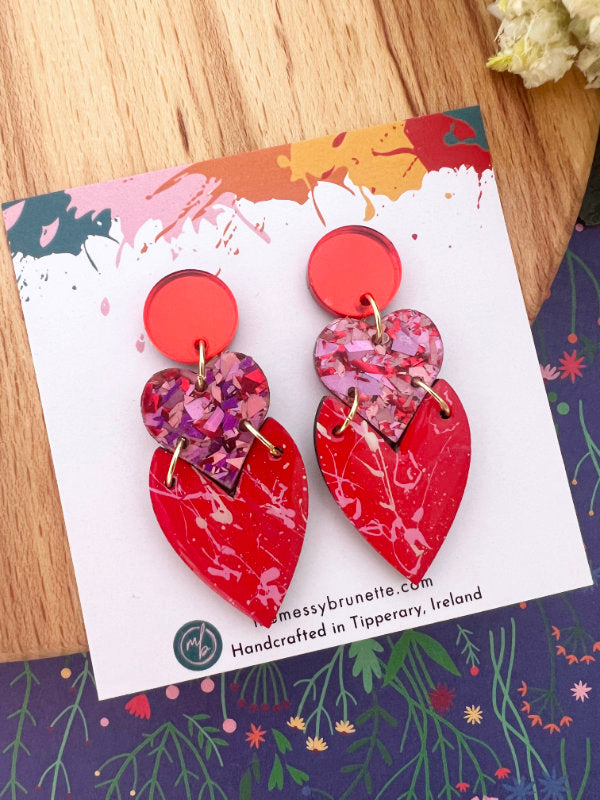 ► Red & Pink Mix: Marble red and pink hearts with mini hearts in iridescent pink, red and lavender layered shards, finished with red mirrored studs