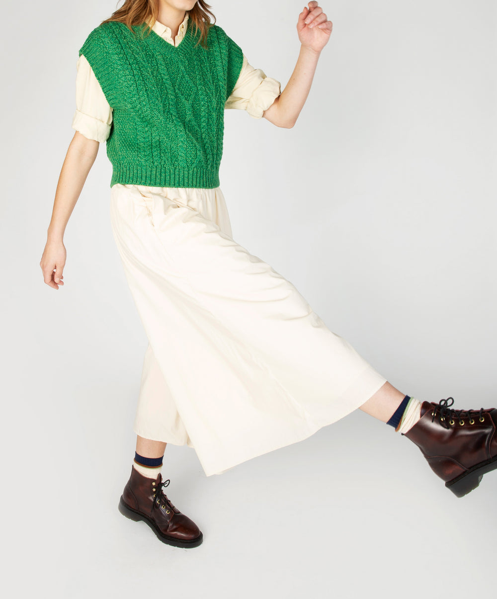 As part of their Blosson Collection, the Sweetpea V-Neck Diamond Vest fuses traditional Aran stitches with a playful, contemporary silhouette. In a very rich and dark navy blue colour, this 100% Merino wool garment is a neat, straight and cropped style, featuring a rich Aran pattern of diamond, cable and moss stitches. Perfect as a statement piece or a layering addition to your look.