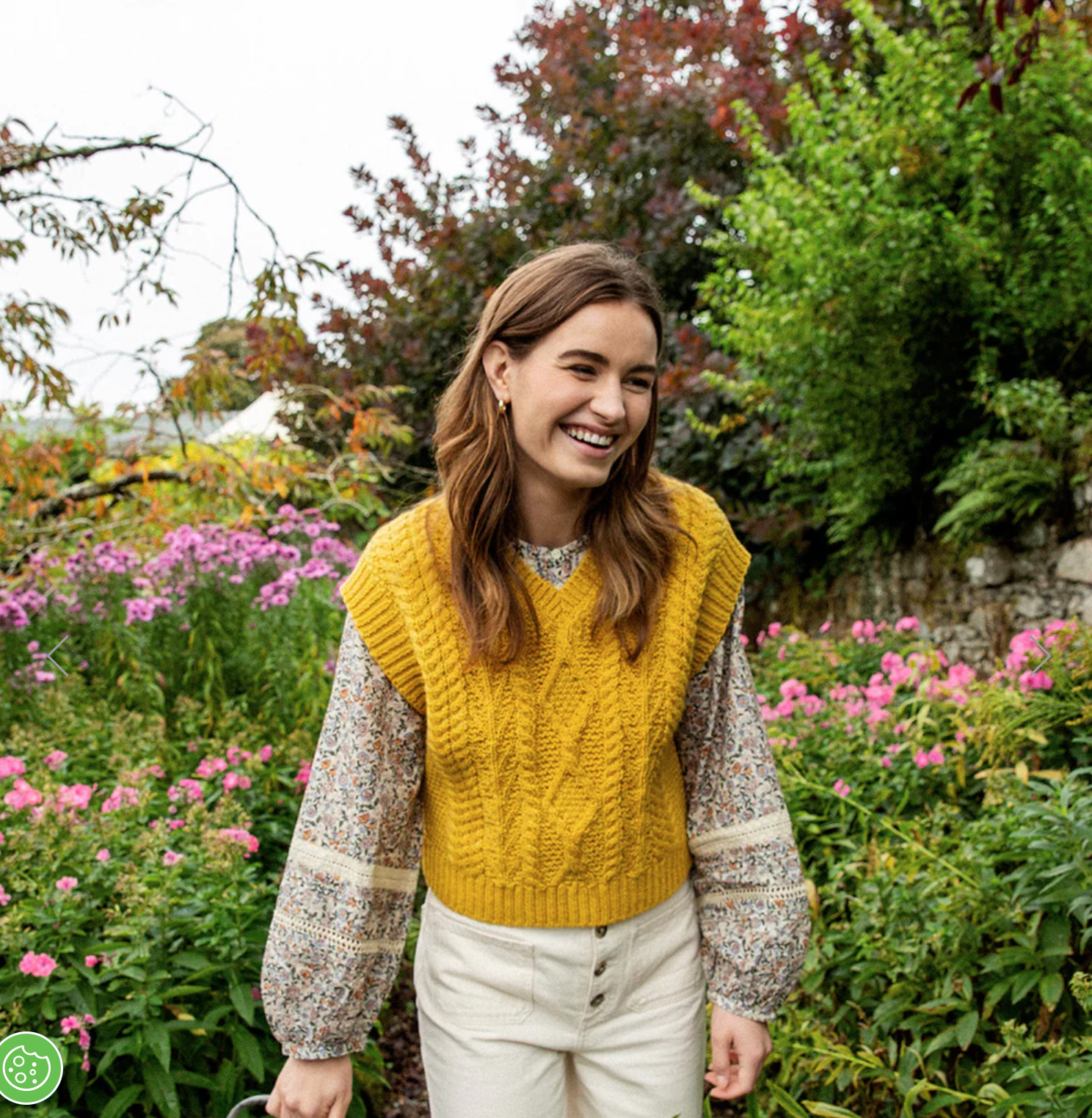 As part of their Blosson Collection, the Sweetpea V-Neck Diamond Vest fuses traditional Aran stitches with a playful, contemporary silhouette. In a very rich and dark navy blue colour, this 100% Merino wool garment is a neat, straight and cropped style, featuring a rich Aran pattern of diamond, cable and moss stitches. Perfect as a statement piece or a layering addition to your look.