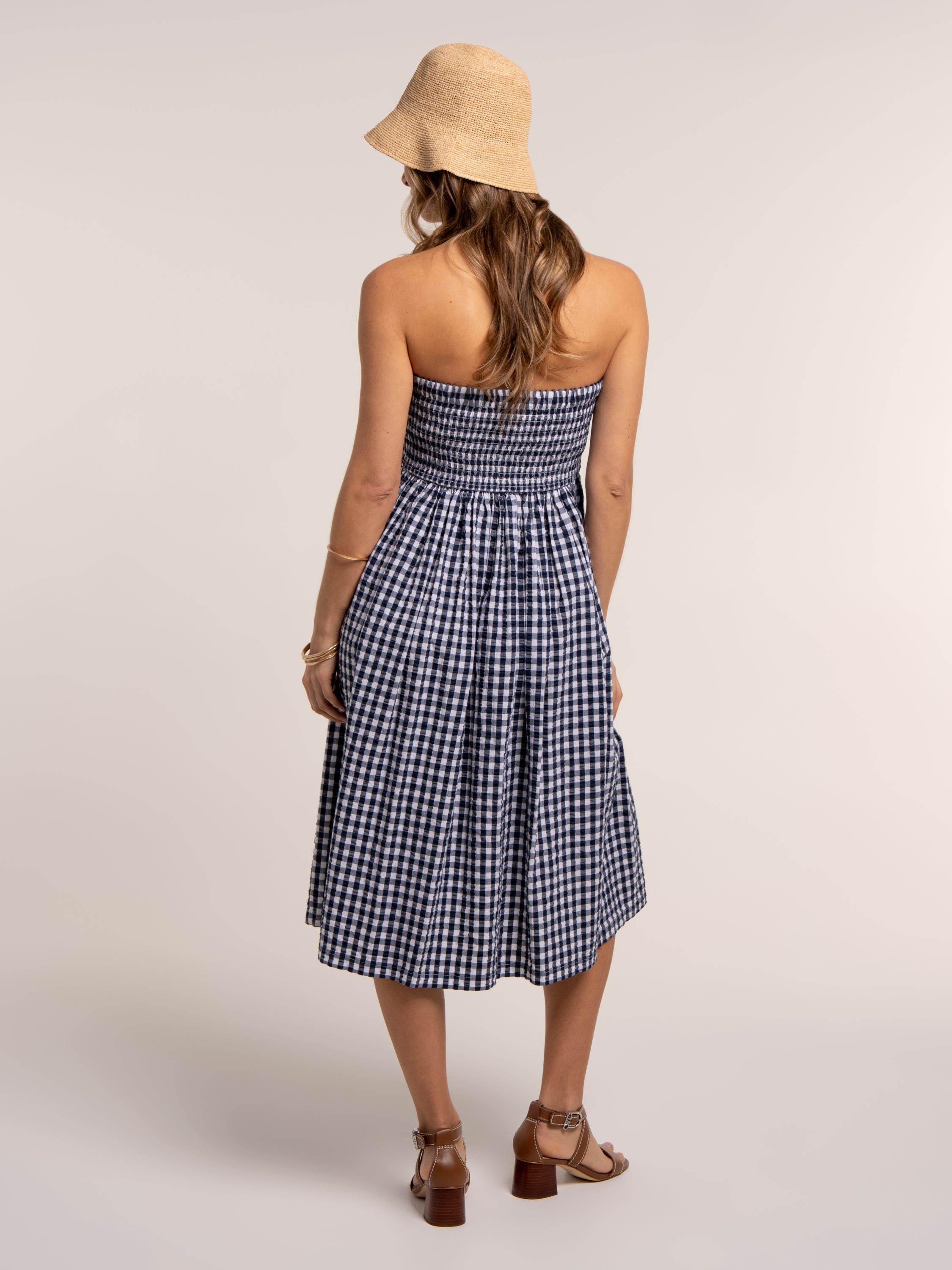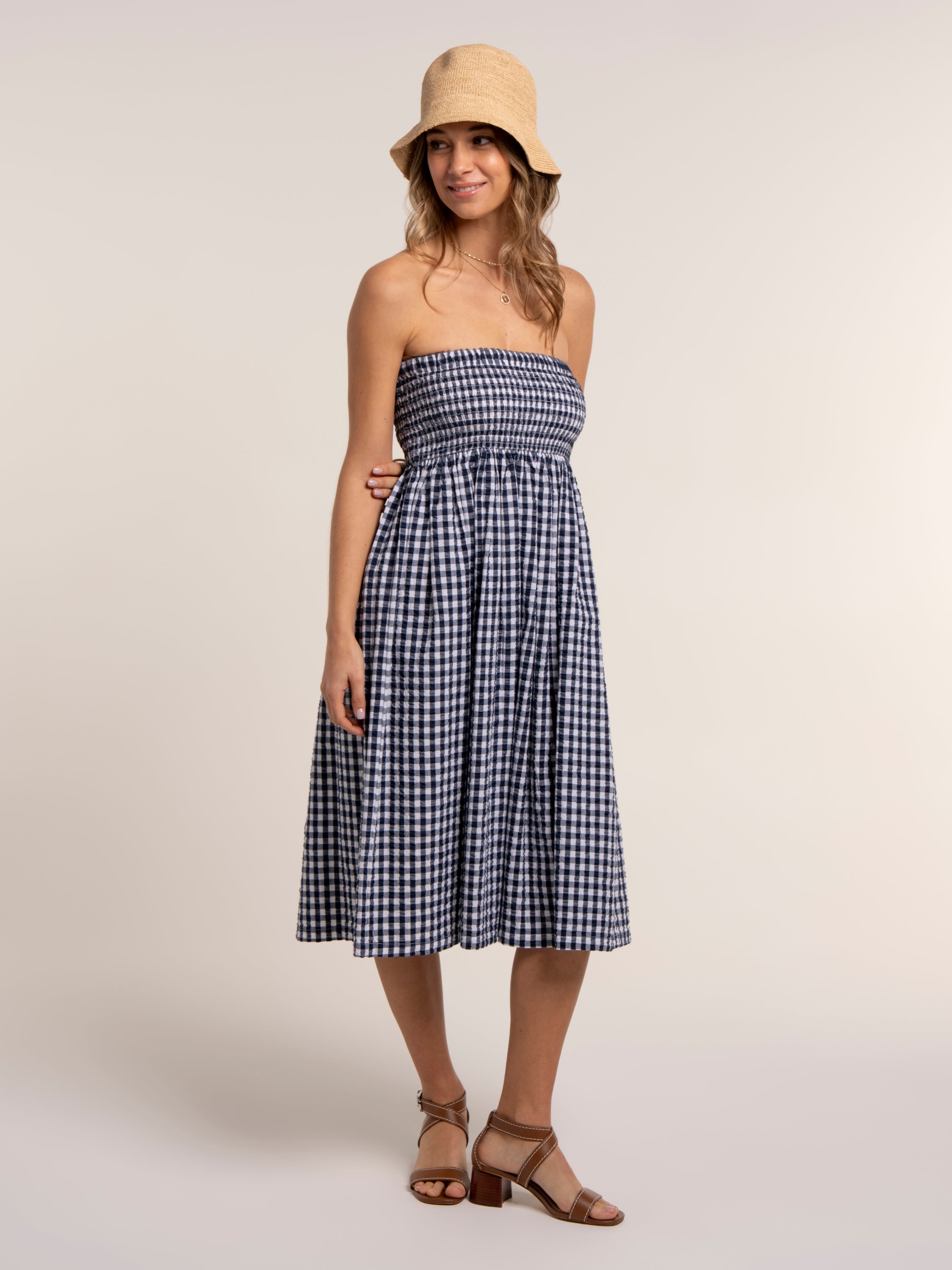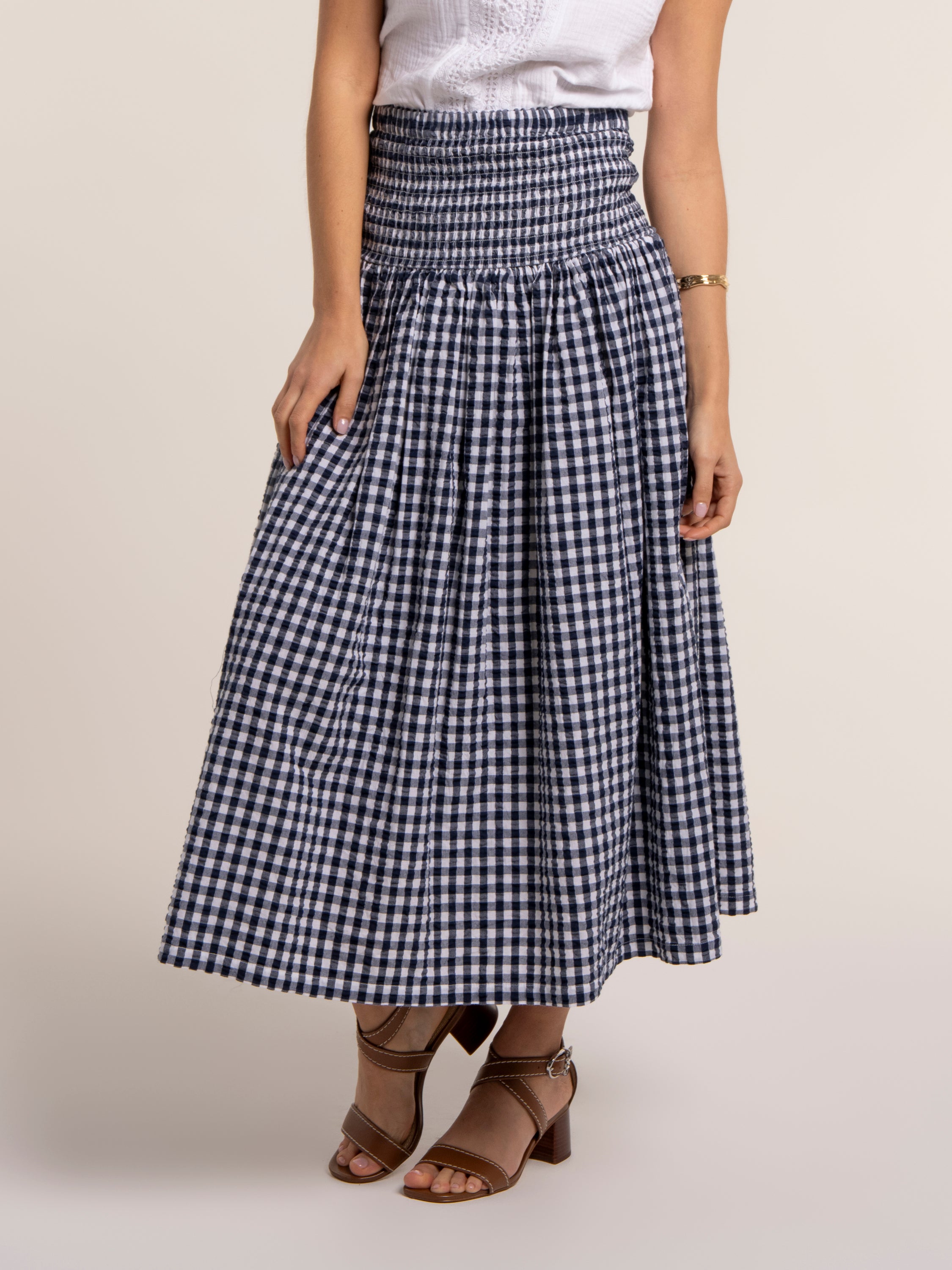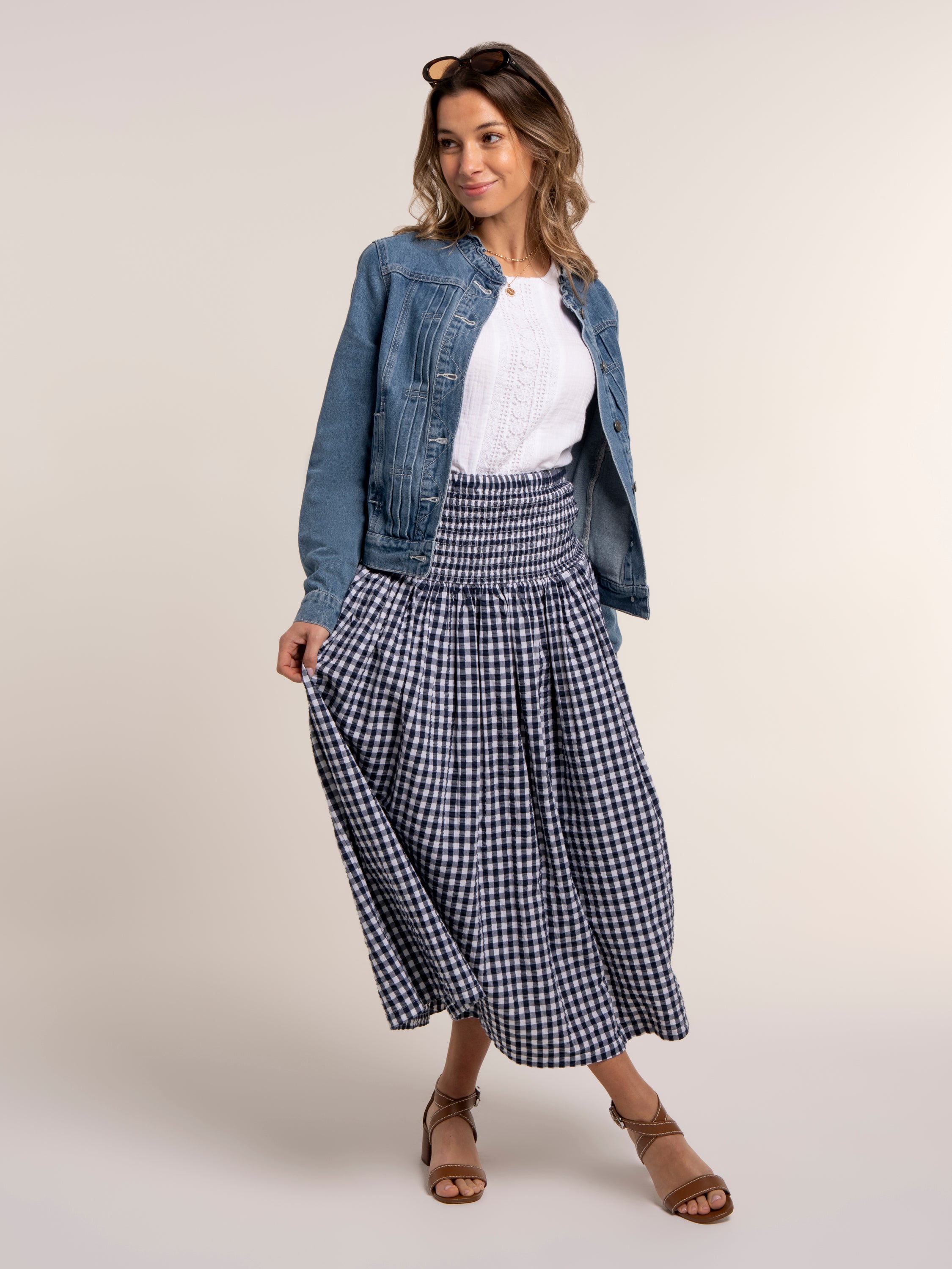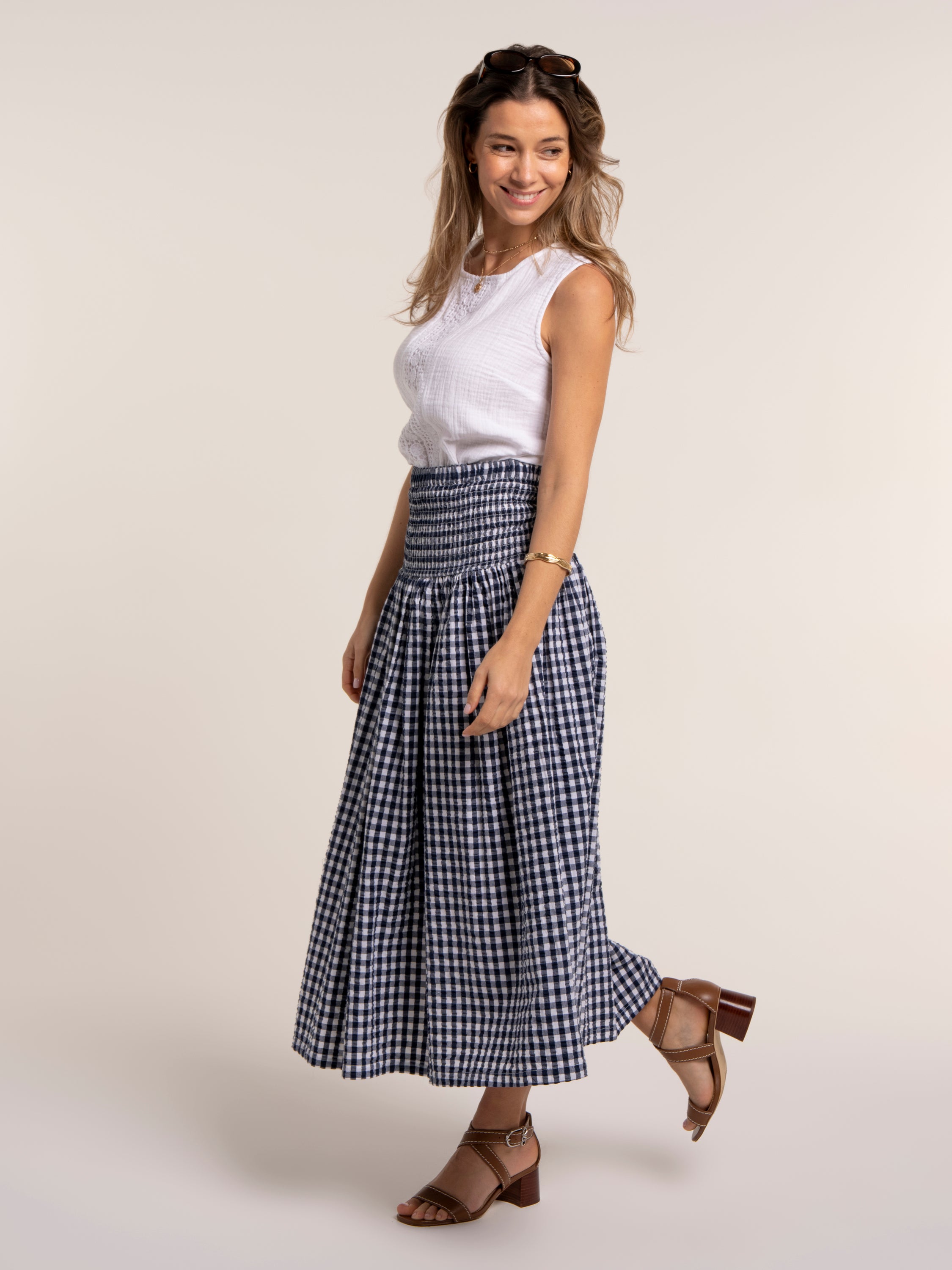 Say hello to your new holiday hero. Our Gingham Teresa is the best of both worlds: wear it as an on-trend maxi skirt with a deep shirred waistband sitting neatly on the hips, or style it as a knee-length dress with the shirring as a fitted bodice and a relaxed, flowing skirt. For a co-ord wear with our Bia blouse. Lightweight and easy to pack, it’s perfect for sun-soaked days. Pair with wedges or flip-flops.
