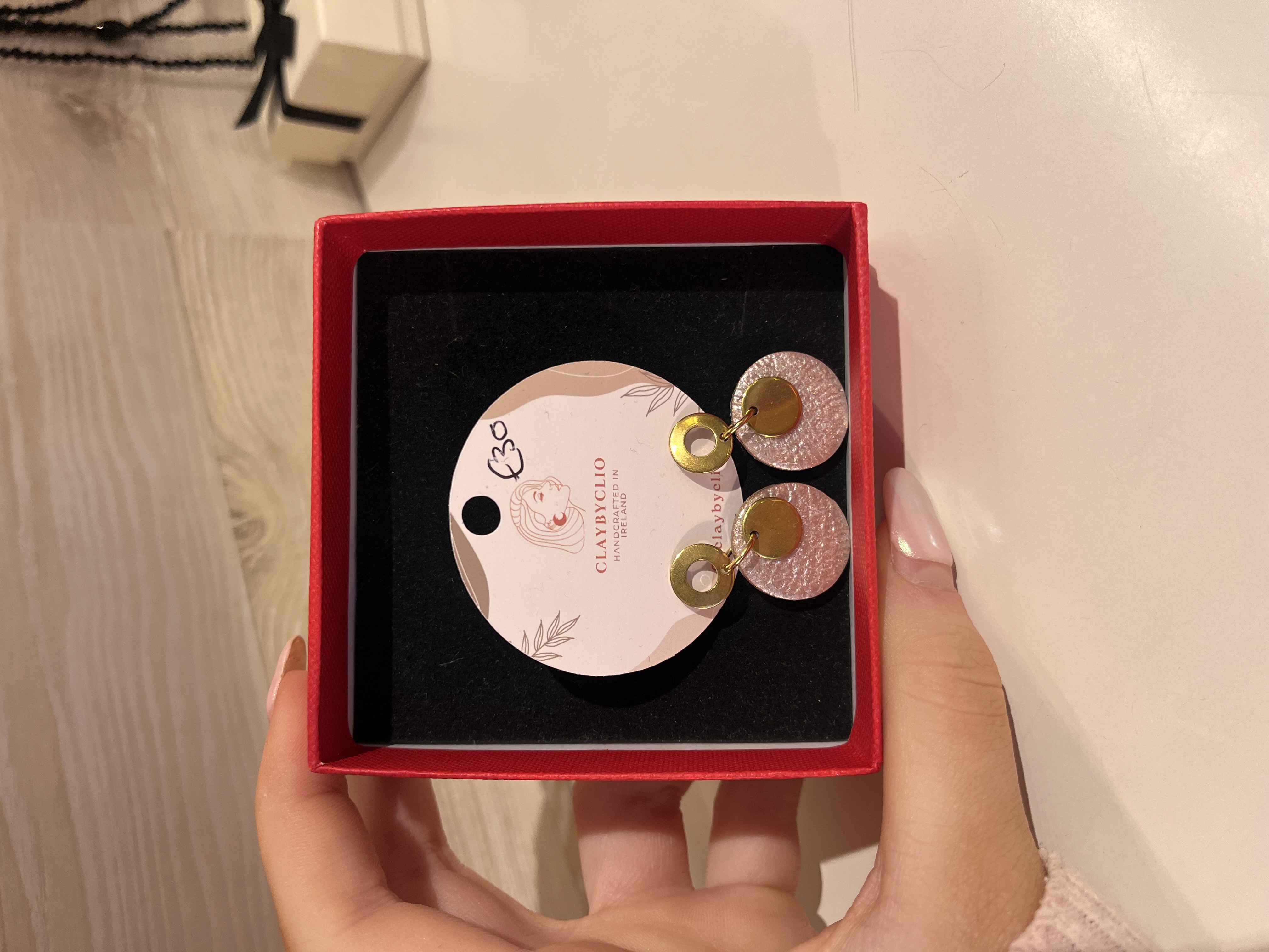 She makes these gorgous earrings in very small batches to keep them unique. Clio works with polymer clay and says to always store them in a box if traveling to protect, never stack or crush. The fixings and findings are all made from stainless steel. Comes in these gorgeous black gift boxes.