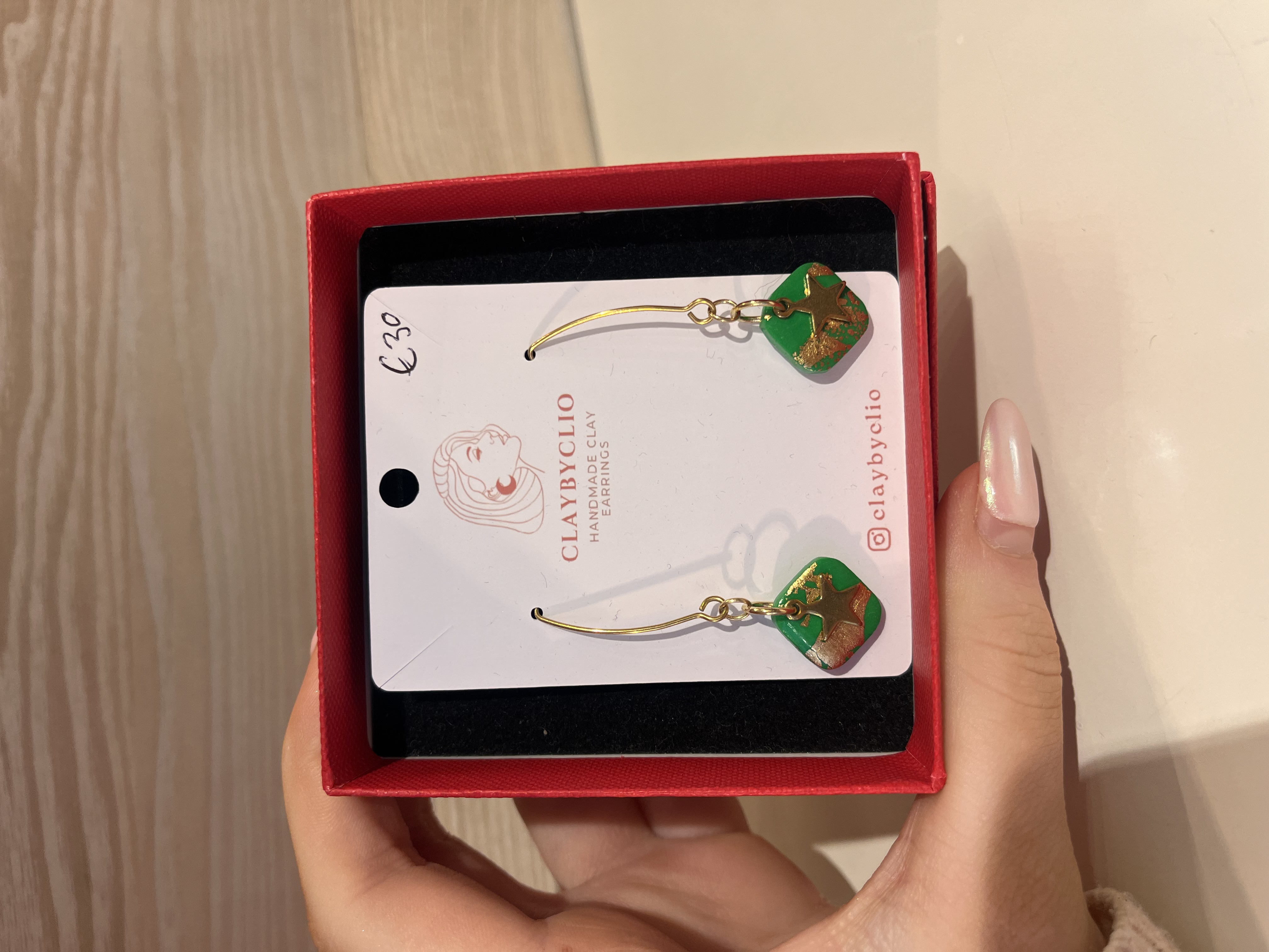 She makes these gorgous earrings in very small batches to keep them unique. Clio works with polymer clay and says to always store them in a box if traveling to protect, never stack or crush. The fixings and findings are all made from stainless steel. Comes in these gorgeous black gift boxes.
