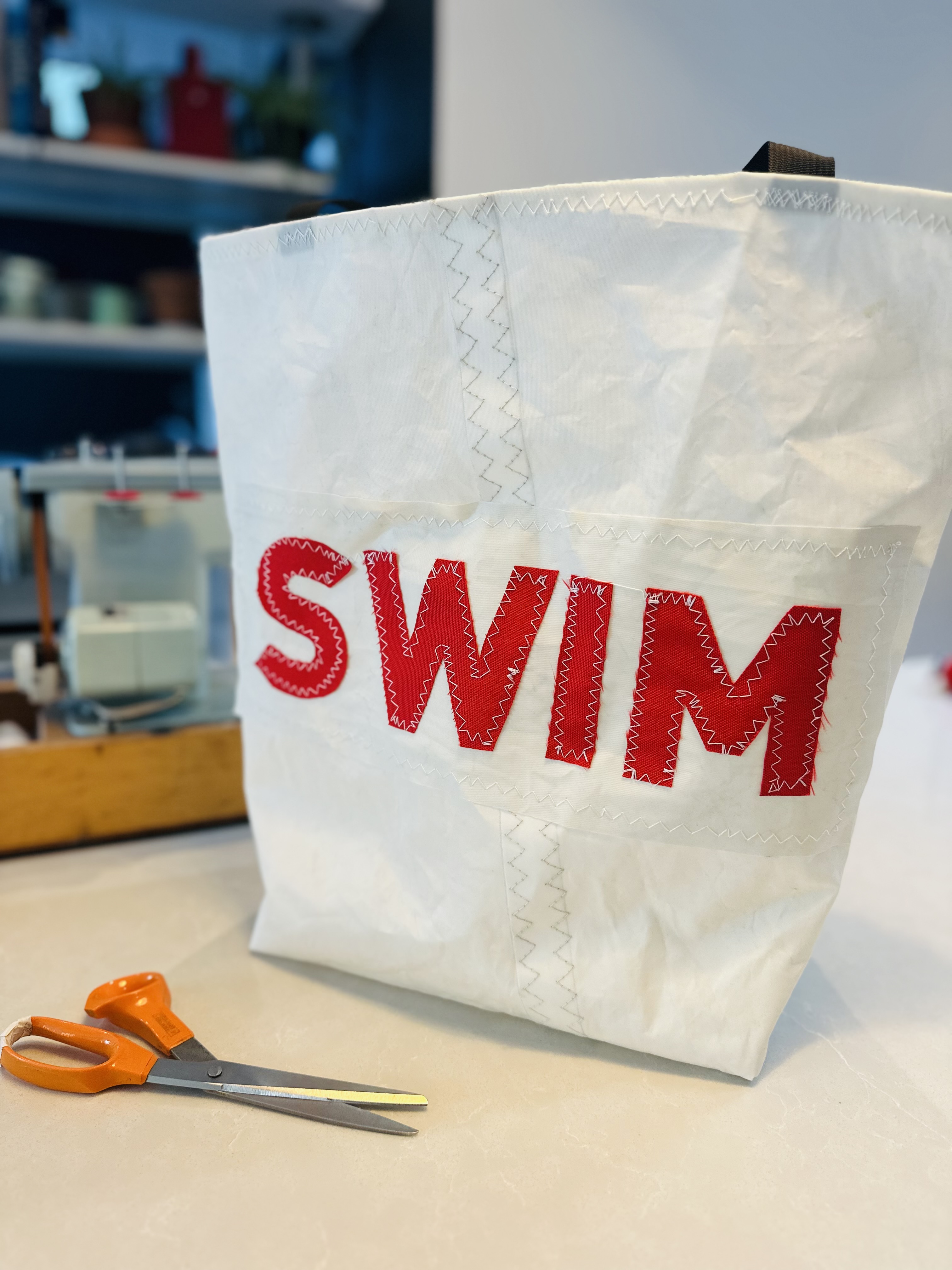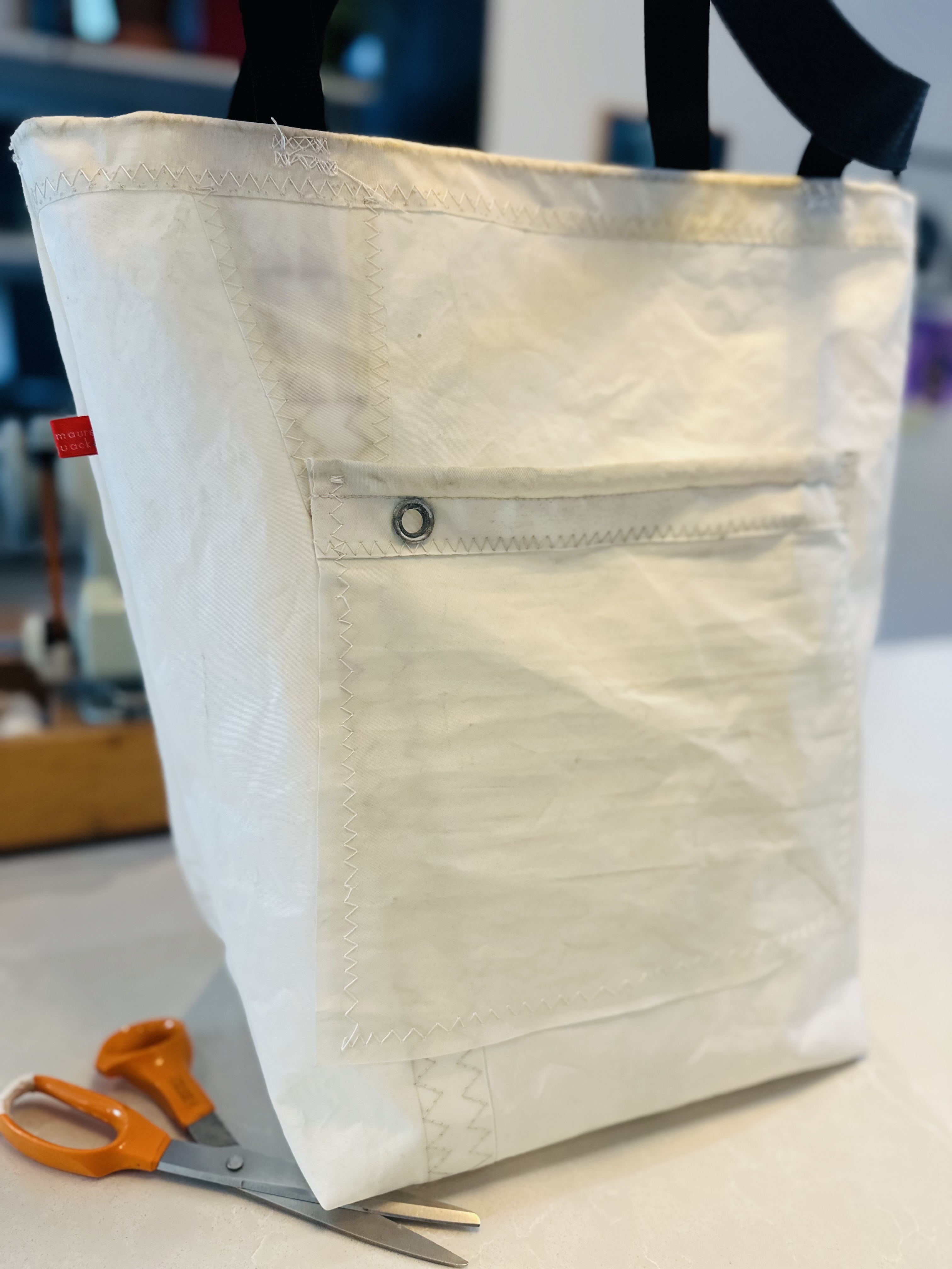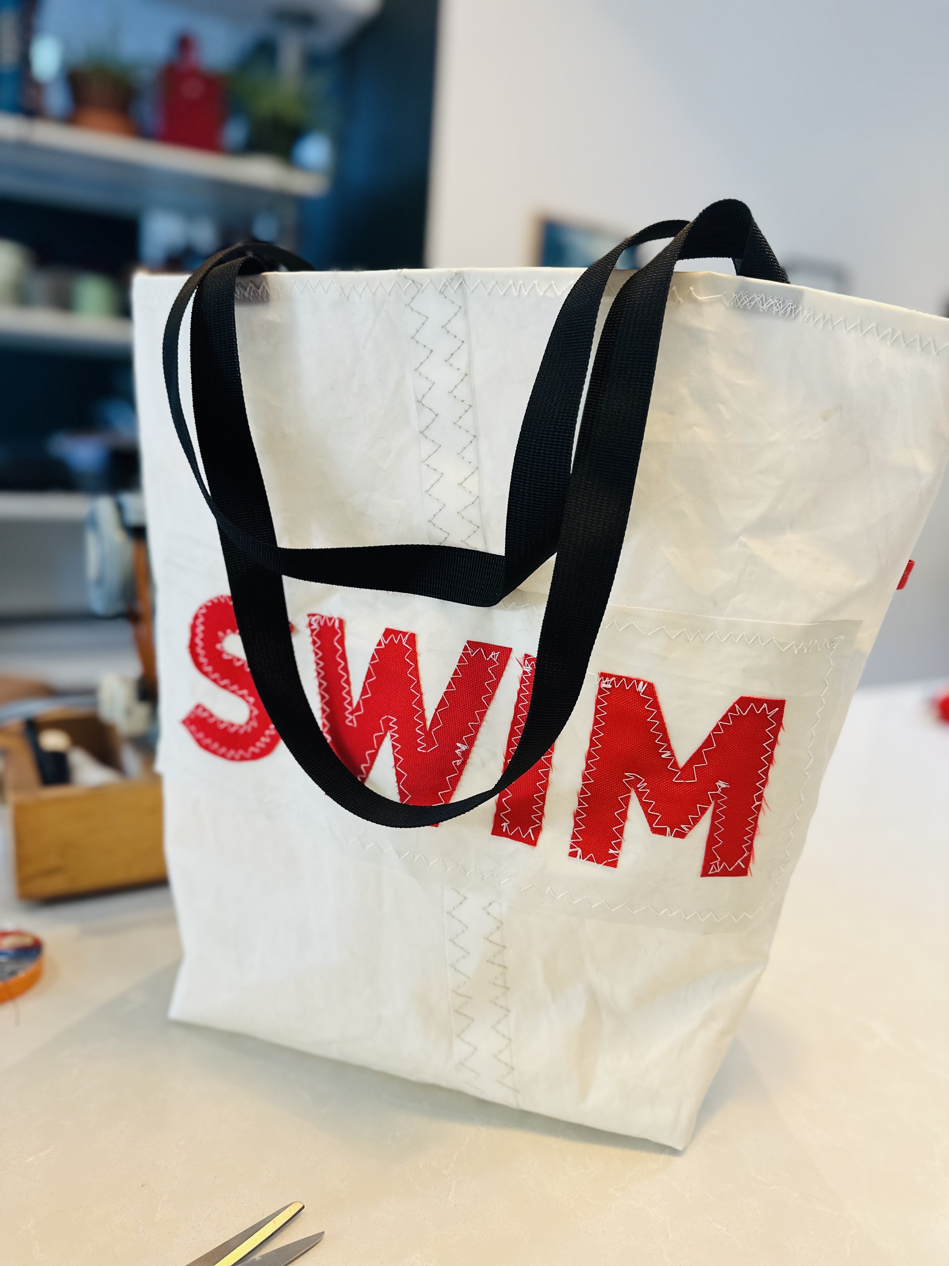 Large sail/ swimming bag, perfect for outdoor and indoor swimming....Made from a sail taken off my pals boat (a Howth 17). There may be small marks or rust stains..this is because it it a genuine recycled sail.