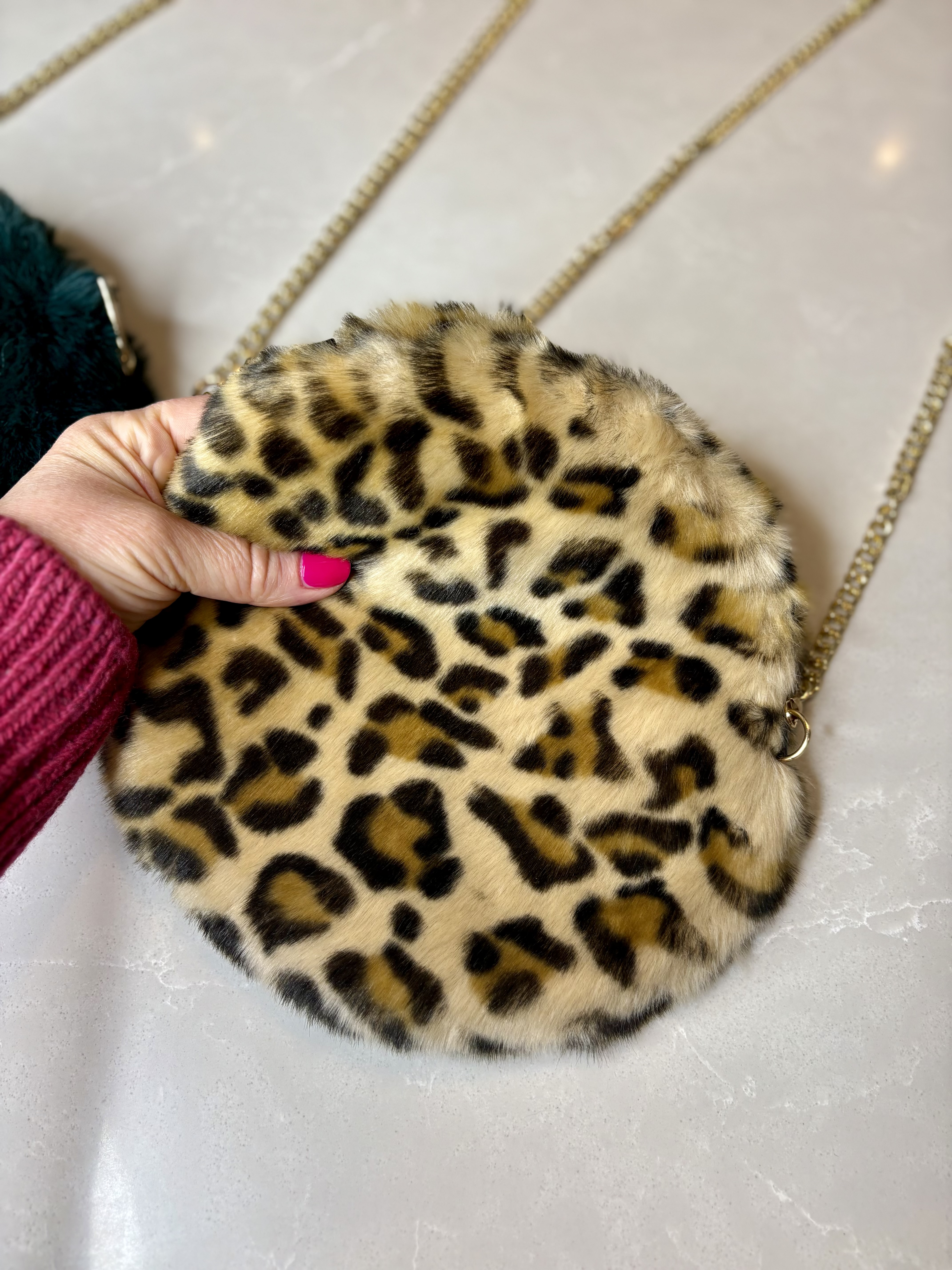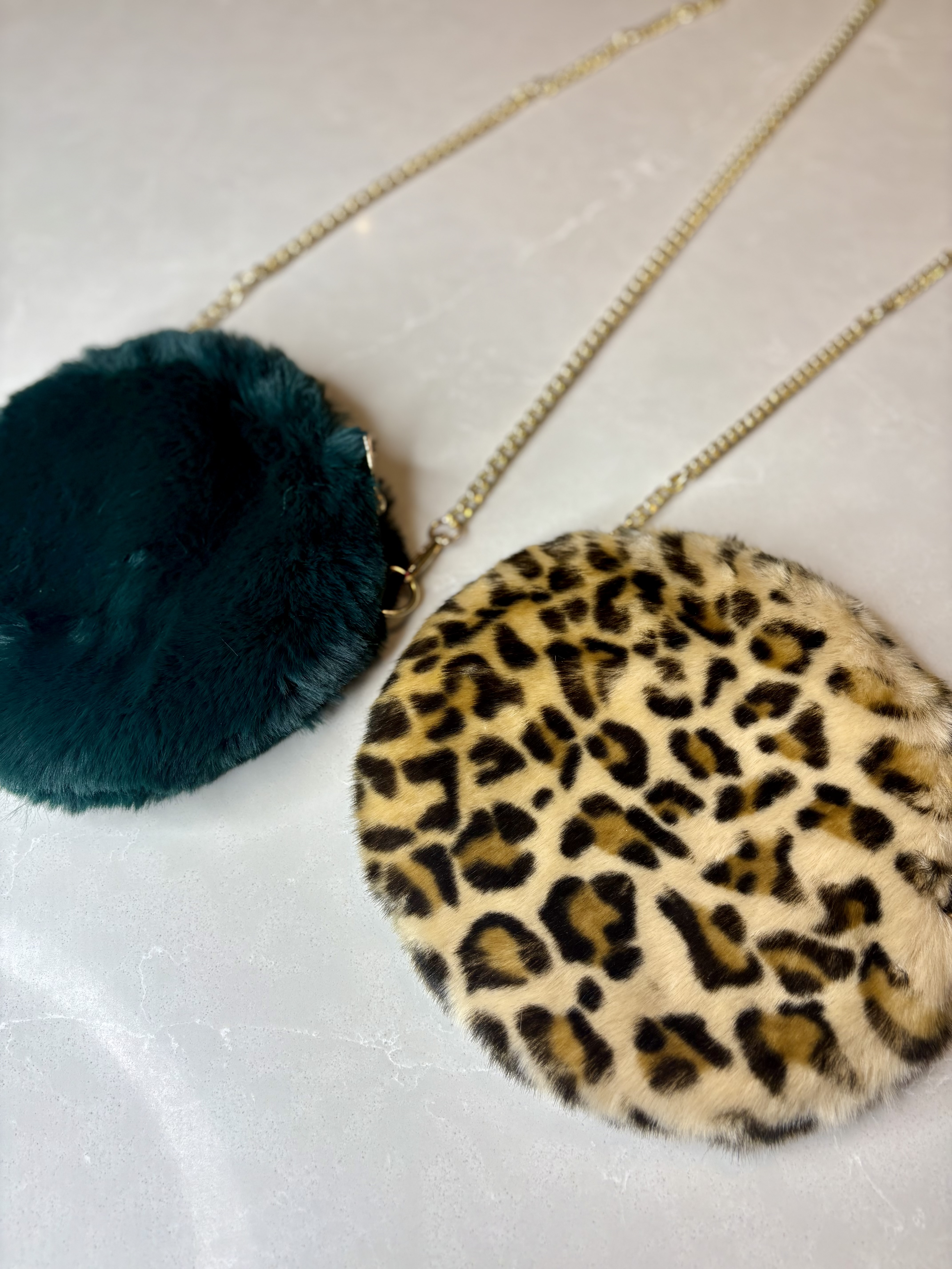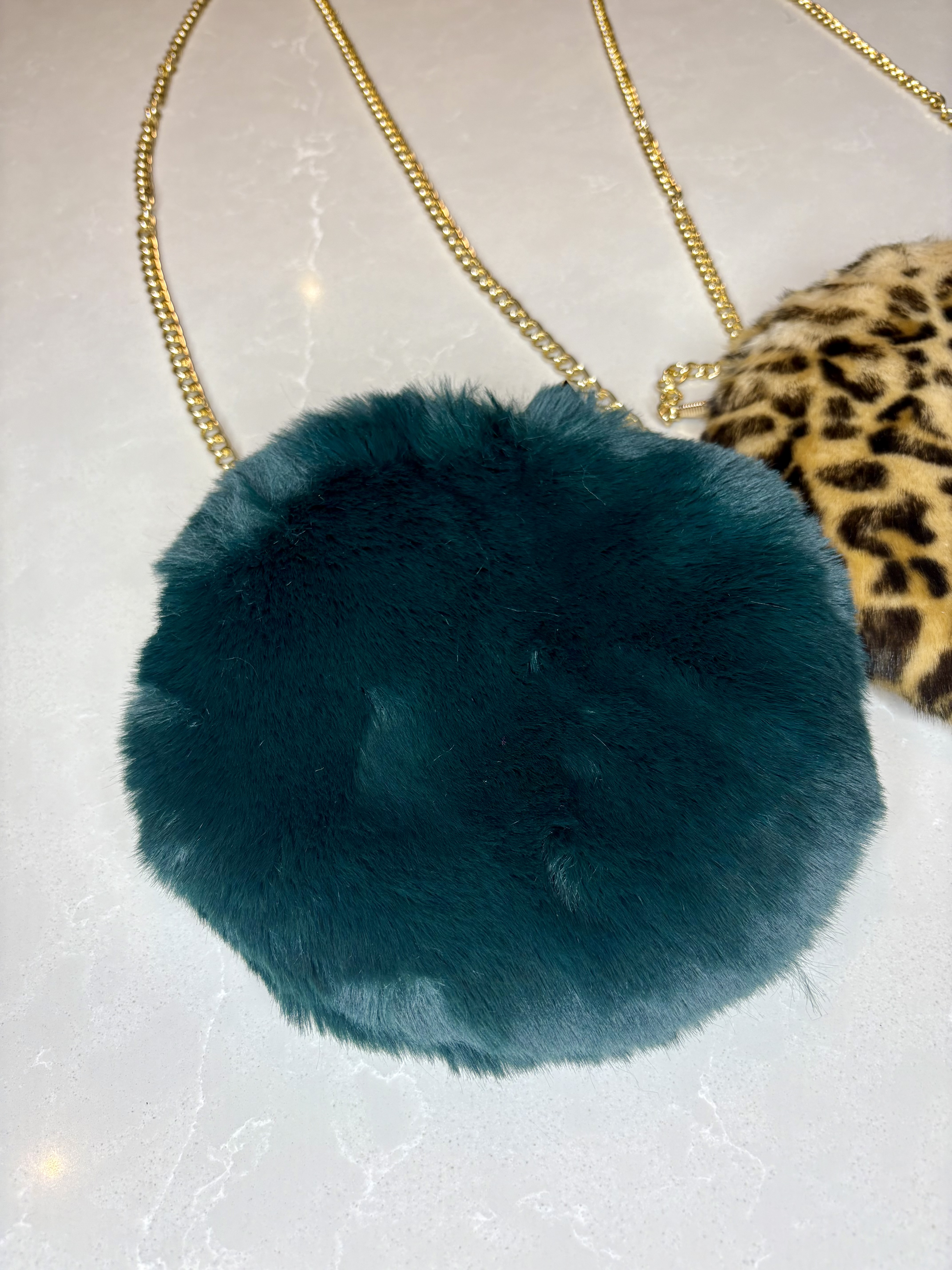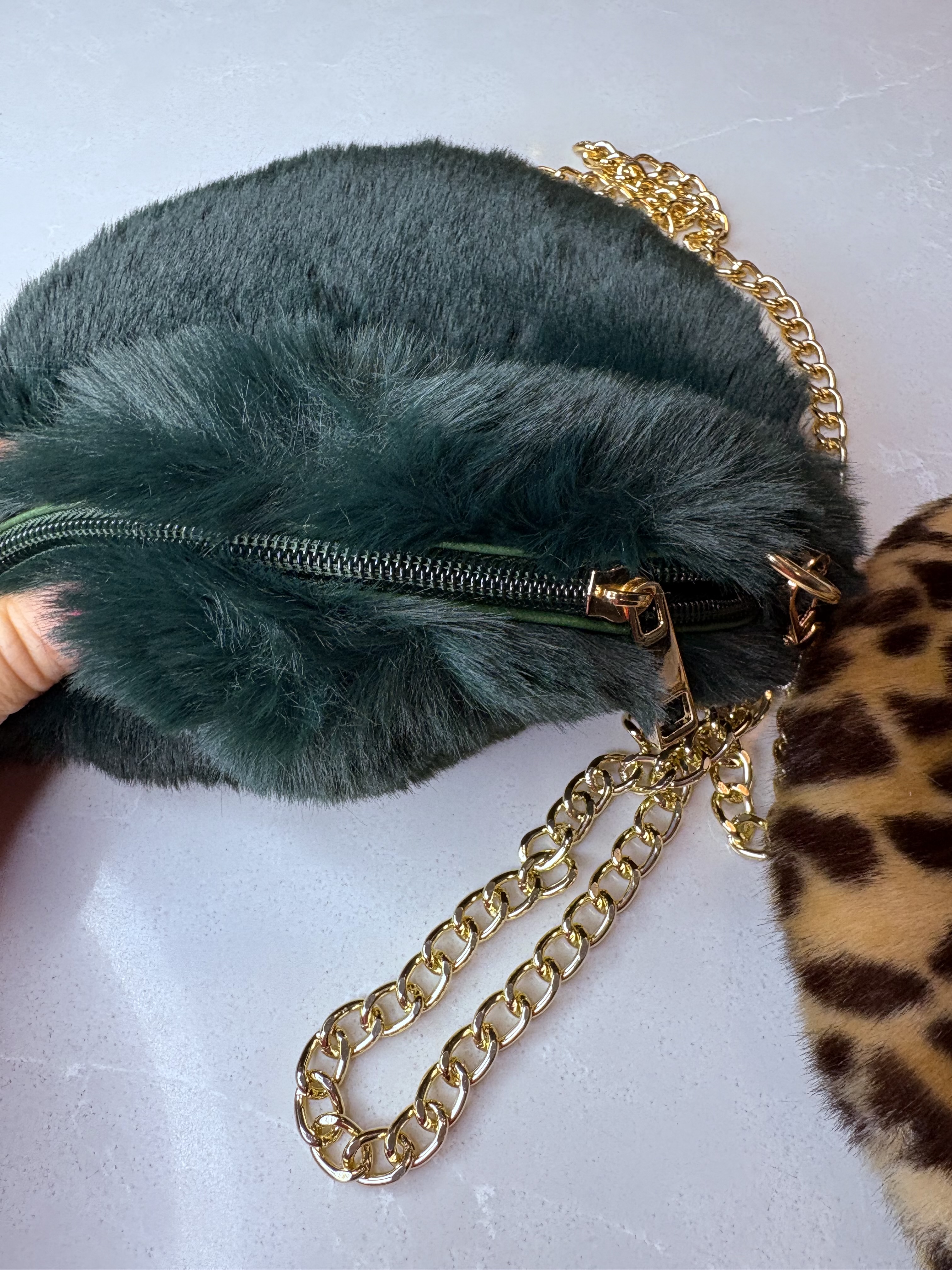 Faux fur bag. long chain strap and zip closure. :Perfect for a night out and would fit your phone, keys, purse and defo a galaxy ripple!