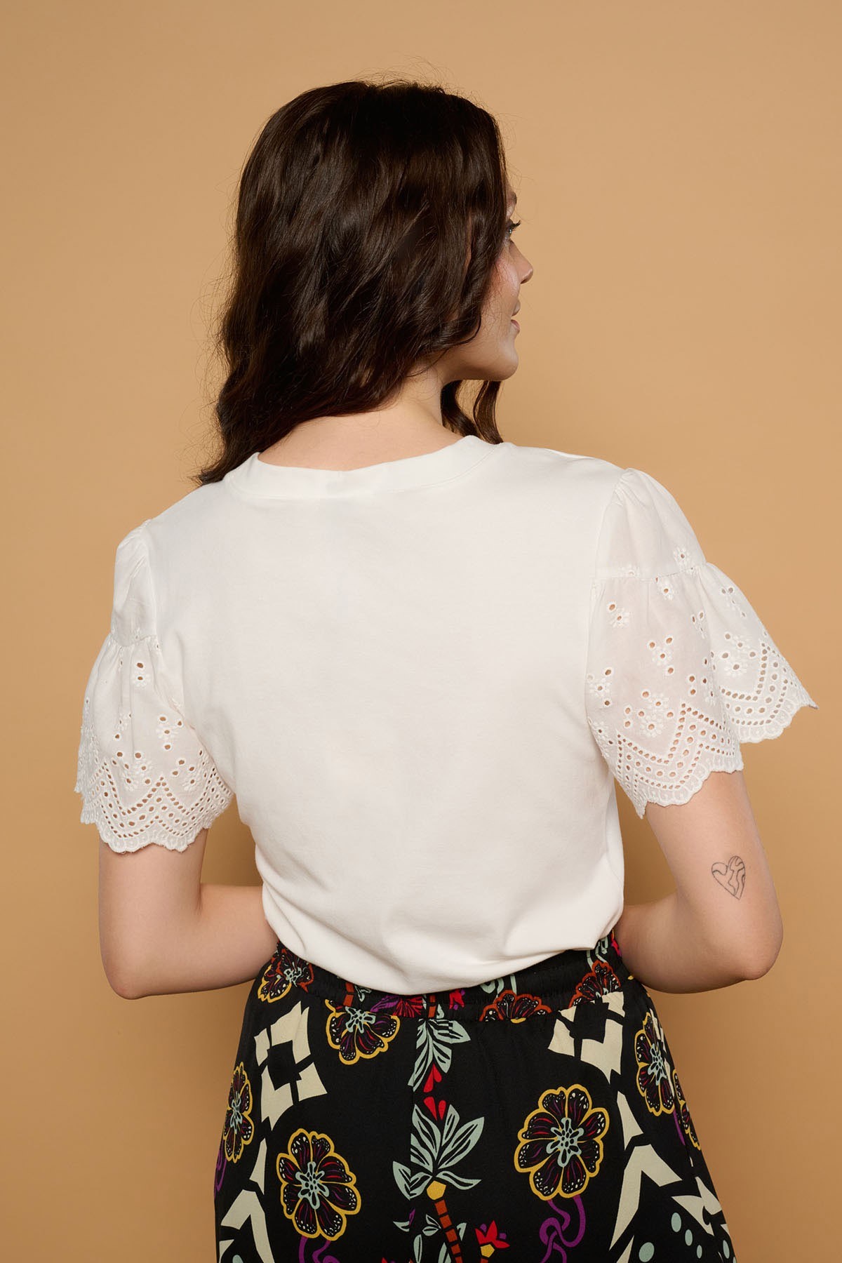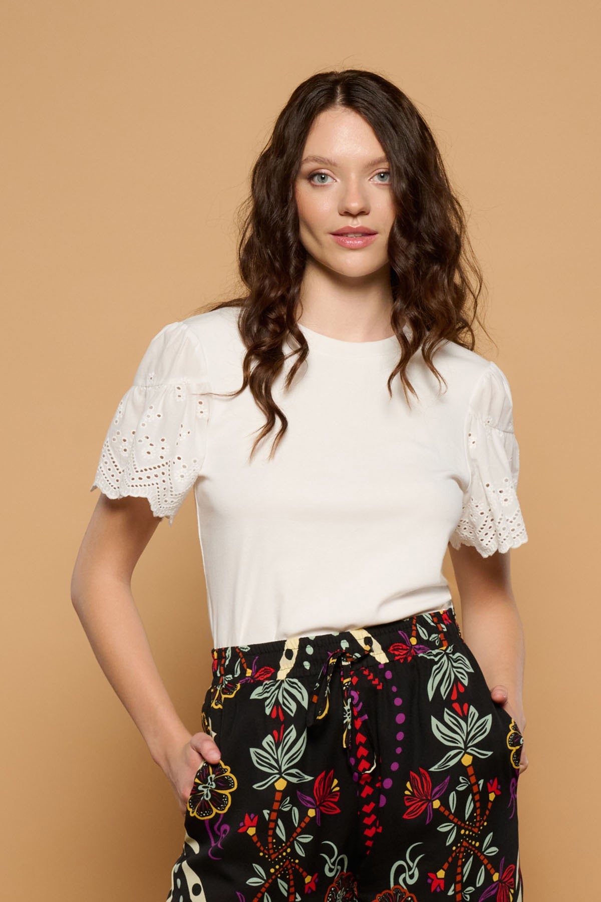 Round-neck T-shirt with short flared sleeves. Openwork embroidery detail and scalloped finish on the sleeves. Stretch cotton blend body and 100% cotton sleeves.