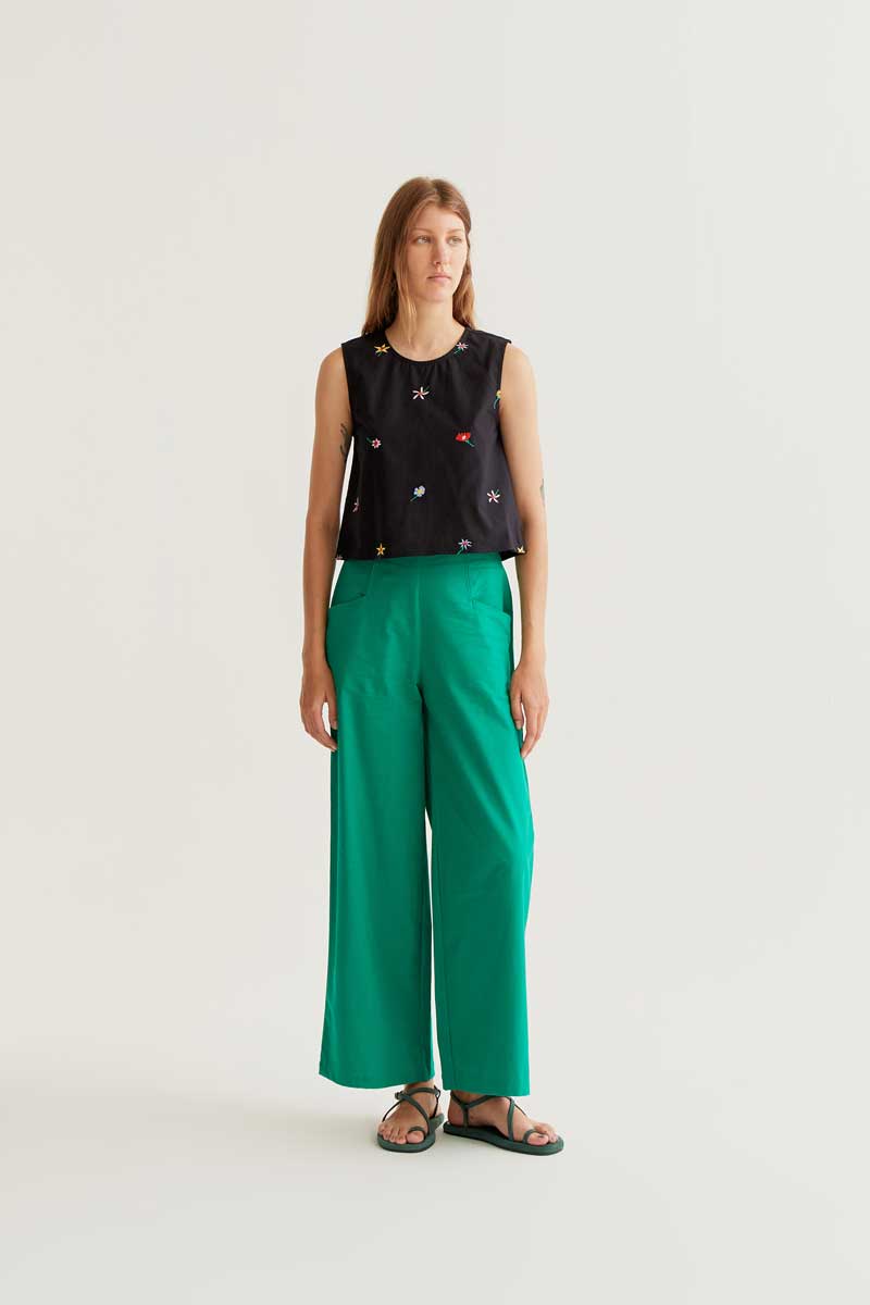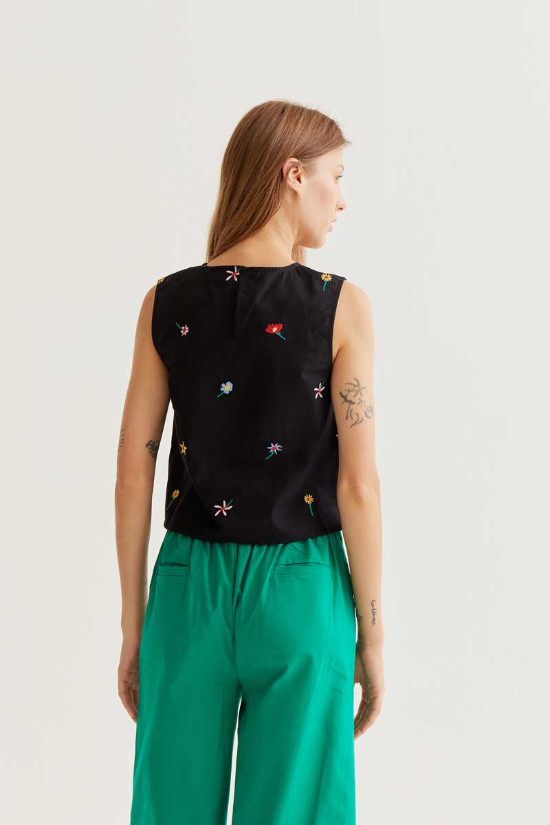 100% cotton top with a black gardener flowers print. Round neck and sleeveless. Concealed button closure at the back. The model is 177 cm tall and wears size S.
