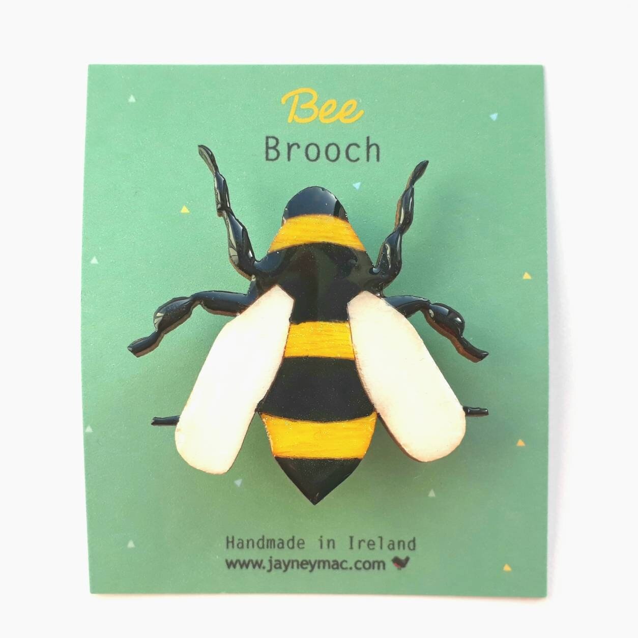This is a listing for a handpainted lasercut wooden bee brooch. It is 45mm x 45mm in size and is sealed with a resin glaze. It is secured with a silver plated brooch pin at the back.