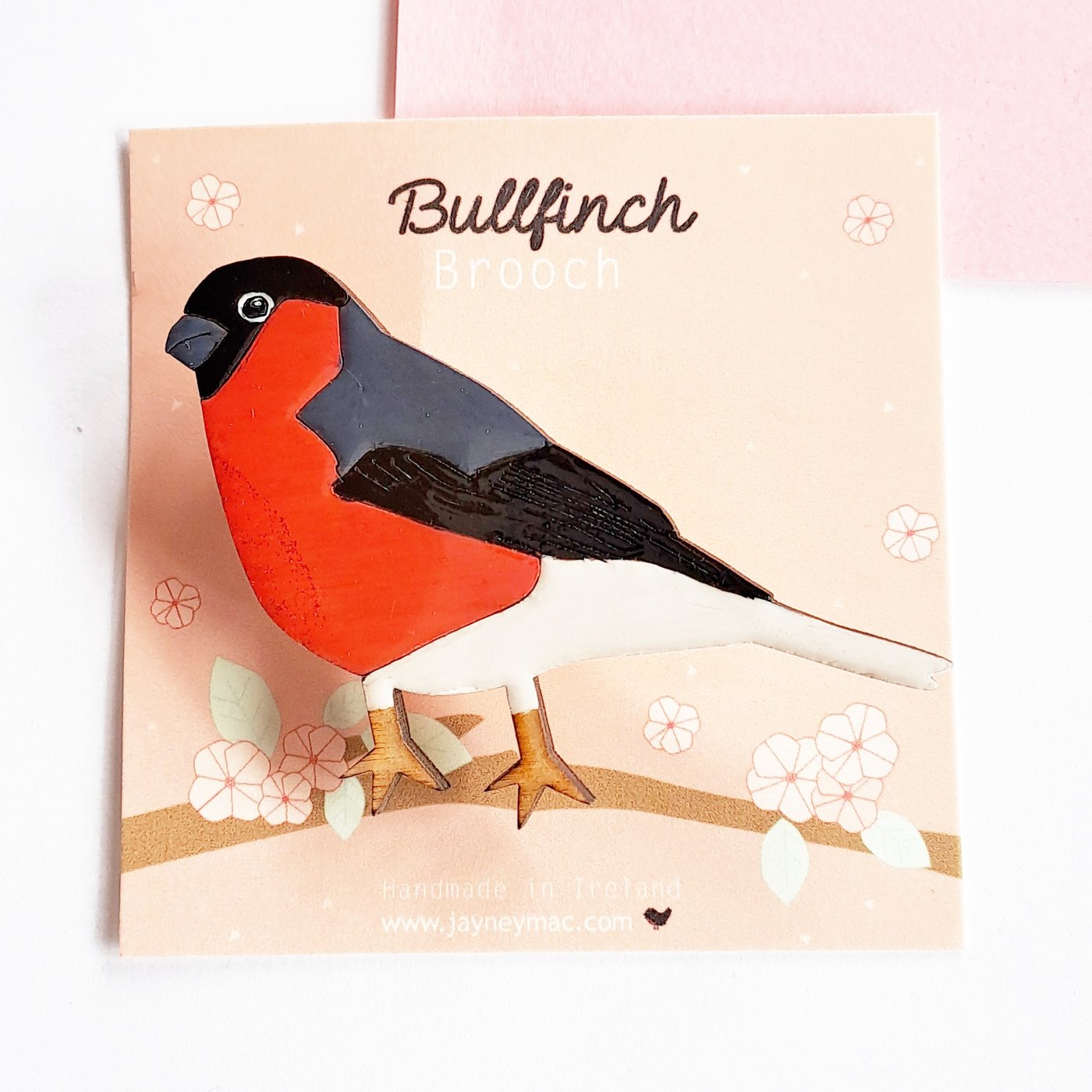 This is a wooden bullfinch bird brooch. It is made of lasercut birch plywood and is hand-painted and has added red glitter on the breast. It is coated with a clear resin glaze. It is secured with a silver plated metal brooch pin at the back. It is approx 70mm x 50mm in size. It would make a perfect gift for any bird lover.