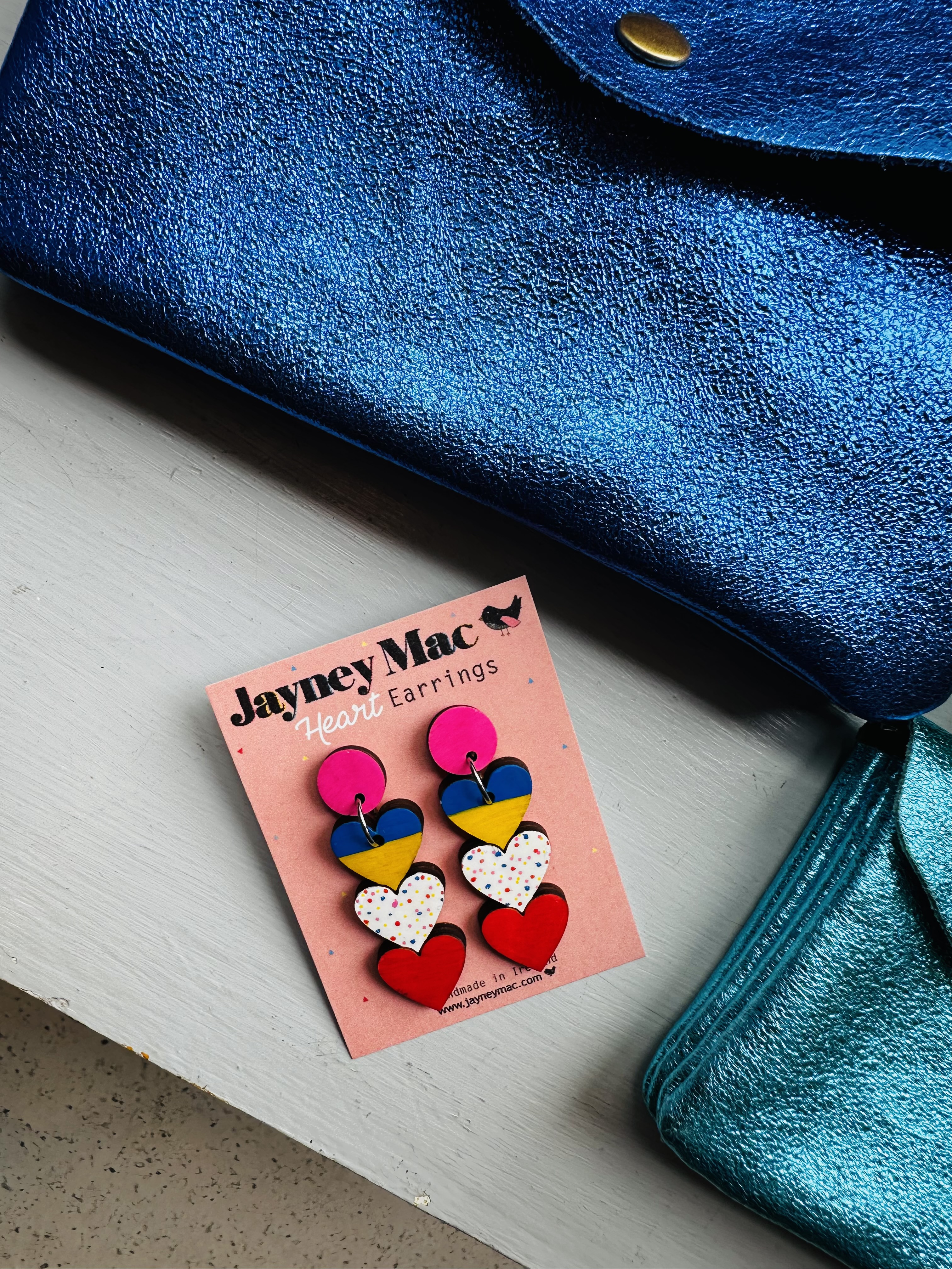 These are hand painted laser cut wooden triangle dangle earrings. They are hand painted with a striped pattern and block colours and are coated with a clear resin glaze. Each one is approx 50mm x 25mm in size. At the back there is a stainless steel earring post which secures with a butterfly clasp at the back.