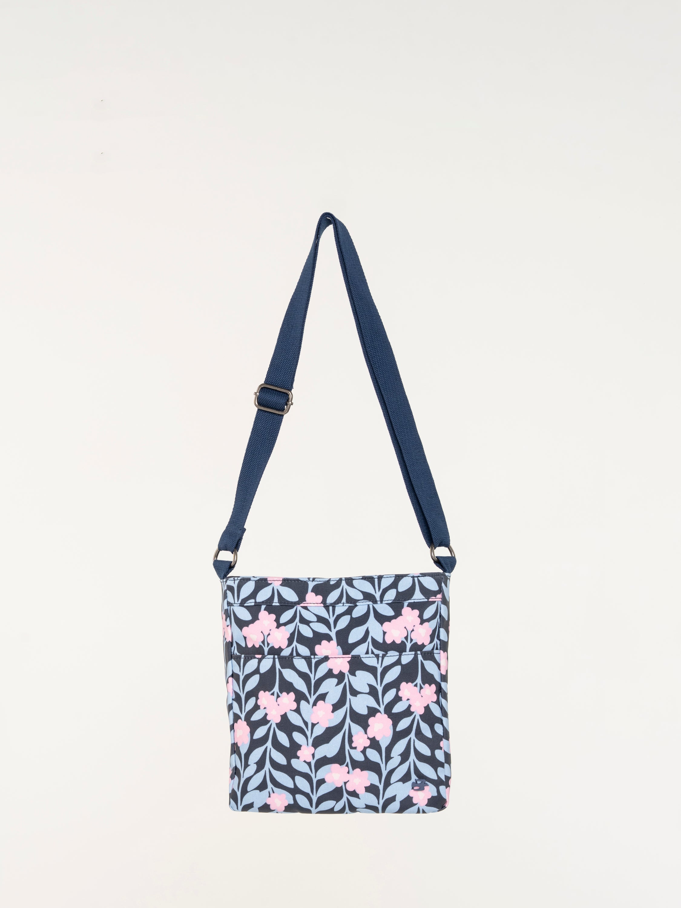 Made from heavy weight coated cotton canvas in our in house designed "midnight vine print"combined with silver coloured hardwear and a textured navy adjustable strap. Our Midnight vine cross body bag is the perfect bag and size for everyday use, it has plenty of pockets to store your valuable items and zip pockets to keep them secure. Finished with a anti brass metal "Brakeburn branded bird"and pop blue zip pulls.