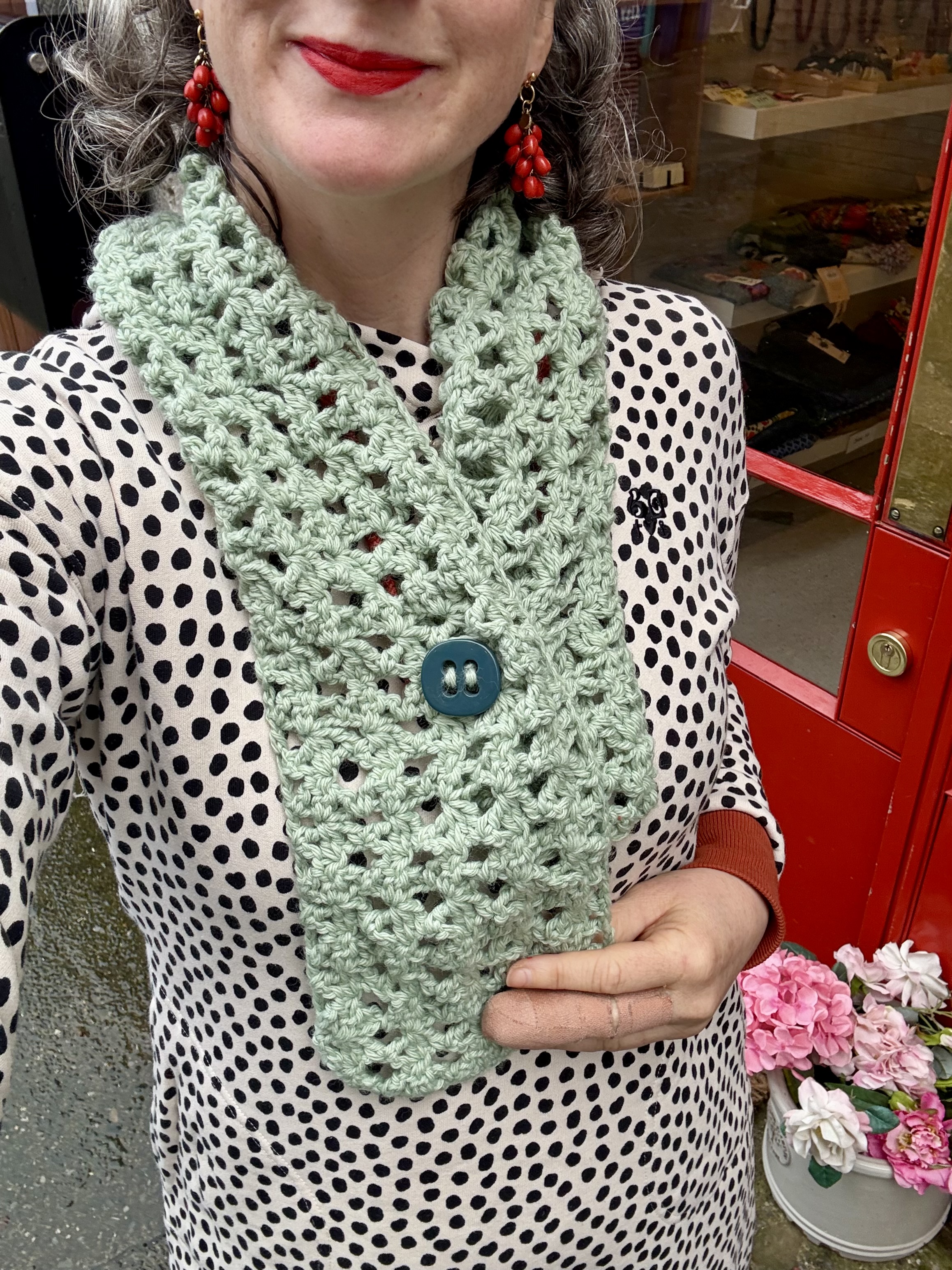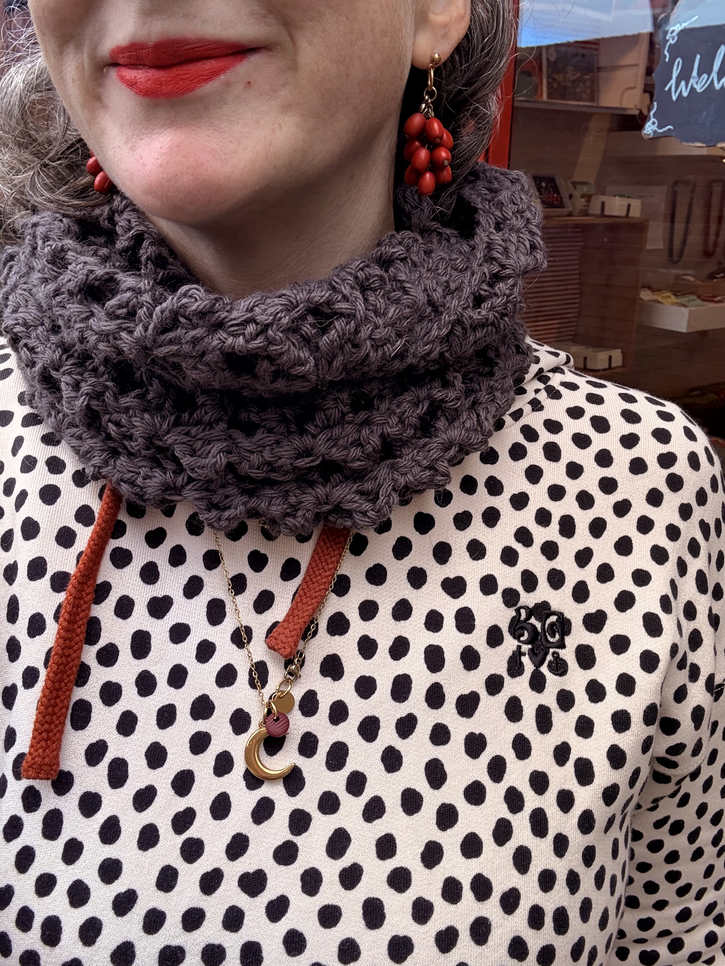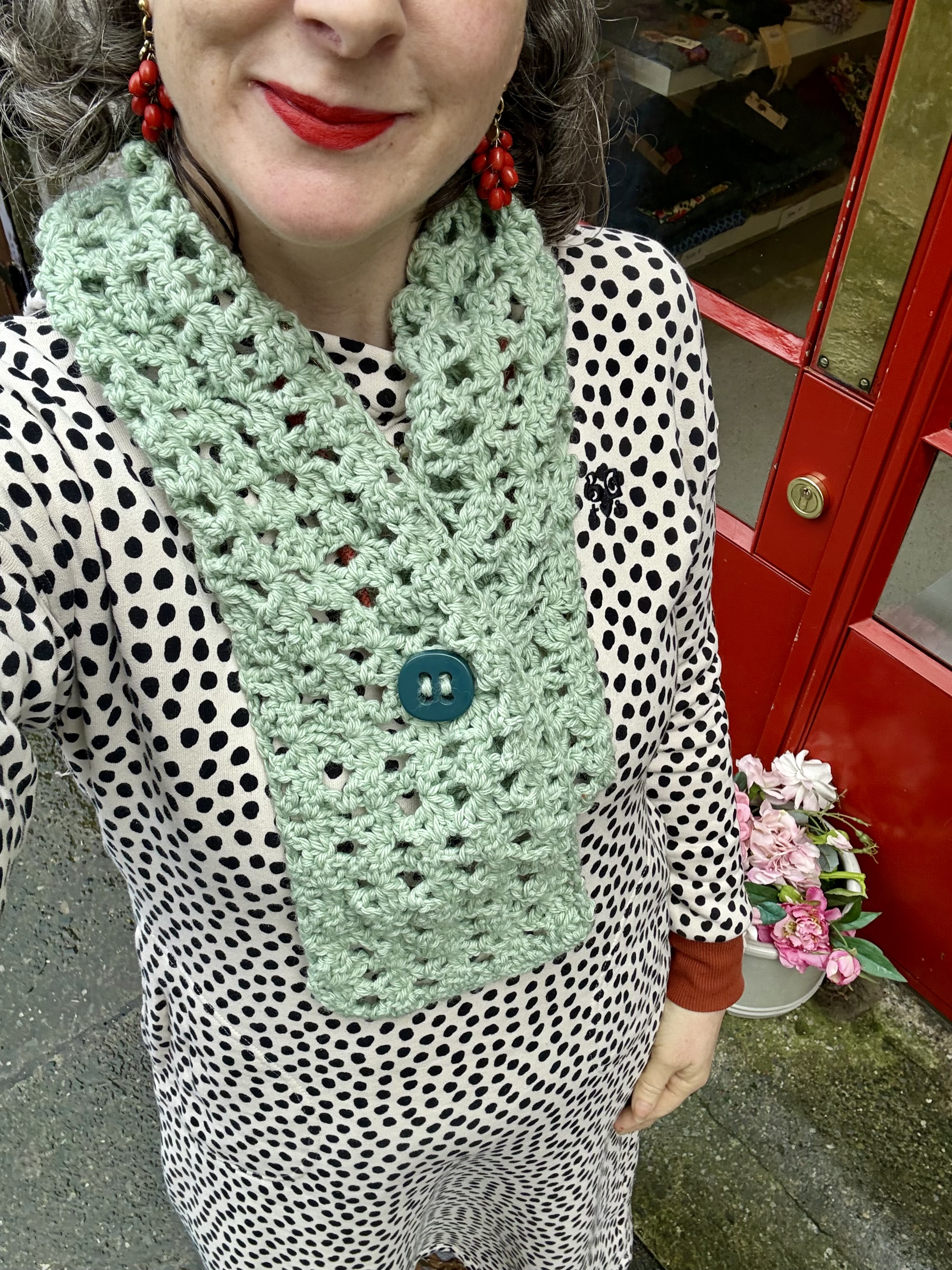 Cute easy to wear crochet scarf/snood, made by my Mum, Eileen. She loves to crochet in the evening infront of the cosy open fire, my Dad proabably asleep beside her on the sofa!