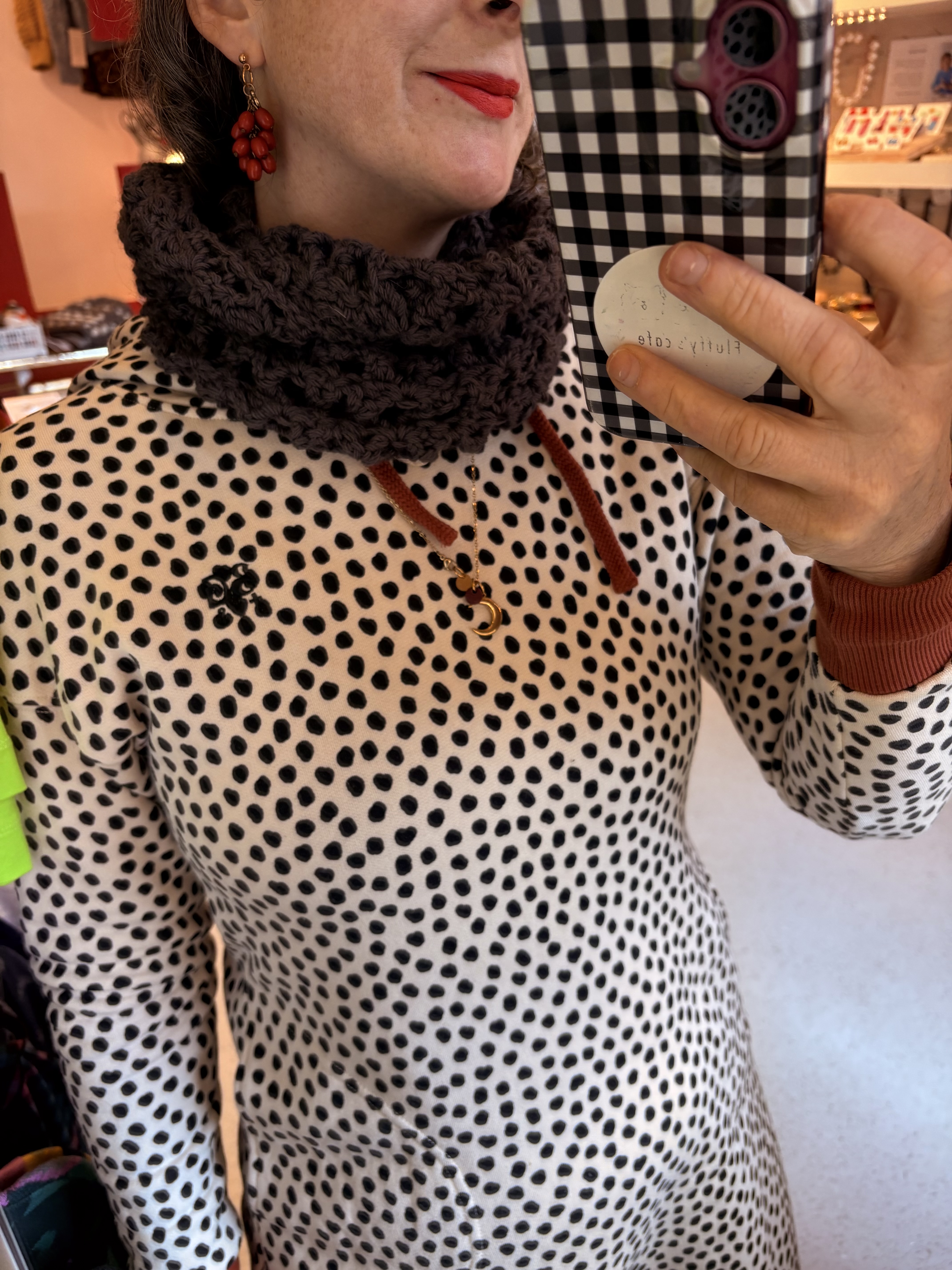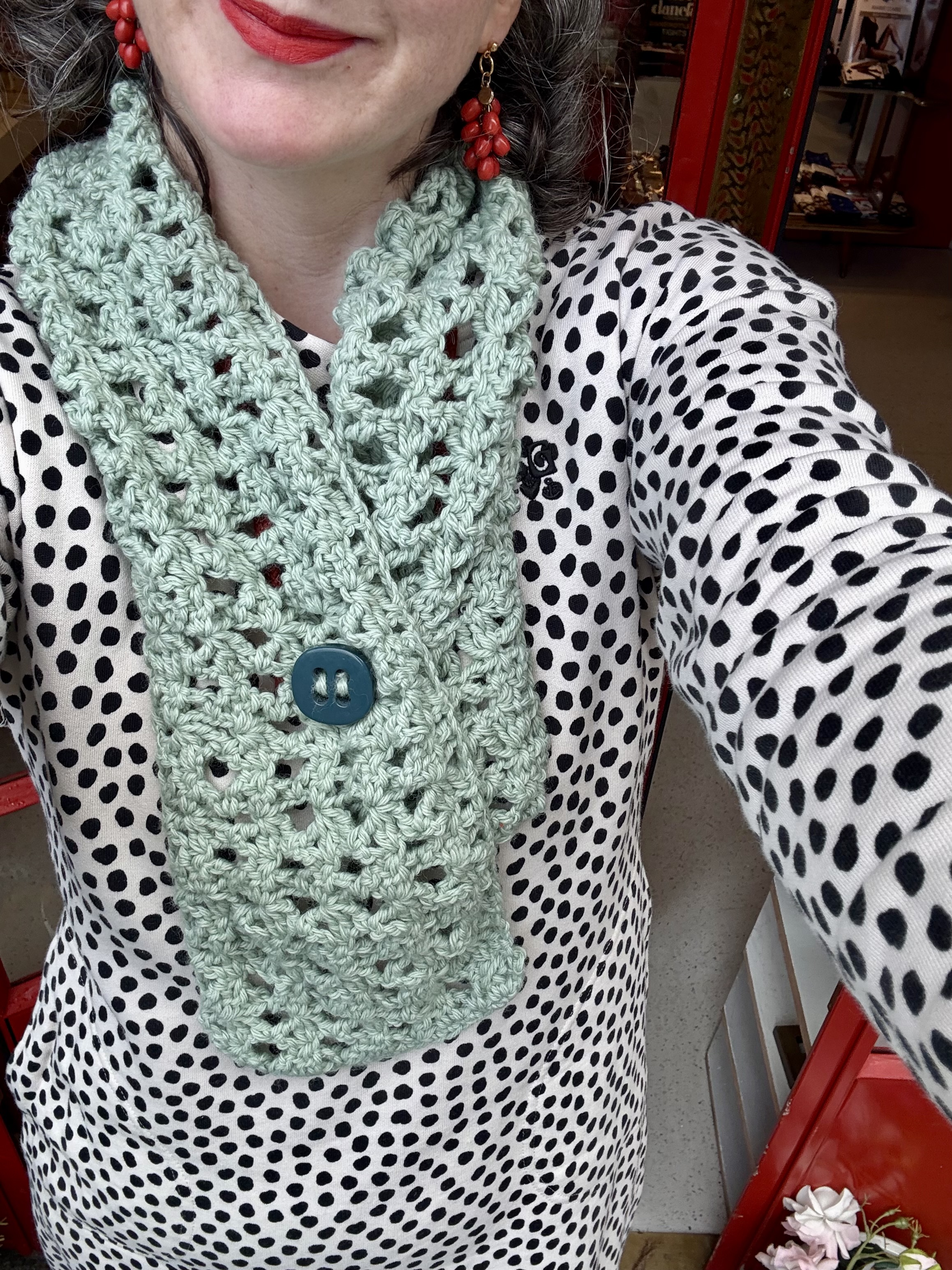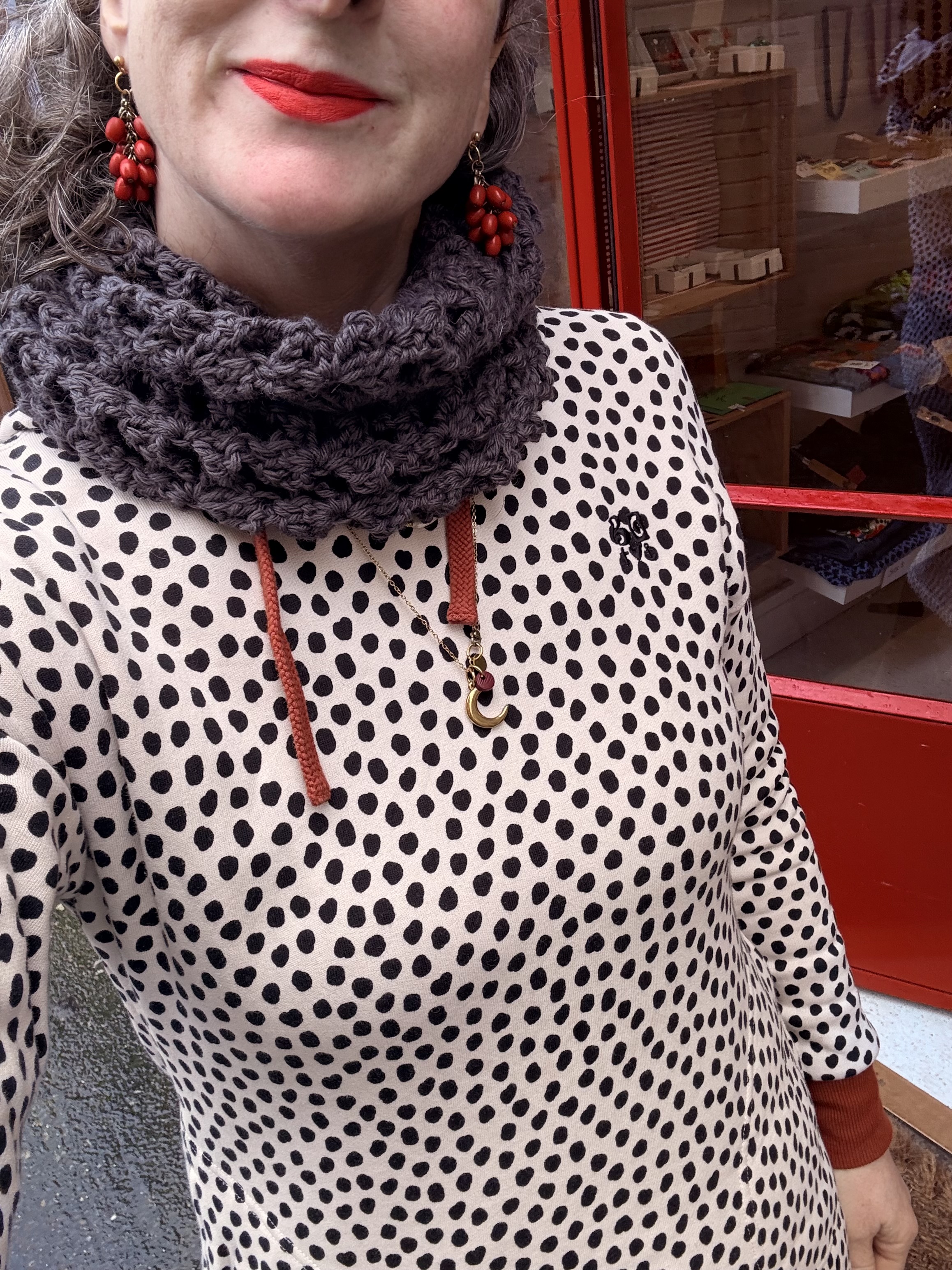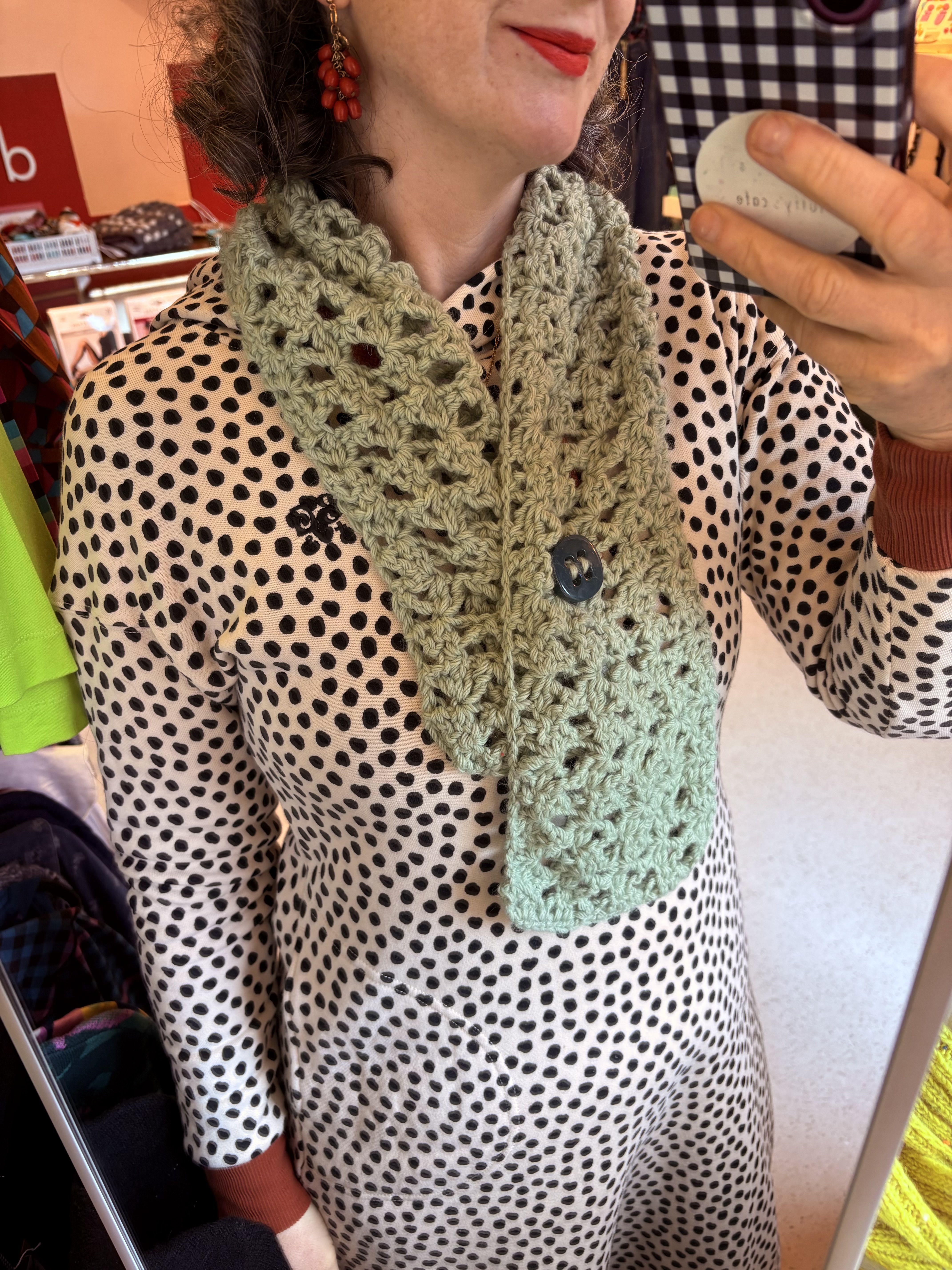 Cute easy to wear crochet scarf/snood, made by my Mum, Eileen. She loves to crochet in the evening infront of the cosy open fire, my Dad proabably asleep beside her on the sofa!