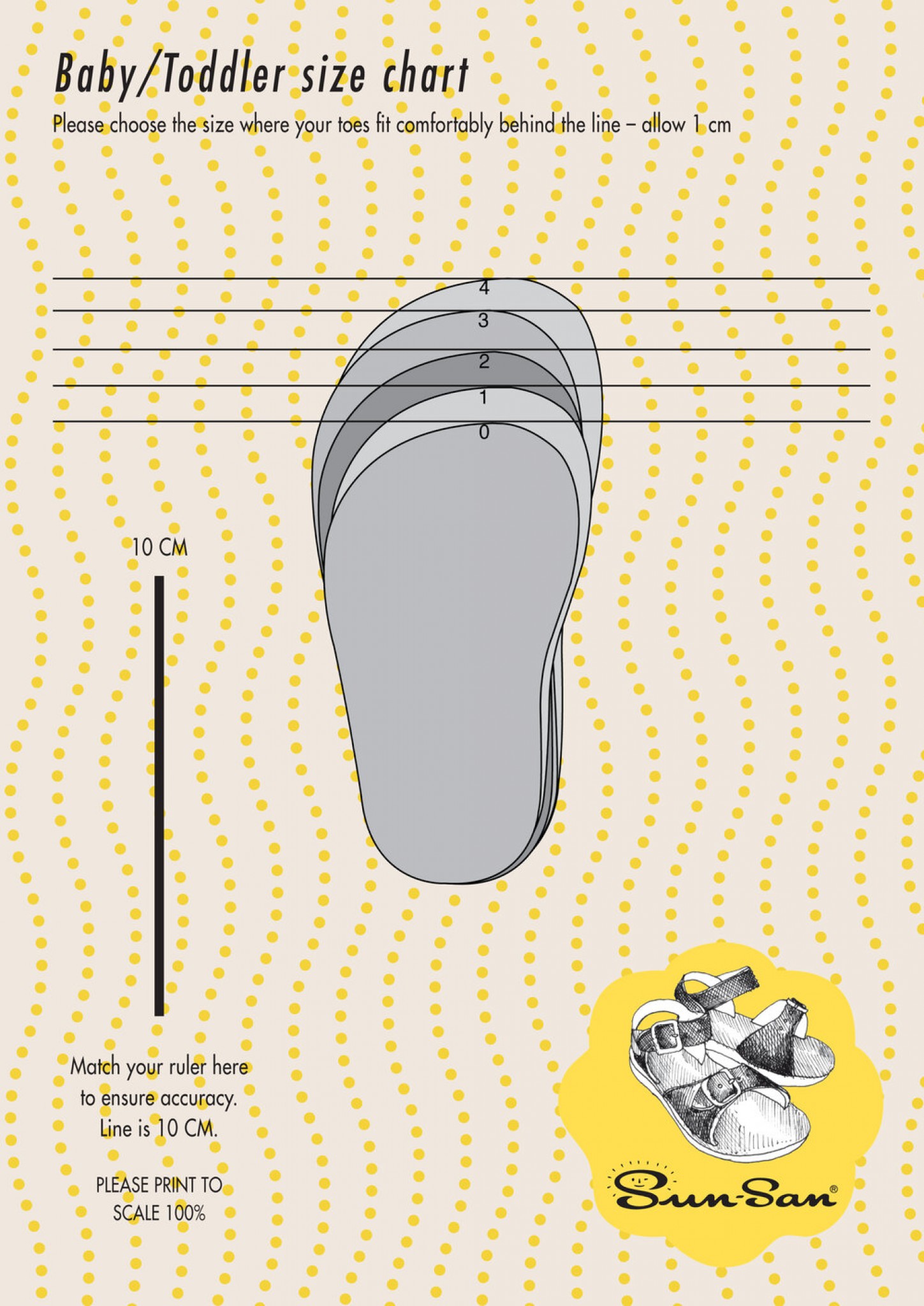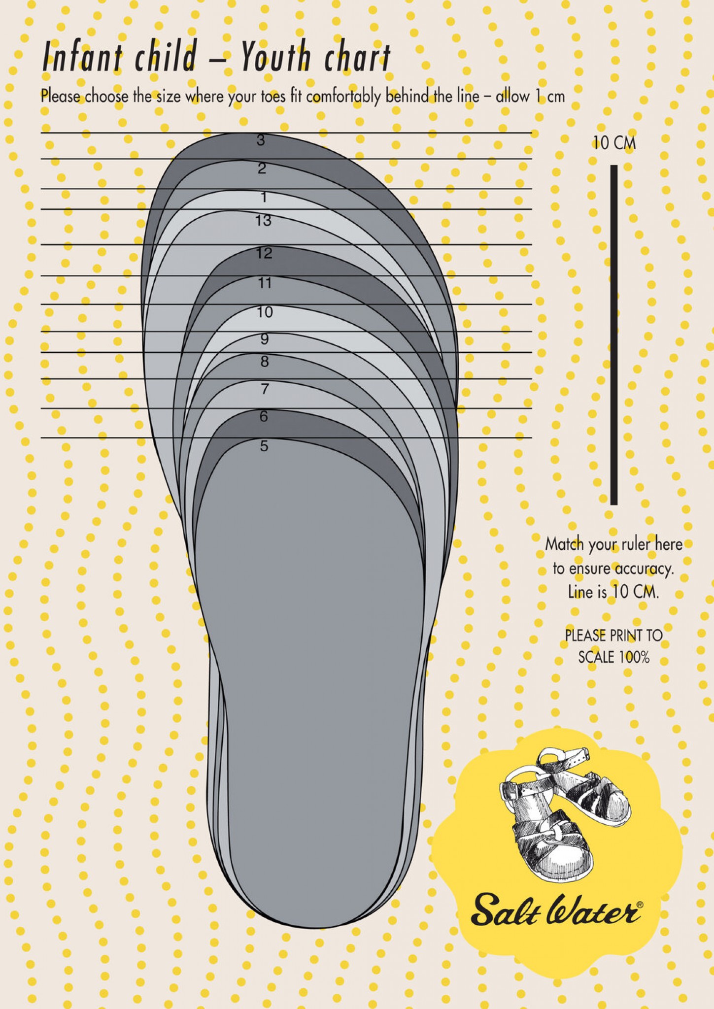 I’ve attached the size chart for you to print out (print to scale). I find kids sizing can be difficult somtimes. I just go by the Saltwater sizing here to keep things simple (SW). I recommend measuring your Childs feet in cm’s and then checking the chart. Even better is to print the chart and put your Childs foot on it. Sizes here go from UK 4 (baby) to UK 2 (youth), Adults start from UK 3 - UK 8.