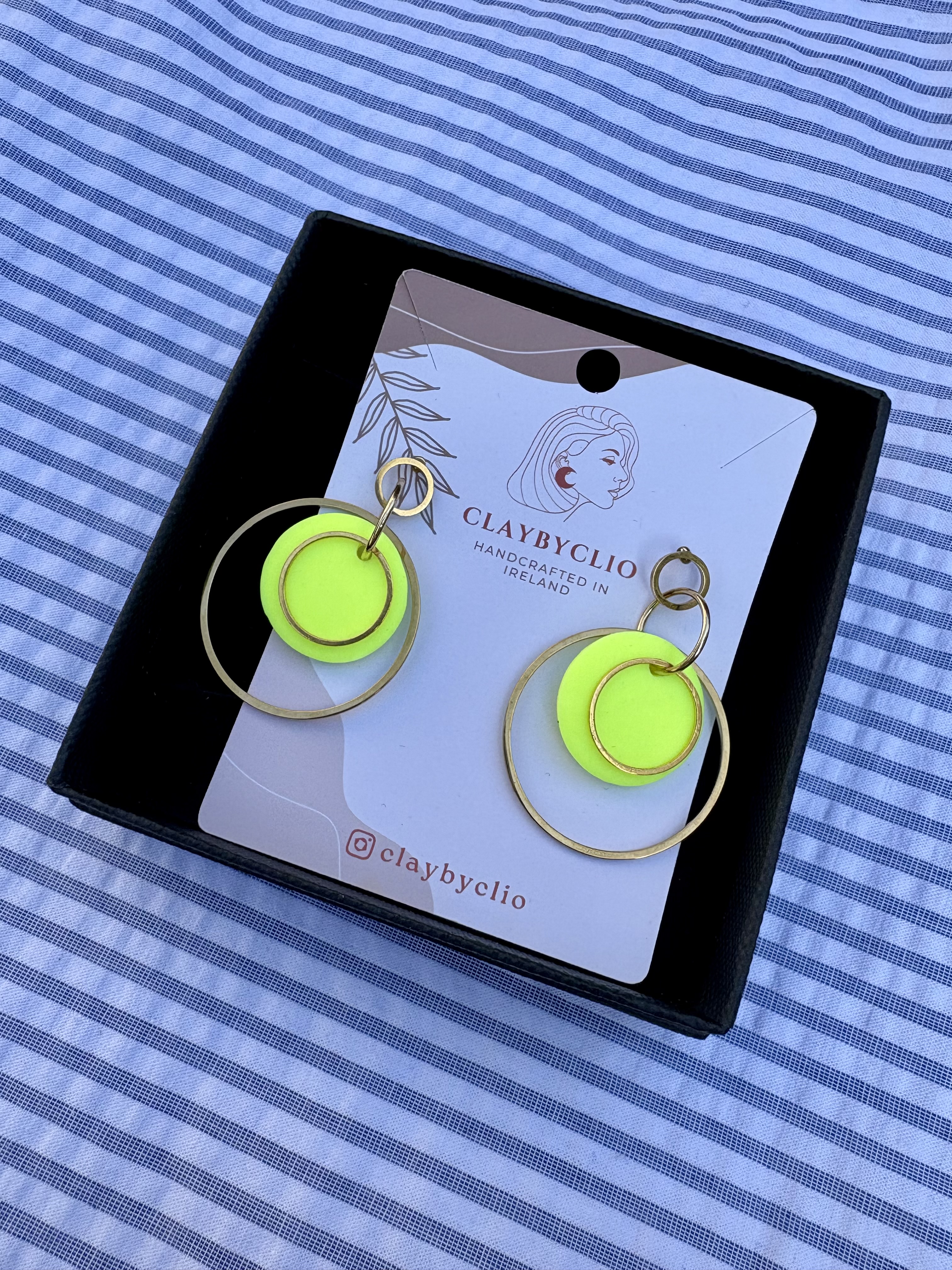 She makes these gorgous earrings in very small batches to keep them unique. Clio works with polymer clay and says to always store them in a box if traveling to protect, never stack or crush. The fixings and findings are all made from stainless steel. Comes in these gorgeous black gift boxes.
